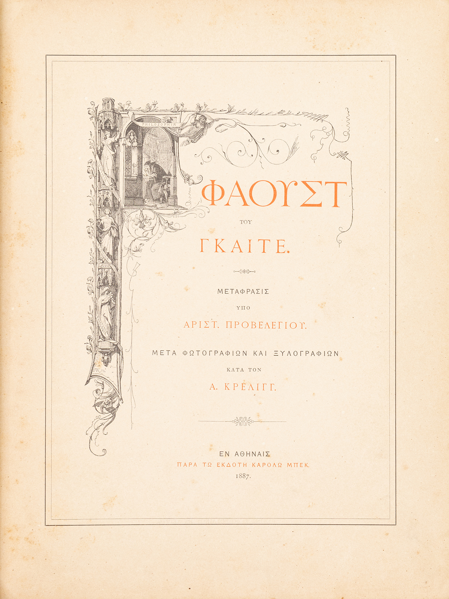 Φάουστ, μετάφρασις ὑπό Ἀριστ. Προβελεγίου, μετά φωτογραφιῶν καί ξυλογραφιῶν κατά τόν Α. Κρέλιγγ.