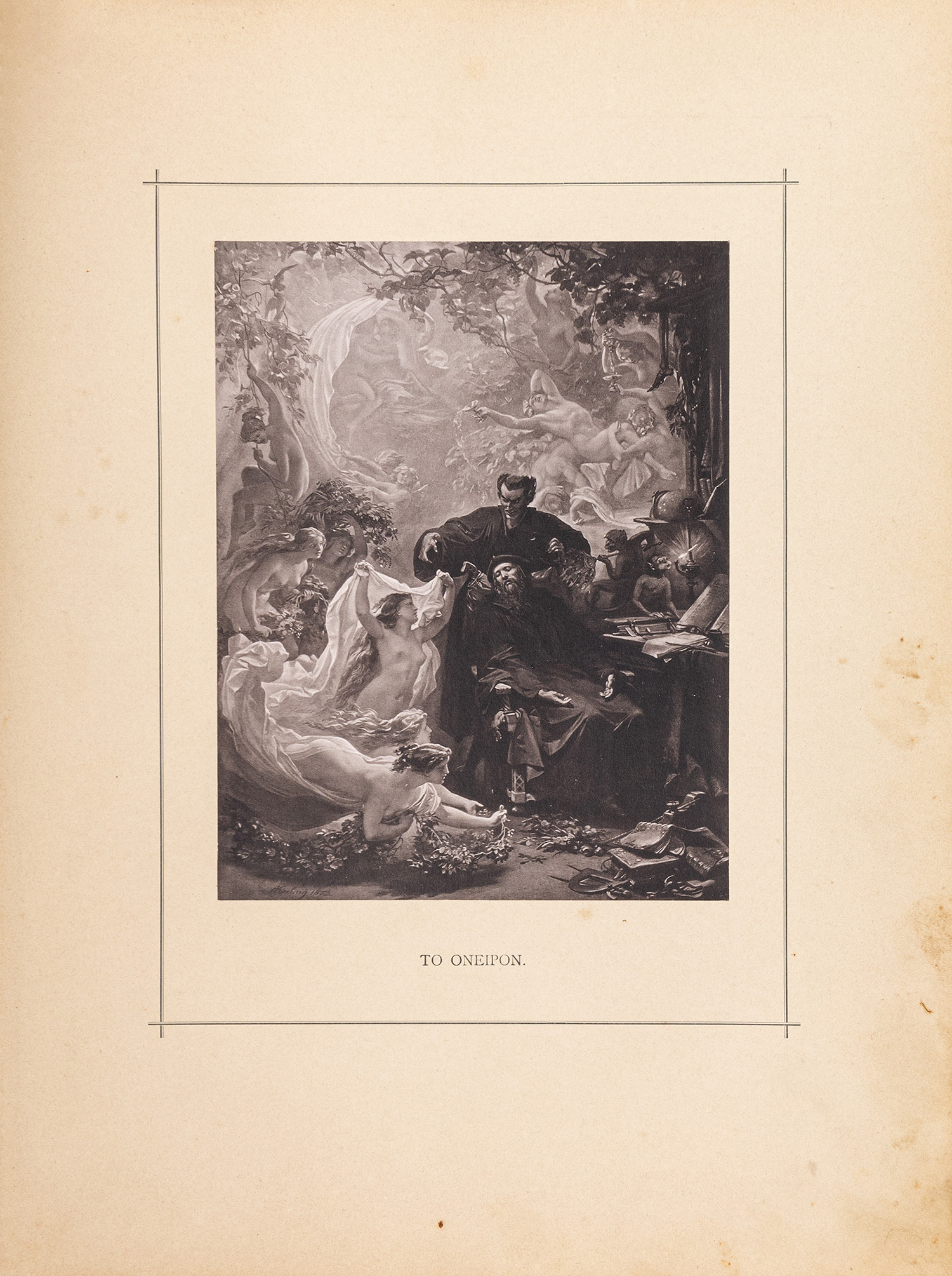 Τιμή εκτίμησης: € 200 - 3004o, 148 σ. (λίγο οξειδωμένο αντίτυπο). Δίχρωμος ο τίτλος, κείμενο σε 2 στήλες και σε τυπογραφικό πλαίσιο, με 14 αναπαραγωγές έργων επικολλημένες σε ισάριθμα φύλλα εκτός κειμένου και ξυλογραφίες εντός. Αρχική πάνινη βιβλιοδεσία (μικρές φθορές, εμπίεστη διακόσμηση με χρυσό και μαύρο χρώμα (στο κάτω κάλυμμα μόνο με μαύρο), χρυσωμένες οι ακμές). Ηλιού & Πολέμη, 1887.873, Κασίνης, Ι, 2474.