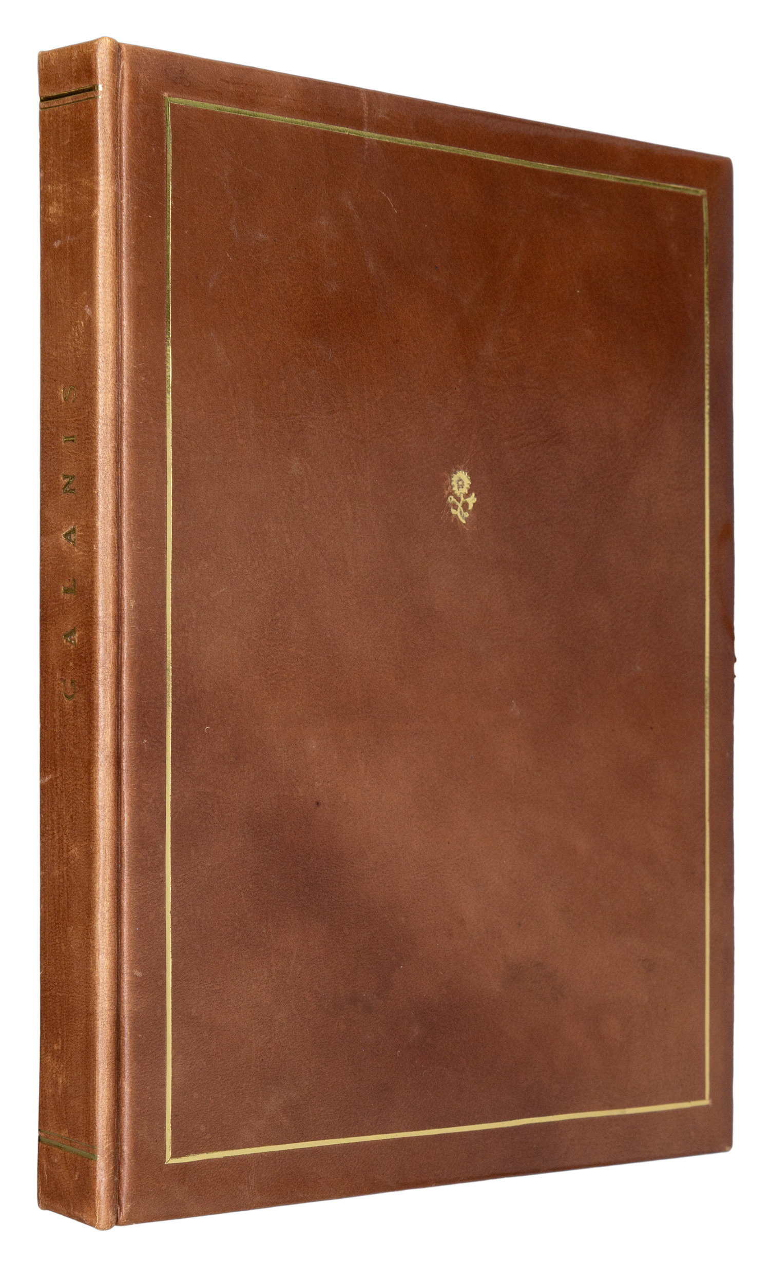 Τιμή εκτίμησης: € 200 - 30051 σ. Έκδοση περιορισμένη σε 150 αριθμημένα αντίτυπα, με μία ολοσέλιδη οξυγραφία (L’enfant au cheval mécanique, 1920), μία ολοσέλιδη ξυλογραφία και ξυλόγραφες βινιέτες του Δημητρίου ΓΑΛΑΝΗ, καθώς και μία ολοσέλιδη οξυγραφία του Jean-Gabriel DARAGNÈS. Αρχικά εξώφυλλα (οξειδωμένα, μικρές φθορές, αξάκριστο), τοποθετημένο σε πολυτελές δερμάτινο portfolio (χρυσή διακόσμηση, το όνομα του χαράκτη με χρυσό στη ράχη: «GALANIS»). Γαλάνης (Εικονογραφημένα) 1949/1.