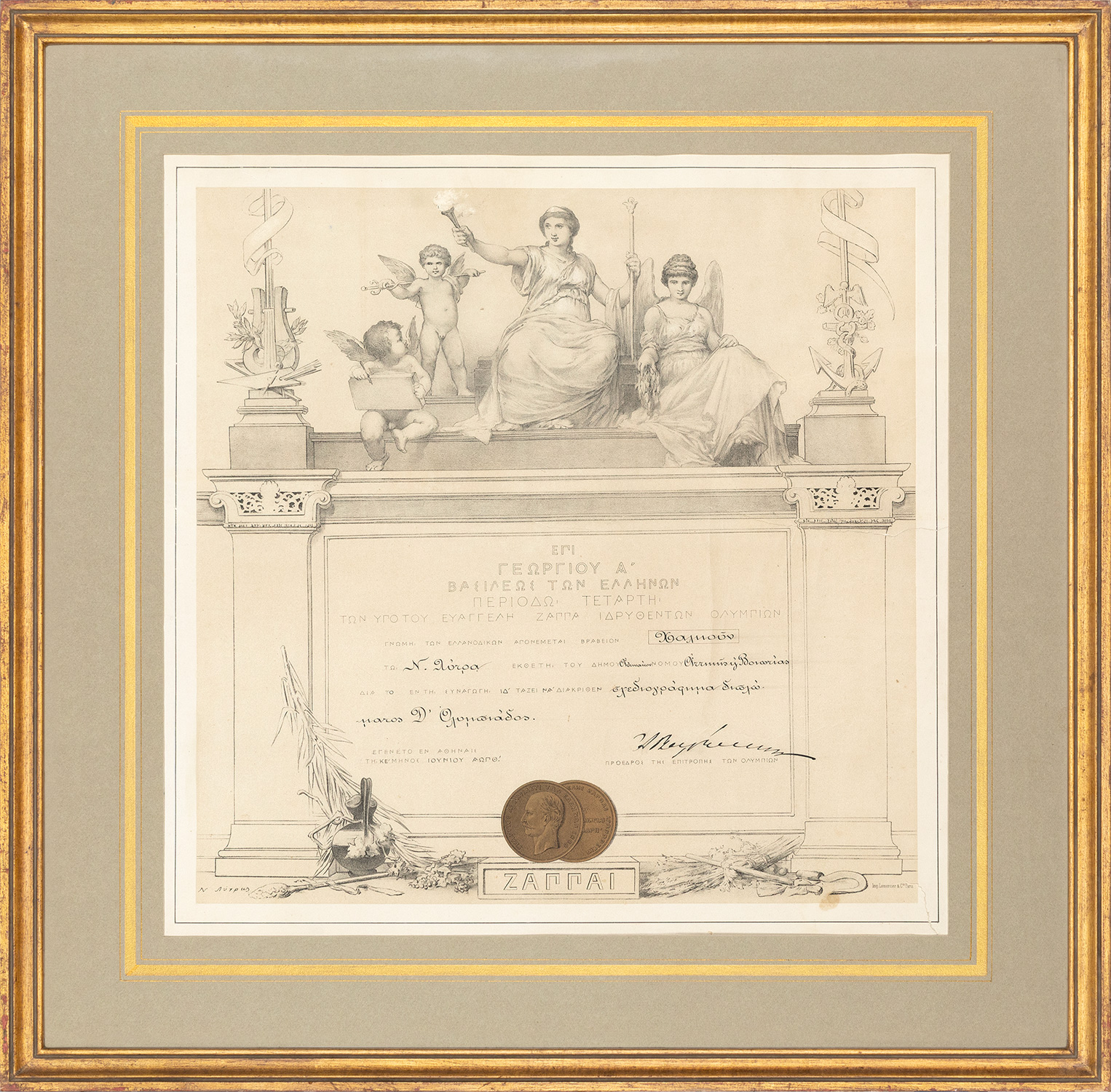 Δ´ ΟΛΥΜΠΙΑ 1888 — ΛΥΤΡΑΣ, Νικηφόρος. ΕΠΙ ΓΕΩΡΓΙΟΥ Α´ ΒΑΣΙΛΕΩΣ ΤΩΝ ΕΛΛΗΝΩΝ, ΠΕΡΙΟΔῼ ΤΕΤΑΡΤῌ ΤΩΝ ΥΠΟ ΤΟΥ ΕΥΑΓΓΕΛΗ ΖΑΠΠΑ ΙΔΡΥΘΕΝΤΩΝ ΟΛΥΜΠΙΩΝ, ΓΝΩΜῌ ΤΩΝ ΕΛΛΑΝΟΔΙΚΩΝ ΑΠΟΝΕΜΕΤΑΙ ΒΡΑΒΕΙΟΝ [Χαλκοῦν] Τῼ[Ν. Λύτρᾳ] ΕΚΘΕΤῌ ΤΟΥ ΔΗΜΟΥ [Ἀθηναίων] ΝΟΜΟΥ [Ἀττικῆς καί Βοιωτίας] ΔΙΑ Τ[Ο] ΕΝ Τῌ ΣΥΝΑΓΩΓῌ [ΙΔ´] ΤΑΞΕΙ [ΝΑ´] ΔΙΑΚΡΙΘΕ[Ν σχεδιογράφημα διπλώματος Δ´ Ὀλυμπιάδος]. ΕΓΕΝΕΤΟ ΕΝ ΑΘΗΝΑΙΣ Τῌ [ΚΕ´] ΜΗΝΟΣ [ΙΟΥΝΙΟΥ ΑΩΠΘ´] [Ἀ. Βαλέττας] ΠΡΟΕΔΡΟΣ ΤΗΣ ΕΠΙΤΡΟΠΗΣ ΤΩΝ ΟΛΥΜΠΙΩΝ.