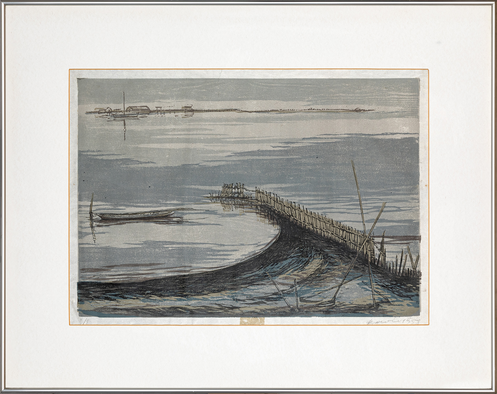 Τιμή εκτίμησης: € 600 - 800Έγχρωμη ξυλογραφία σε πλάγιο ξύλο, 345 x 500 mm. (σχίσιμο π. 50 mm. πάνω στο μέσο, μικρές τομές στις δύο πάνω γωνίες κατά μήκος του περιθωρίου, ίχνος από σελοτέιπ στο κάτω περιθώριο). Έκδοση σε 8 αντίτυπα, αρίθμηση, υπογραφή και χρονολογία στο κάτω περιθώριο με μολύβι. Σε κορνίζα.