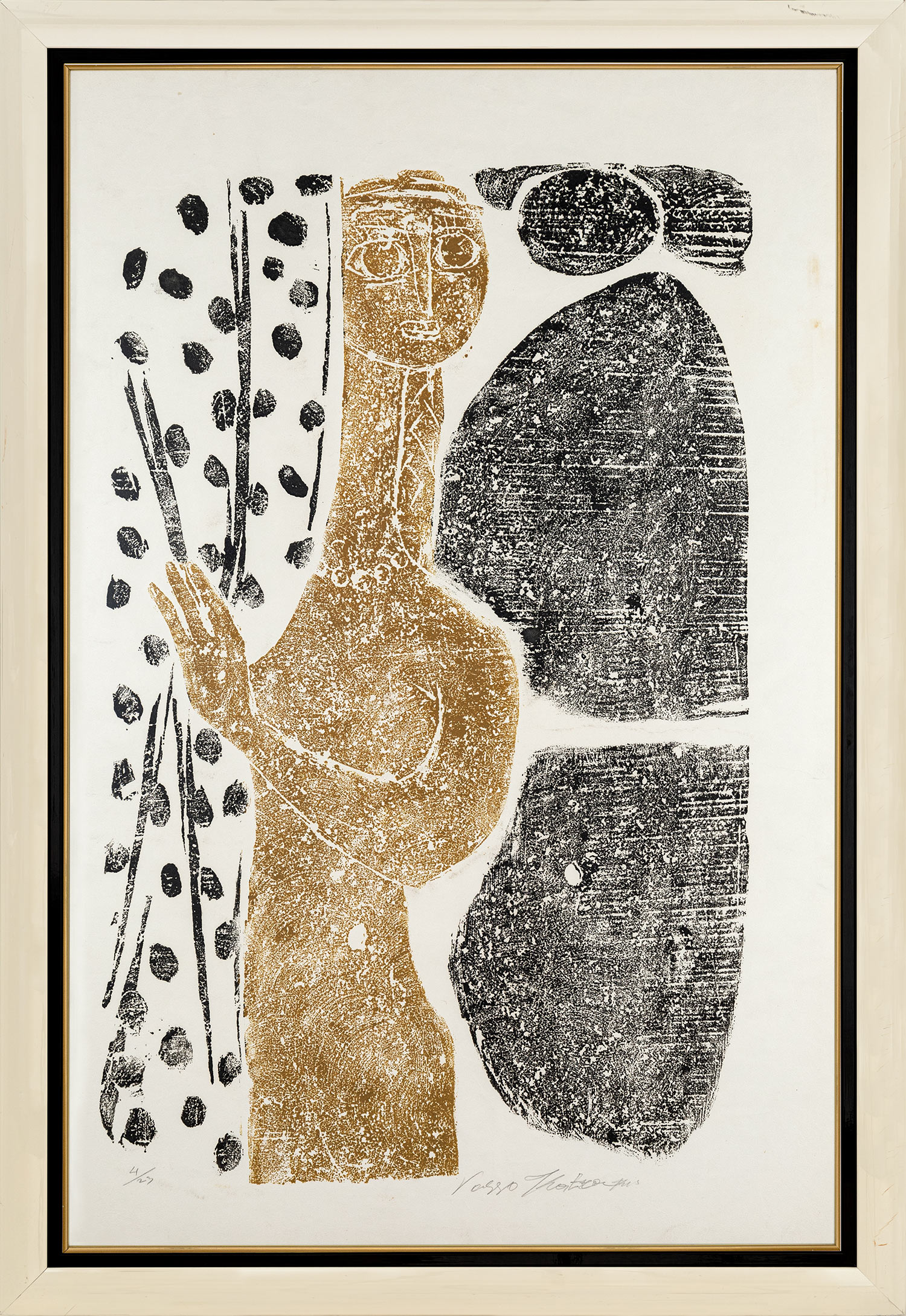 Χάραγμα σε πέτρα (έγχρωμο), 825 x 540 mm. Έκδοση σε 23 αντίτυπα, αρίθμηση και υπογραφή στο κάτω περιθώριο με μολύβι. Σε κορνίζα.