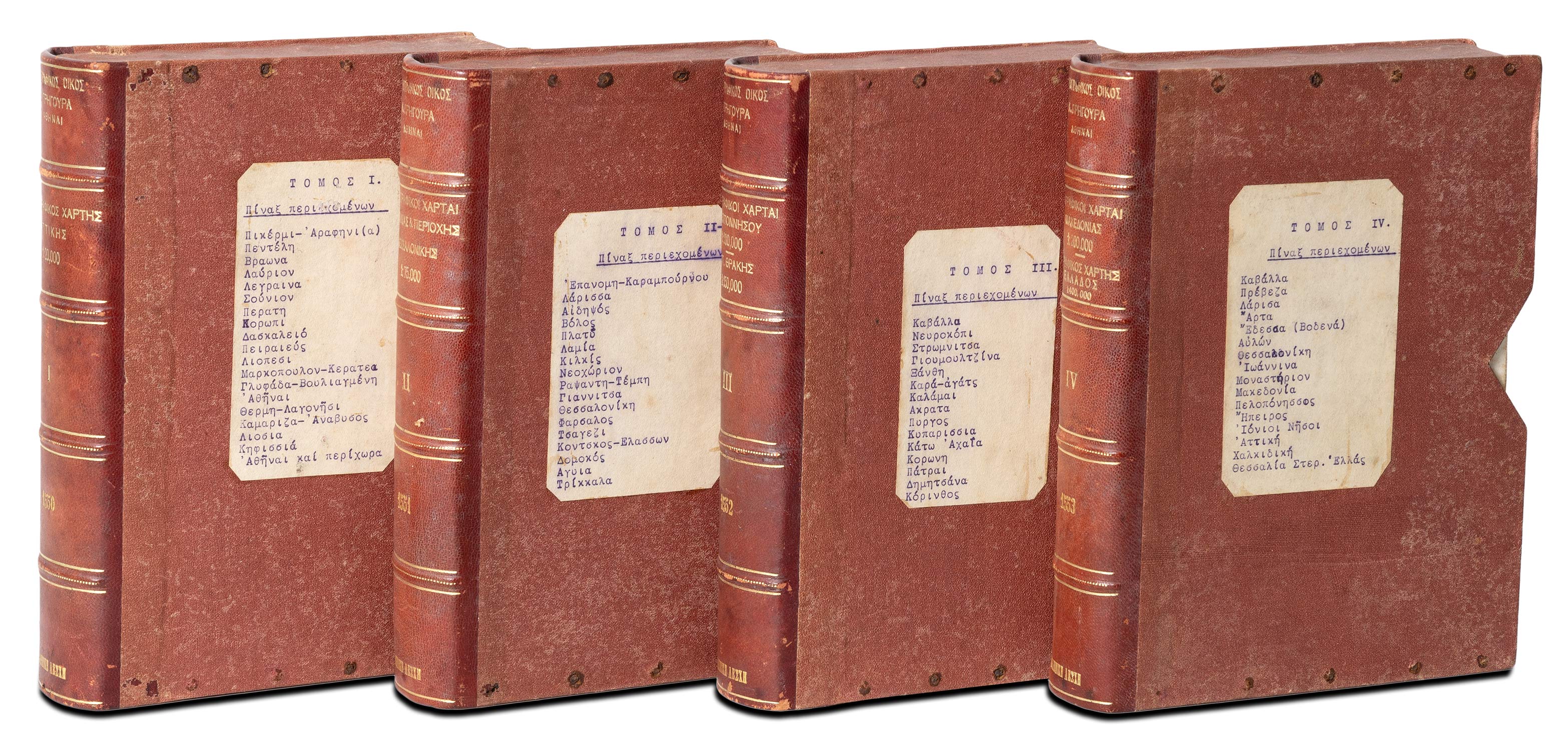 Τιμή εκτίμησης: € 600 - 80067 λιθόγραφοι τοπογραφικοί χάρτες φοδραρισμένοι με πανί, διαστάσεων από 378 x 575 έως 585 x 750 mm., 51 εκ των οποίων έγχρωμοι. (ελαφρά οξειδωμένοι λίγοι χάρτες). Σε 4 θήκες με δερμάτινη ράχη και πανί στα καλύμματα (στις ράχες: «Χαρτογραφικός Οἶκος Κ. Γρηγουρά», μικρές φθορές). (4)