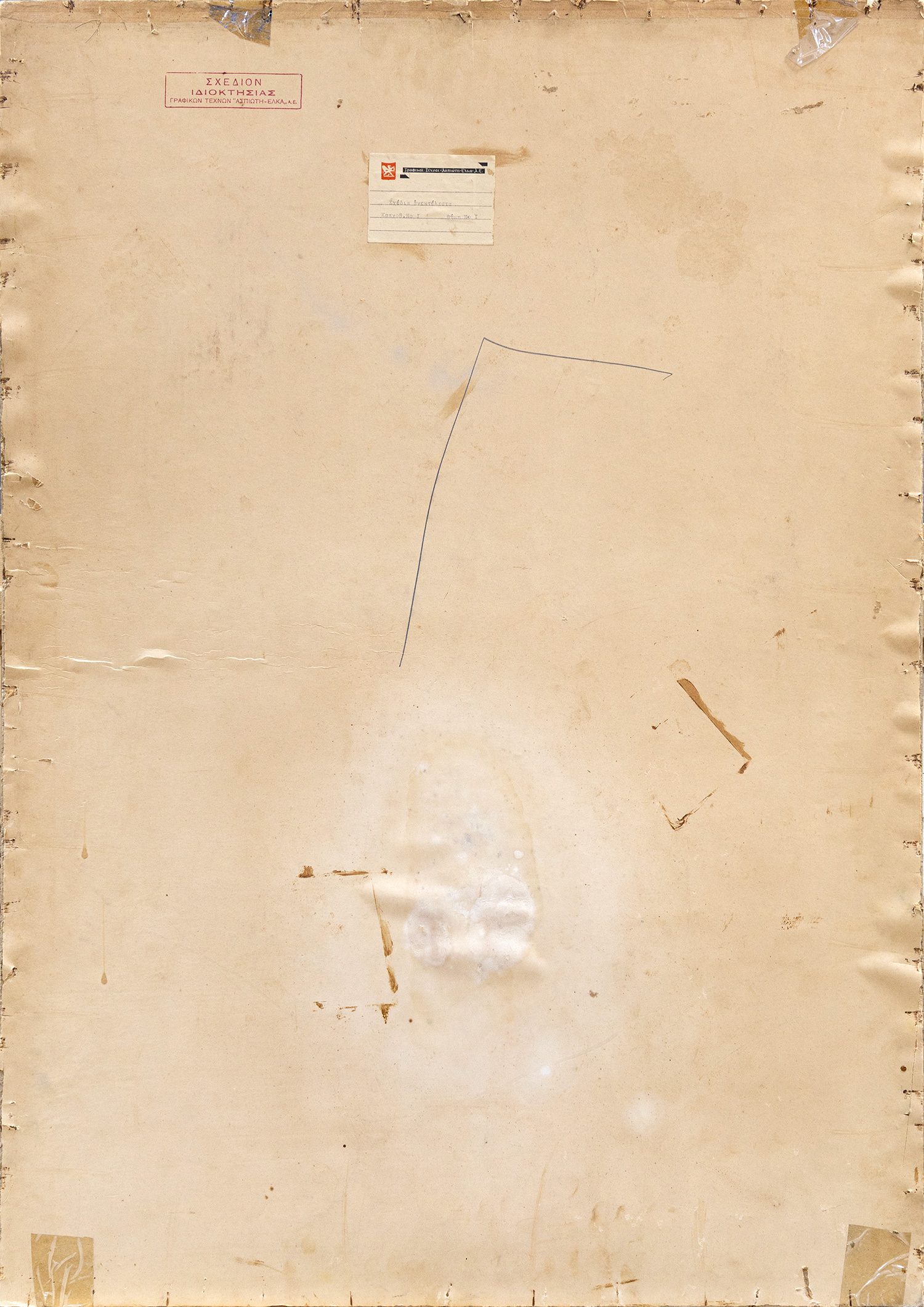 Τιμή εκτίμησης: € 800 - 1.200Γκουάς σε hardboard, 990 x 463 mm. Σφραγίδα και επικολλημένη χάρτινη ετικέτα της εταιρείας Ασπιώτη-ΕΛΚΑ στην πίσω όψη («Σχέδια ἀνεκτέλεστα»).