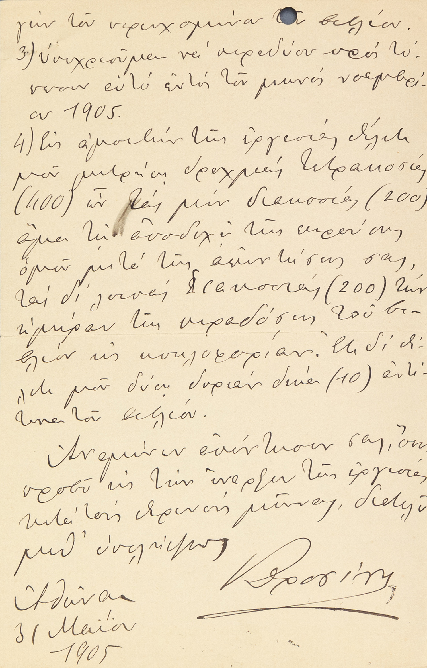 Τιμή εκτίμησης: € 200 - 3002, 1, 3 και 2 σ., από 182 x 110 έως 236 x 138 mm. (δύο τρύπες από διατρητική μηχανή στην πάνω πλευρά όλων των επιστολών), η τρίτη με έντυπη επικεφαλίδα («ATHÈNES, RUE DIDOT 24»). (4) • Οι δύο πρώτες αφορούν την έκδοση ανθολογίας Ελλήνων ποιητών, την οποία και θα επιμελούνταν ο Δροσίνης και οι άλλες δύο τη συμφωνία για την αποκλειστική πώληση από το Βιβλιοπωλείο της Εστίας του τρίτομου έργου των Απομνημονευμάτων του Ανδρέα Συγγρού σε επιμέλεια του ιδίου και του Δημητρίου Βικέλα.