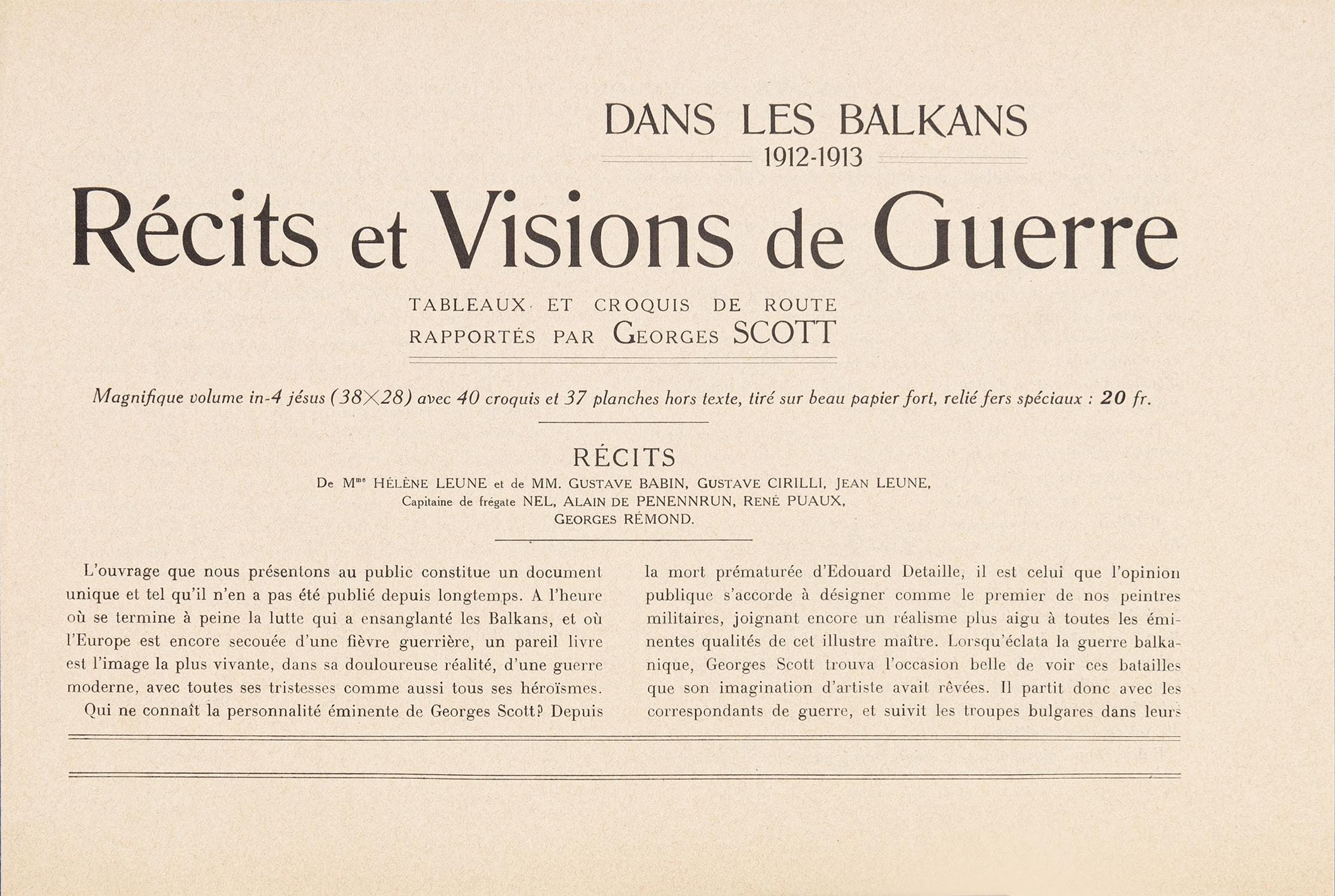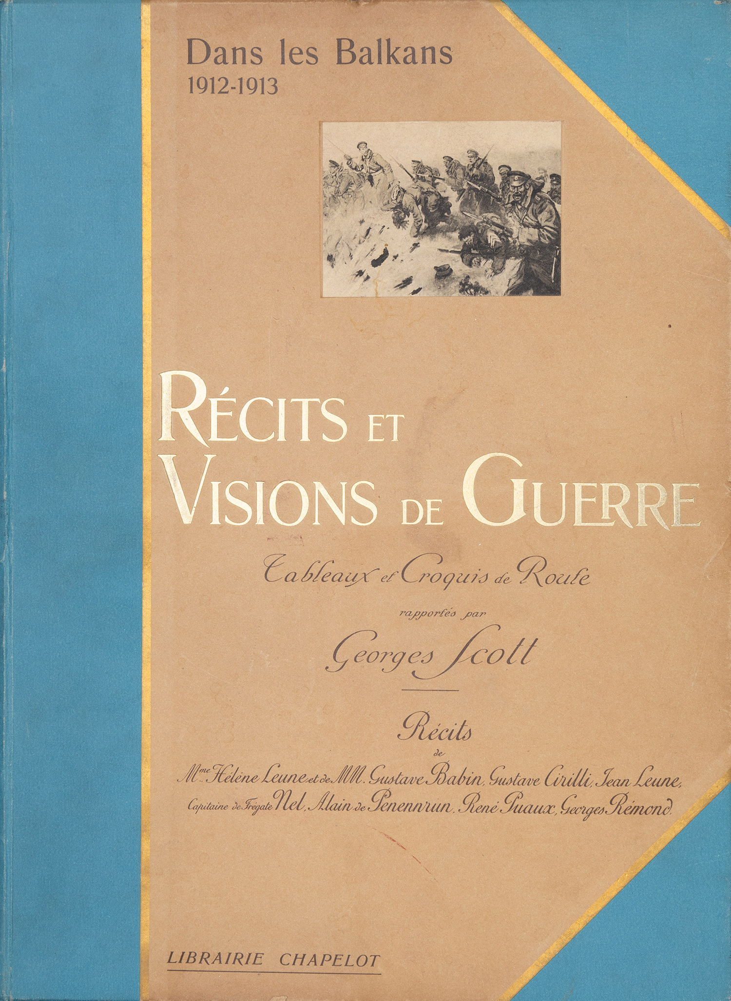 Récits et visions de guerre, tableaux et croquis de route rapportés par Georges Scott, récits de Mme Hélène Leune et de MM. Gustave Cirilli, René Puaux, Gustave Babin, Georges Rémond, Capitaine de frégate Nel, Jean Leune, Alain de Penennrun, [πάνω δεξιά:] Dans les Balkans, 1912-1913.