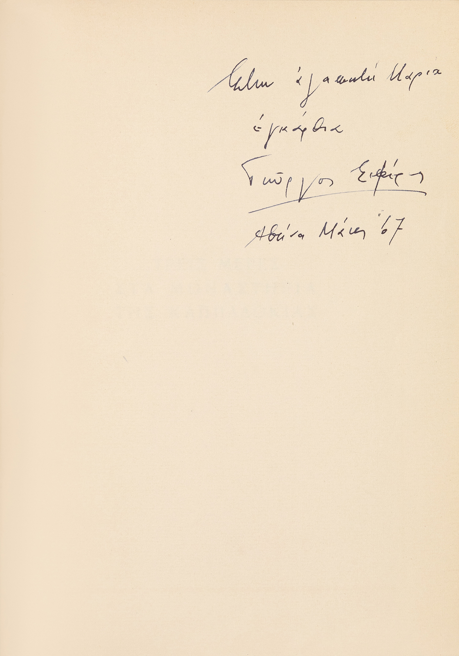 Τιμή εκτίμησης: € 100 - 150ΠΡΩΤΗ ΕΚΔΟΣΗ. 40 σ. Με 50 φωτοτυπικές αναπαραγωγές φωτογραφιών σε 18 φύλλα εκτός κειμένου στο τέλος. Αντίτυπο με ιδιόχειρη αφιέρωση («Στην ἀγαπητή Μαρία / ἐγκάρδια / Γιῶργος Σεφέρης / Αθήνα Μάης ’67»). Αρχικά εξώφυλλα. Δασκαλόπουλος Α84.