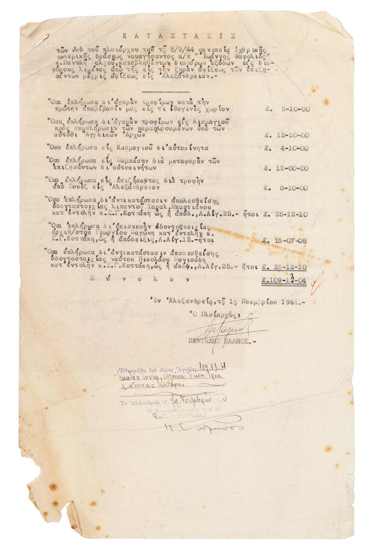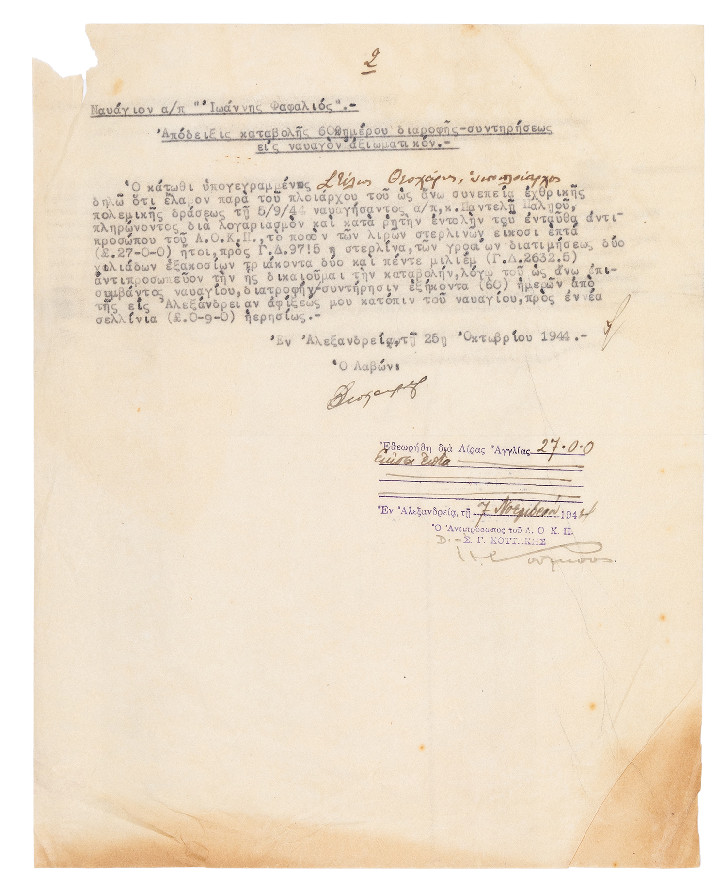 Τιμή εκτίμησης: € 300 - 400111 συνολικά φύλλα, τα περισσότερα 276 x 218 mm., τα υπόλοιπα 340 x 215 mm. Μαζί 9 τηλεγραφήματα. • Οι αποζημιώσεις των επιζησάντων «αξιωματικῶν καί ἀνδρῶν» από τον Α.Ο.Κ.Π. (Ασφαλιστικός Οργανισμός κατά Κινδύνων Πολέμου) υπογεγραμμένες από τους ίδιους, χωρισμένες στις παρακάτω ενότητες: α) «Ἑξηκονθήμερης διατροφής-συντηρήσεως», (β) «Ἀνεργίας», (γ) «Ὁλοσχερῶς ἀπολεσθέντος ἱματισμού» και (δ) «Προσθέτου δώρου πλοιοκτήτου». Ορισμένα από τα υπόλοιπα έγγραφα υπογεγραμμένα από τον πλοίαρχο Παντελή Παληό. • Το Α/Π «Ιωάννης Φαφαλιός» τορπιλίστηκε στις 5 Σεπτεμβρίου 1944 από το γερμανικό υποβρύχιο U-861 ανατολικά της Μομπάσα (Κένυα). Στις αποζημιώσεις αναγράφονται τα ονόματα 22 επιζησάντων.