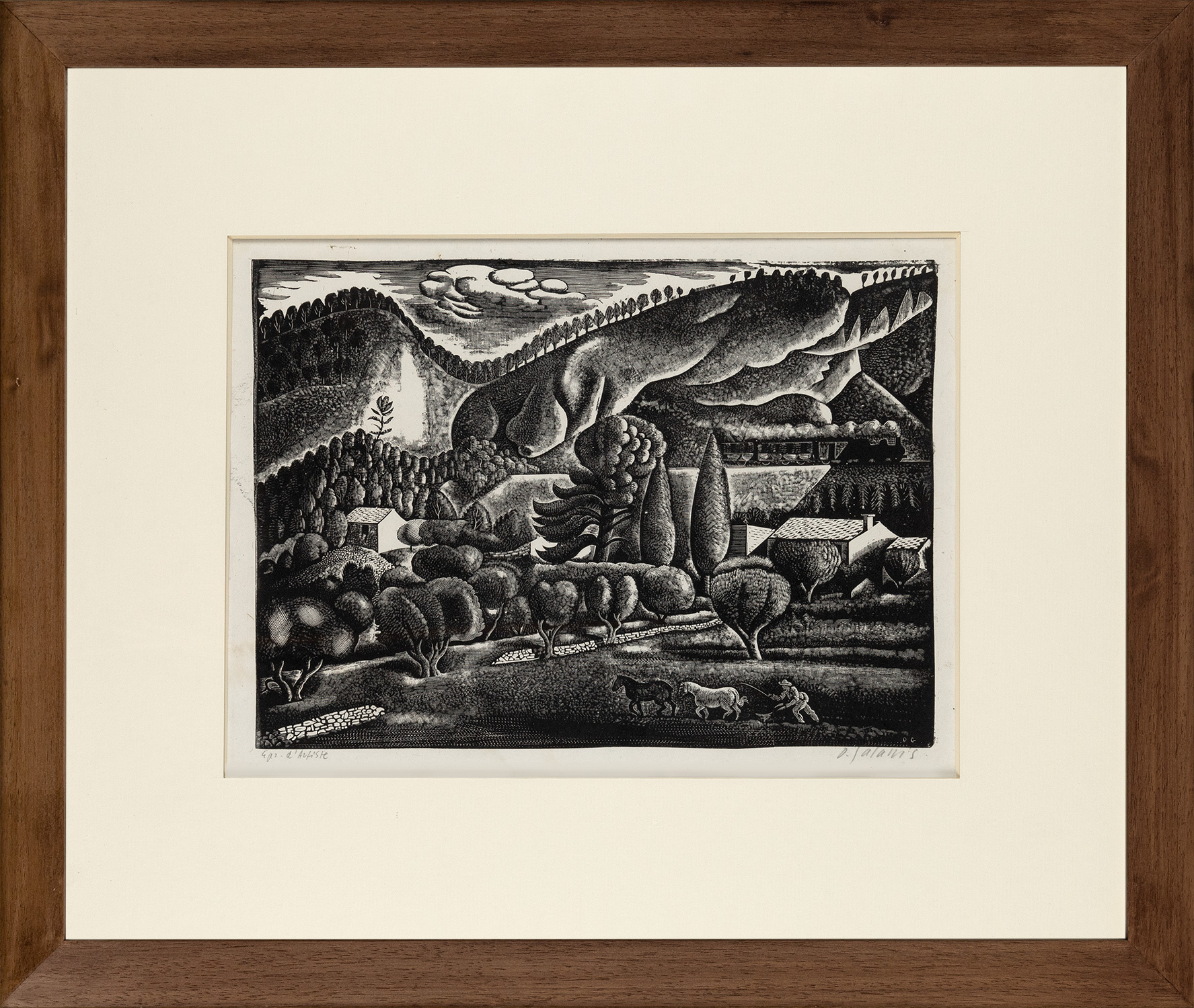 Ξυλογραφία σε όρθιο ξύλο, 246 x 345 mm. Η ένδειξη «Epr. d’Artiste» και υπογραφή στο κάτω περιθώριο με μολύβι, υπογραφή με αρχικά στην πλάκα. Σε κορνίζα.