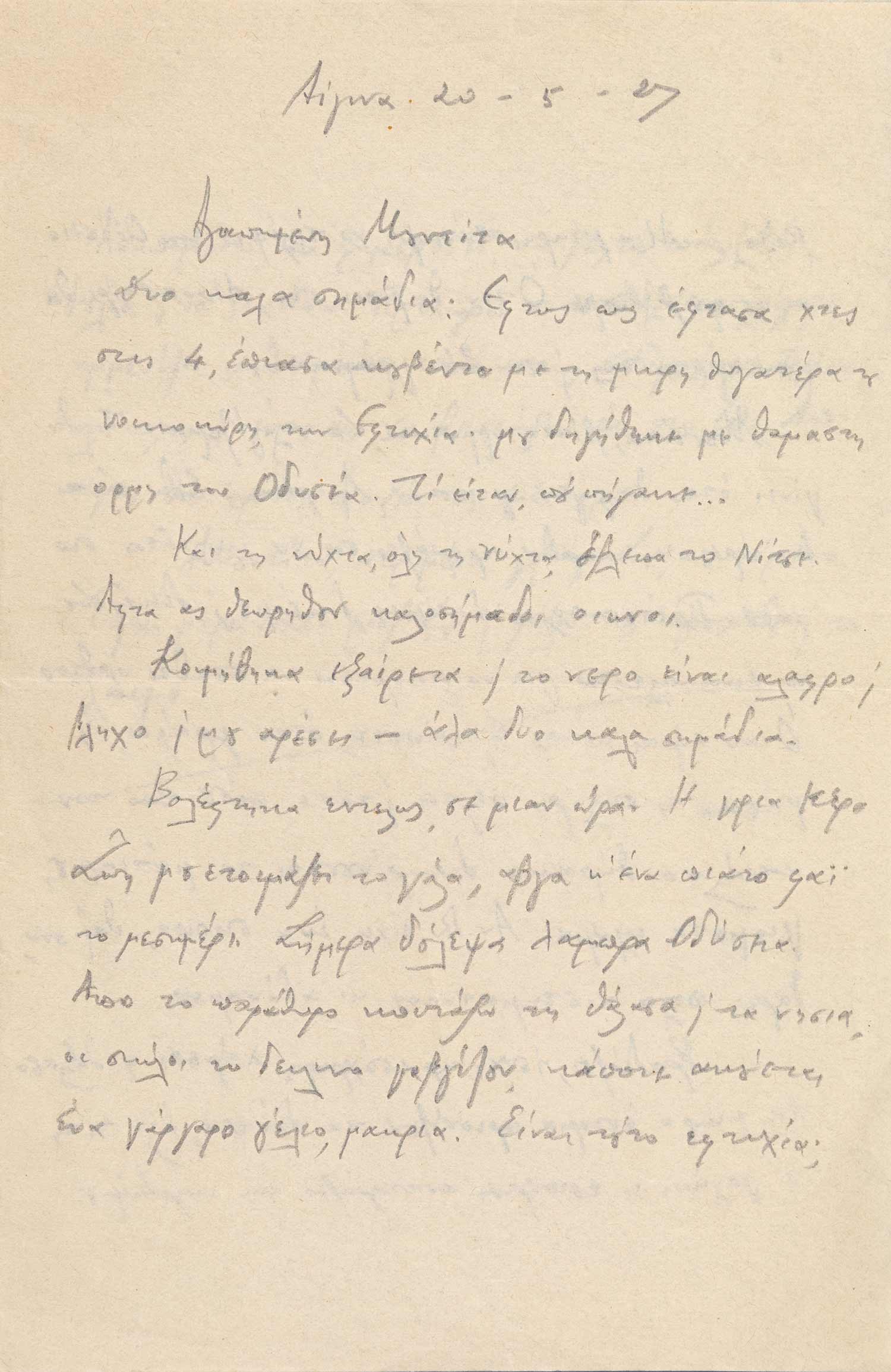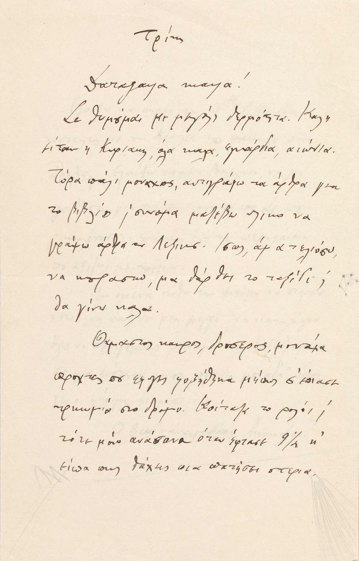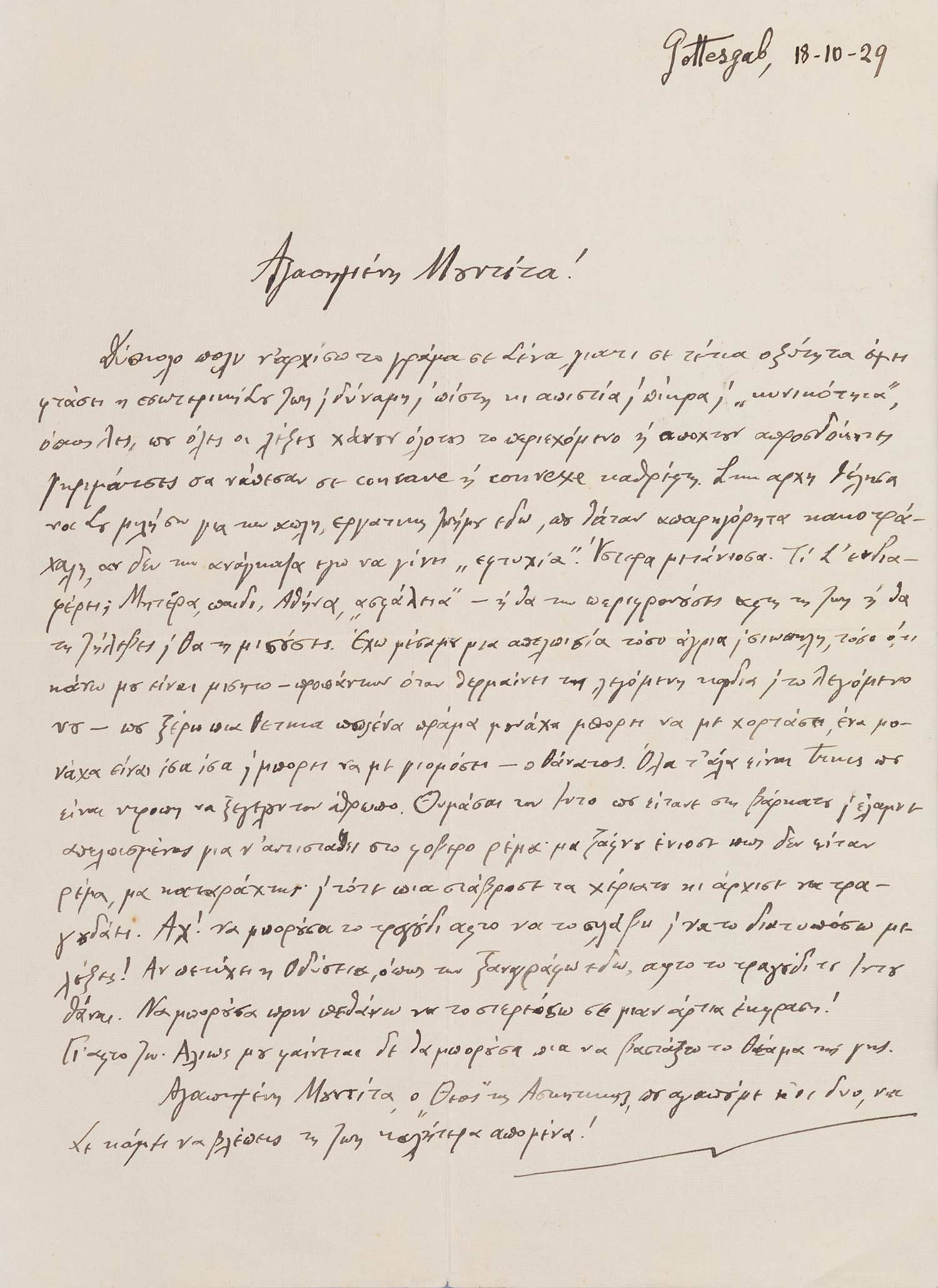 Τιμή εκτίμησης: € 12.000 - 16.000201 συνολικά σελίδες, διάφορα μεγέθη. Τρεις επιστολές υπογεγραμμένες: «Ν. Καζαντζάκης» και δύο χωρίς υπογραφή. Τέσσερις επιστολές γραμμένες σε καρτ ποστάλ και μία σε κάρτα του βιβλιοπωλείου «Πυρσός». [μαζί:] Δύο αυτόγραφα σημειώματα υπογεγραμμένα με αρχικό («Ν») προς την Έλλη Λαμπρίδη, γραμμένα στην πίσω όψη δύο φωτοκαρτών, στις οποίες εικονίζεται ο ίδιος (το ένα χρονολογημένο: «31-12-26» και το άλλο με ένδειξη τόπου: «Πειραιάς»). [μαζί:] Δίφυλλο αποσπασμένο από έκδοση με δύο αυτόγραφα σημειώματα προς την Έλλη Λαμπρίδη, χρονολογημένα: «Μάρτης-Απρίλης 1918» και «19-24 Μάη 1918», το πρώτο υπογεγραμμένο με αρχικό («Ν»). [μαζί:] Δύο αυτόγραφες επιστολές με τους φακέλους τους προς τους Γ. Πετρίδη και Ε. Παπανούτσο, υπογεγραμμένες («Ν. Καζαντζάκης»), Αθήνα [1928], 1 και 1 σ. [μαζί:] Αυτόγραφη επιστολή με την υπογραφή του («Ν. Καζαντζάκης») προς την Άννα Τσαγκρίδη, Αθήνα, 31 Μαΐου 1939, 1 σ. [μαζί:] Δύο αντίτυπα του φύλλου της εφημερίδας Ελεύθερος Τύπος της 4ης Ιουλίου 1926, στο οποίο δημοσιεύεται το άρθρο του «Ἡ Μουντίτα κ’ ἐγώ», το οποίο έγινε αφορμή για την επανασύνδεσή τους το 1927). [μαζί:] Δύο φωτογραφίες του Ν. Καζαντζάκη, 67 x 43 και 56 x 38 mm. [μαζί:] Δύο φάκελοι από επιστολές του Καζαντζάκη προς την Λαμπρίδη. [μαζί:] Φύλλο φυτού από το Όρος Σινά, το οποίο εσώκλεισε ο Καζαντζάκης στην επιστολή του της 18ης Φεβρουαρίου 1927, όπου σημειώνει σχετικά: («Σου στέλνω το μόνο φύλο που φύτροξε / στην κορφη όπου πάτησε ο Θεός και μίλησε / του Μωση — και Σε παρακαλω να το / φυλάξεις»). [μαζί:] Αντίτυπο της έκδοσης Ἀλληλογραφία με τή Μουντίτα. Νίκος Καζαντζάκης – Ἔλλη Λαμπρίδη. 1927-1957. Εἰσαγωγή-Ἐπιμέλεια-Σχόλια Γιολάντα Χατζή, Αθήνα, ΜΙΕΤ, 2018. (102) • ΕΞΑΙΡΕΤΙΚΑ ΕΝΔΙΑΦΕΡΟΥΣΑ ΕΝΟΤΗΤΑ ΕΠΙΣΤΟΛΩΝ. • Ο Καζαντζάκης και η Λαμπρίδη γνωρίστηκαν το 1918 στην Ελβετία, συνδέθηκαν ερωτικά και έζησαν αρχικά μαζί οκτώ μήνες. Επανασυνδέθηκαν το 1927 για έναν περίπου χρόνο και έπειτα διατήρησαν μια στενή φιλική σχέση ως τον θάνατο του συγγραφέα το 1957. Οι επιστολές ξεκινούν από το ταξίδι του Καζαντζάκη στην Αίγυπτο, φανερώνοντας το πάθος του για τα ταξίδια και την επαφή με τη φύση. Ακολουθεί η περίοδος της διαμονής του στην Αίγινα με την αλληλογραφία να γίνεται σχεδόν καθημερινή και να αφορά σε πρακτικά αλλά και πνευματικά ζητήματα, όπως η συγγραφή της Ὀδύσειας και οι μεταφράσεις των βιβλίων του. Οι επιστολές από το τρίμηνο ταξίδι του συγγραφέα στη Ρωσία που ακολουθούν (Οκτώβριος-Δεκέμβριος 1927) έχουν πολιτικό περιεχόμενο και ταυτόχρονα χαρακτήρα προσωπικού ημερολογίου. Η σχέση τους διακόπτεται οριστικά τον Ιανουάριο του 1928, συνεχίζουν ωστόσο να αλληλογραφούν, με τον Καζαντζάκη να αναφέρεται λεπτομερώς στην καινούργια του περιοδεία στη Ρωσία αλλά και σε παλιές τους ευτυχισμένες στιγμές. Έως και το 1945 ο Καζαντζάκης της γράφει από τα μέρη όπου διαμένει κατά καιρούς (Γαλλία, Τσεχία, κ.λ.). Τέλος οι επιστολές από την περίοδο της διαμονής του στην Αγγλία (Ιούνιος-Σεπτέμβριος 1946) περιέχουν σημαντικά στοιχεία για τη στενή τους συνεργασία, για τη μετάφραση των βιβλίων του στα αγγλικά, τη διεθνή κυκλοφορία των έργων του και την προετοιμασία της υποψηφιότητάς του για το βραβείο Νόμπελ. • Οι παρούσες επιστολές (μαζί με 60 επιστολές της Λαμπρίδη προς τον Καζαντζάκη) είναι δημοσιευμένες στο Ἀλληλογραφία μέ τή Μουντίτα (βλ. παραπάνω). Στην «Εἰσαγωγή» διαβάζουμε: «Ἡ ἀλληλογραφία τῆς Ἕλλης Λαμπρίδη μέ τόν Νίκ