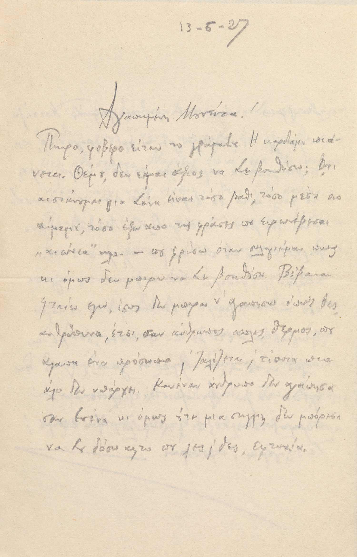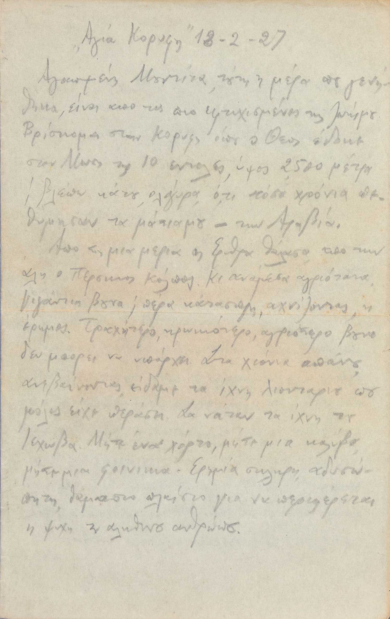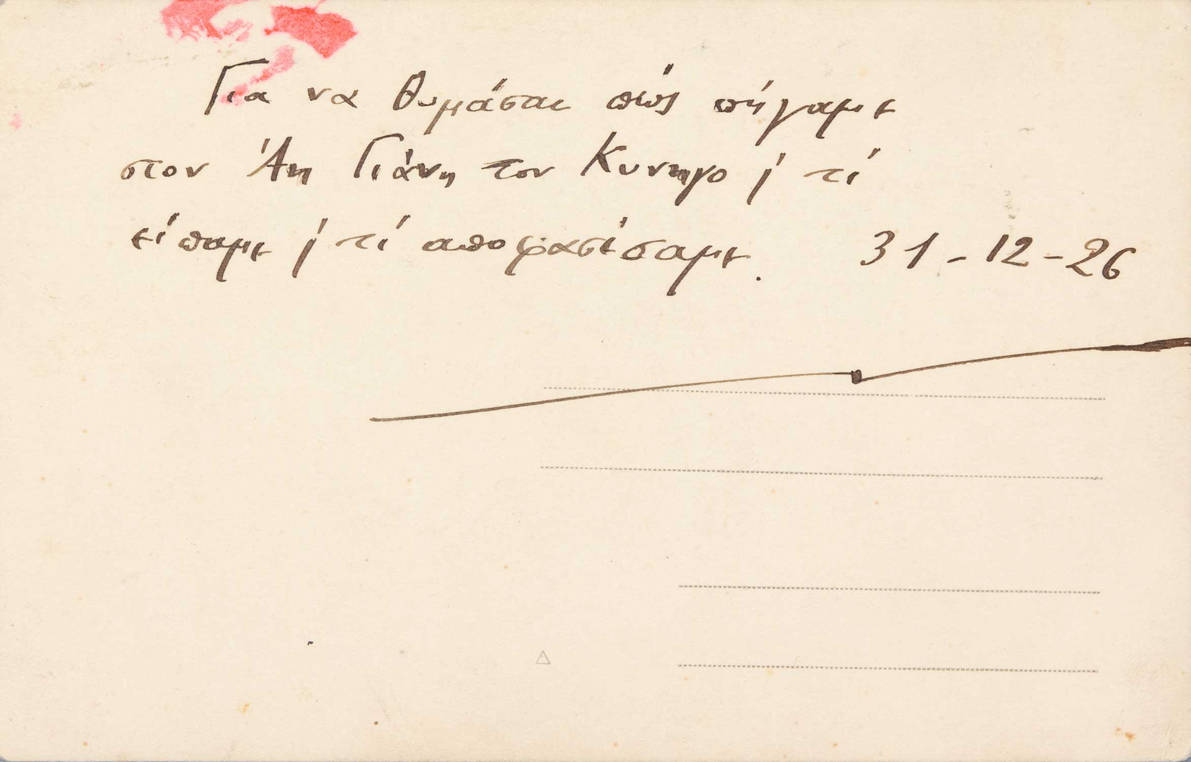Τιμή εκτίμησης: € 12.000 - 16.000201 συνολικά σελίδες, διάφορα μεγέθη. Τρεις επιστολές υπογεγραμμένες: «Ν. Καζαντζάκης» και δύο χωρίς υπογραφή. Τέσσερις επιστολές γραμμένες σε καρτ ποστάλ και μία σε κάρτα του βιβλιοπωλείου «Πυρσός». [μαζί:] Δύο αυτόγραφα σημειώματα υπογεγραμμένα με αρχικό («Ν») προς την Έλλη Λαμπρίδη, γραμμένα στην πίσω όψη δύο φωτοκαρτών, στις οποίες εικονίζεται ο ίδιος (το ένα χρονολογημένο: «31-12-26» και το άλλο με ένδειξη τόπου: «Πειραιάς»). [μαζί:] Δίφυλλο αποσπασμένο από έκδοση με δύο αυτόγραφα σημειώματα προς την Έλλη Λαμπρίδη, χρονολογημένα: «Μάρτης-Απρίλης 1918» και «19-24 Μάη 1918», το πρώτο υπογεγραμμένο με αρχικό («Ν»). [μαζί:] Δύο αυτόγραφες επιστολές με τους φακέλους τους προς τους Γ. Πετρίδη και Ε. Παπανούτσο, υπογεγραμμένες («Ν. Καζαντζάκης»), Αθήνα [1928], 1 και 1 σ. [μαζί:] Αυτόγραφη επιστολή με την υπογραφή του («Ν. Καζαντζάκης») προς την Άννα Τσαγκρίδη, Αθήνα, 31 Μαΐου 1939, 1 σ. [μαζί:] Δύο αντίτυπα του φύλλου της εφημερίδας Ελεύθερος Τύπος της 4ης Ιουλίου 1926, στο οποίο δημοσιεύεται το άρθρο του «Ἡ Μουντίτα κ’ ἐγώ», το οποίο έγινε αφορμή για την επανασύνδεσή τους το 1927). [μαζί:] Δύο φωτογραφίες του Ν. Καζαντζάκη, 67 x 43 και 56 x 38 mm. [μαζί:] Δύο φάκελοι από επιστολές του Καζαντζάκη προς την Λαμπρίδη. [μαζί:] Φύλλο φυτού από το Όρος Σινά, το οποίο εσώκλεισε ο Καζαντζάκης στην επιστολή του της 18ης Φεβρουαρίου 1927, όπου σημειώνει σχετικά: («Σου στέλνω το μόνο φύλο που φύτροξε / στην κορφη όπου πάτησε ο Θεός και μίλησε / του Μωση — και Σε παρακαλω να το / φυλάξεις»). [μαζί:] Αντίτυπο της έκδοσης Ἀλληλογραφία με τή Μουντίτα. Νίκος Καζαντζάκης – Ἔλλη Λαμπρίδη. 1927-1957. Εἰσαγωγή-Ἐπιμέλεια-Σχόλια Γιολάντα Χατζή, Αθήνα, ΜΙΕΤ, 2018. (102) • ΕΞΑΙΡΕΤΙΚΑ ΕΝΔΙΑΦΕΡΟΥΣΑ ΕΝΟΤΗΤΑ ΕΠΙΣΤΟΛΩΝ. • Ο Καζαντζάκης και η Λαμπρίδη γνωρίστηκαν το 1918 στην Ελβετία, συνδέθηκαν ερωτικά και έζησαν αρχικά μαζί οκτώ μήνες. Επανασυνδέθηκαν το 1927 για έναν περίπου χρόνο και έπειτα διατήρησαν μια στενή φιλική σχέση ως τον θάνατο του συγγραφέα το 1957. Οι επιστολές ξεκινούν από το ταξίδι του Καζαντζάκη στην Αίγυπτο, φανερώνοντας το πάθος του για τα ταξίδια και την επαφή με τη φύση. Ακολουθεί η περίοδος της διαμονής του στην Αίγινα με την αλληλογραφία να γίνεται σχεδόν καθημερινή και να αφορά σε πρακτικά αλλά και πνευματικά ζητήματα, όπως η συγγραφή της Ὀδύσειας και οι μεταφράσεις των βιβλίων του. Οι επιστολές από το τρίμηνο ταξίδι του συγγραφέα στη Ρωσία που ακολουθούν (Οκτώβριος-Δεκέμβριος 1927) έχουν πολιτικό περιεχόμενο και ταυτόχρονα χαρακτήρα προσωπικού ημερολογίου. Η σχέση τους διακόπτεται οριστικά τον Ιανουάριο του 1928, συνεχίζουν ωστόσο να αλληλογραφούν, με τον Καζαντζάκη να αναφέρεται λεπτομερώς στην καινούργια του περιοδεία στη Ρωσία αλλά και σε παλιές τους ευτυχισμένες στιγμές. Έως και το 1945 ο Καζαντζάκης της γράφει από τα μέρη όπου διαμένει κατά καιρούς (Γαλλία, Τσεχία, κ.λ.). Τέλος οι επιστολές από την περίοδο της διαμονής του στην Αγγλία (Ιούνιος-Σεπτέμβριος 1946) περιέχουν σημαντικά στοιχεία για τη στενή τους συνεργασία, για τη μετάφραση των βιβλίων του στα αγγλικά, τη διεθνή κυκλοφορία των έργων του και την προετοιμασία της υποψηφιότητάς του για το βραβείο Νόμπελ. • Οι παρούσες επιστολές (μαζί με 60 επιστολές της Λαμπρίδη προς τον Καζαντζάκη) είναι δημοσιευμένες στο Ἀλληλογραφία μέ τή Μουντίτα (βλ. παραπάνω). Στην «Εἰσαγωγή» διαβάζουμε: «Ἡ ἀλληλογραφία τῆς Ἕλλης Λαμπρίδη μέ τόν Νίκ