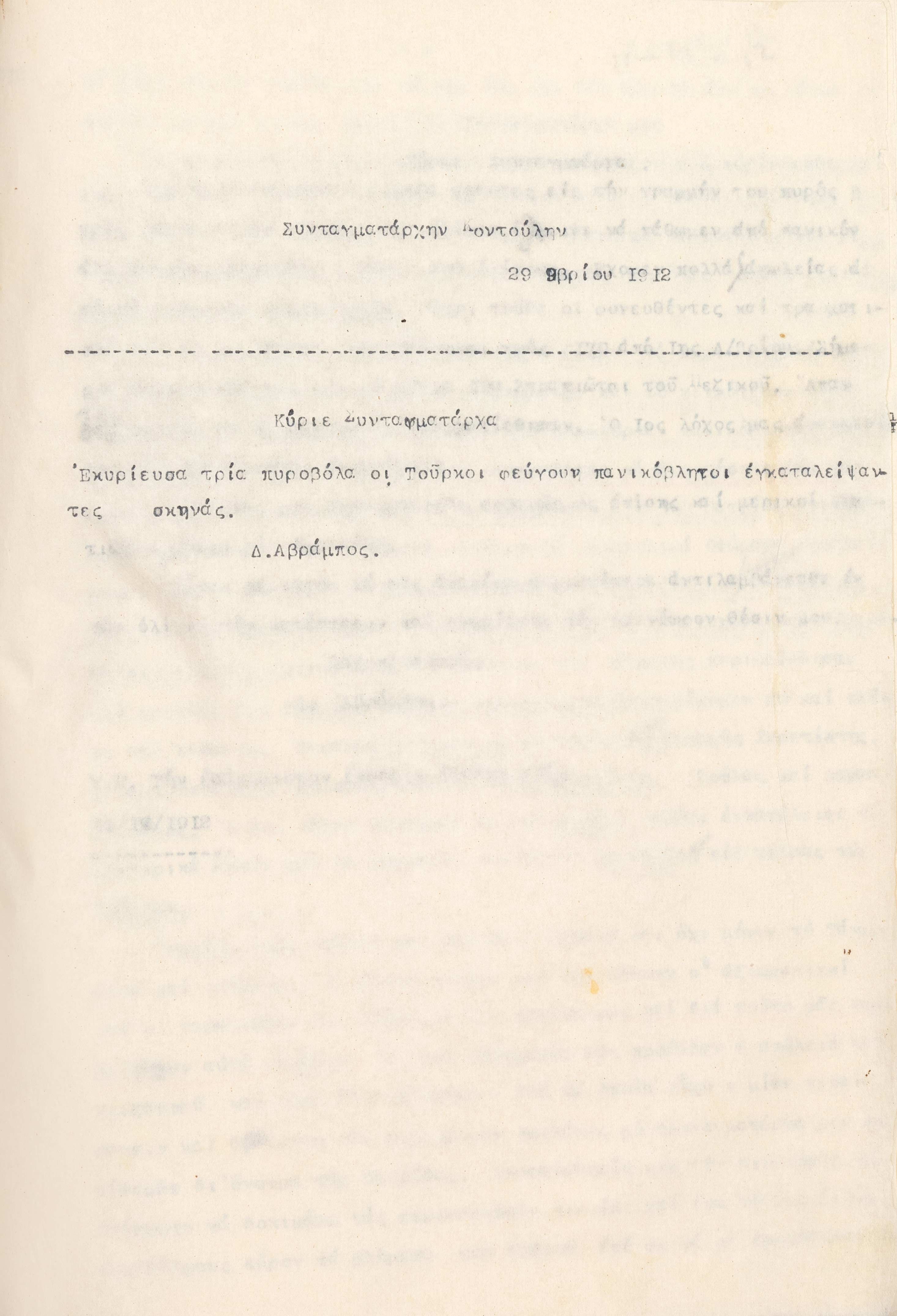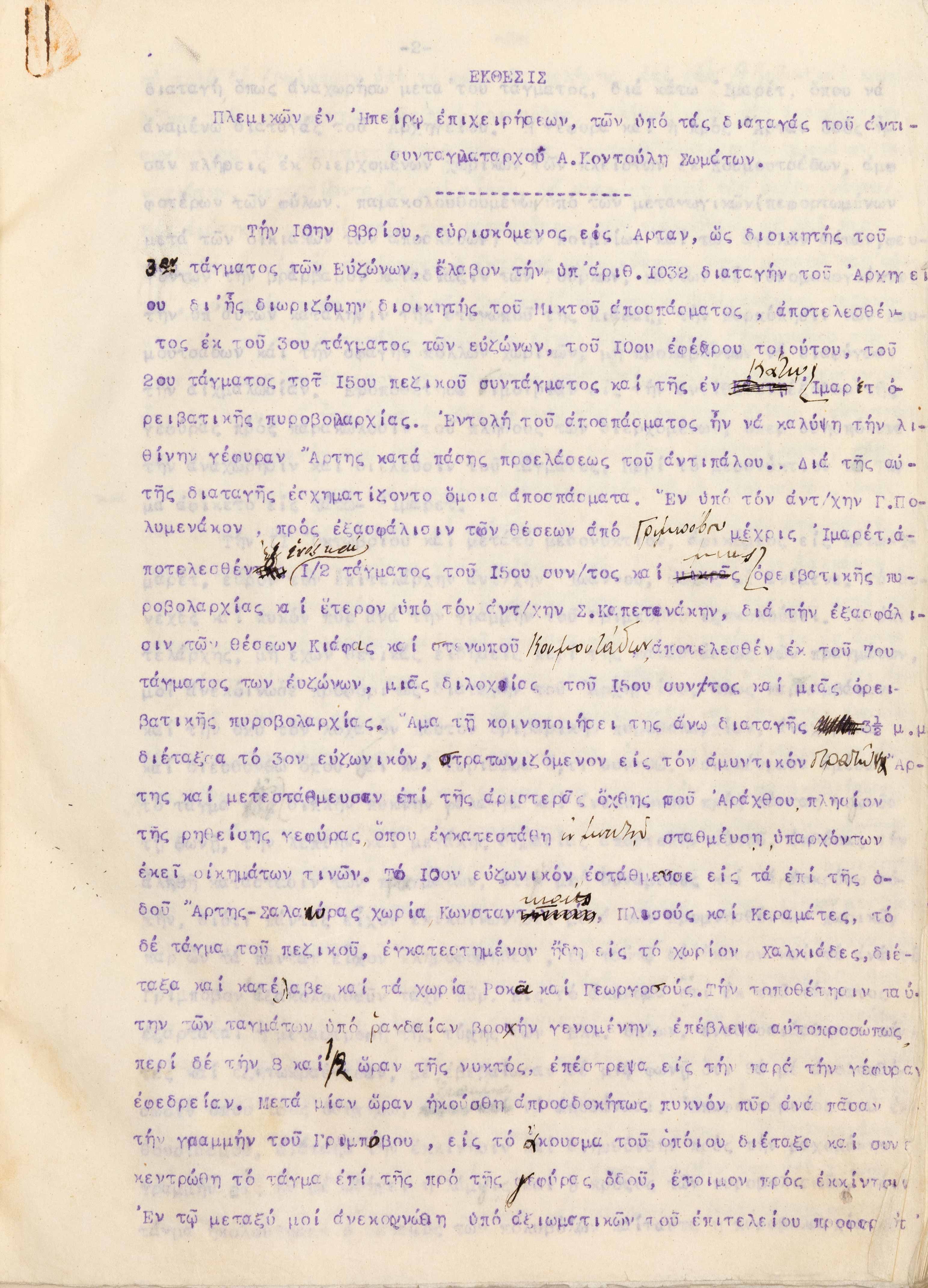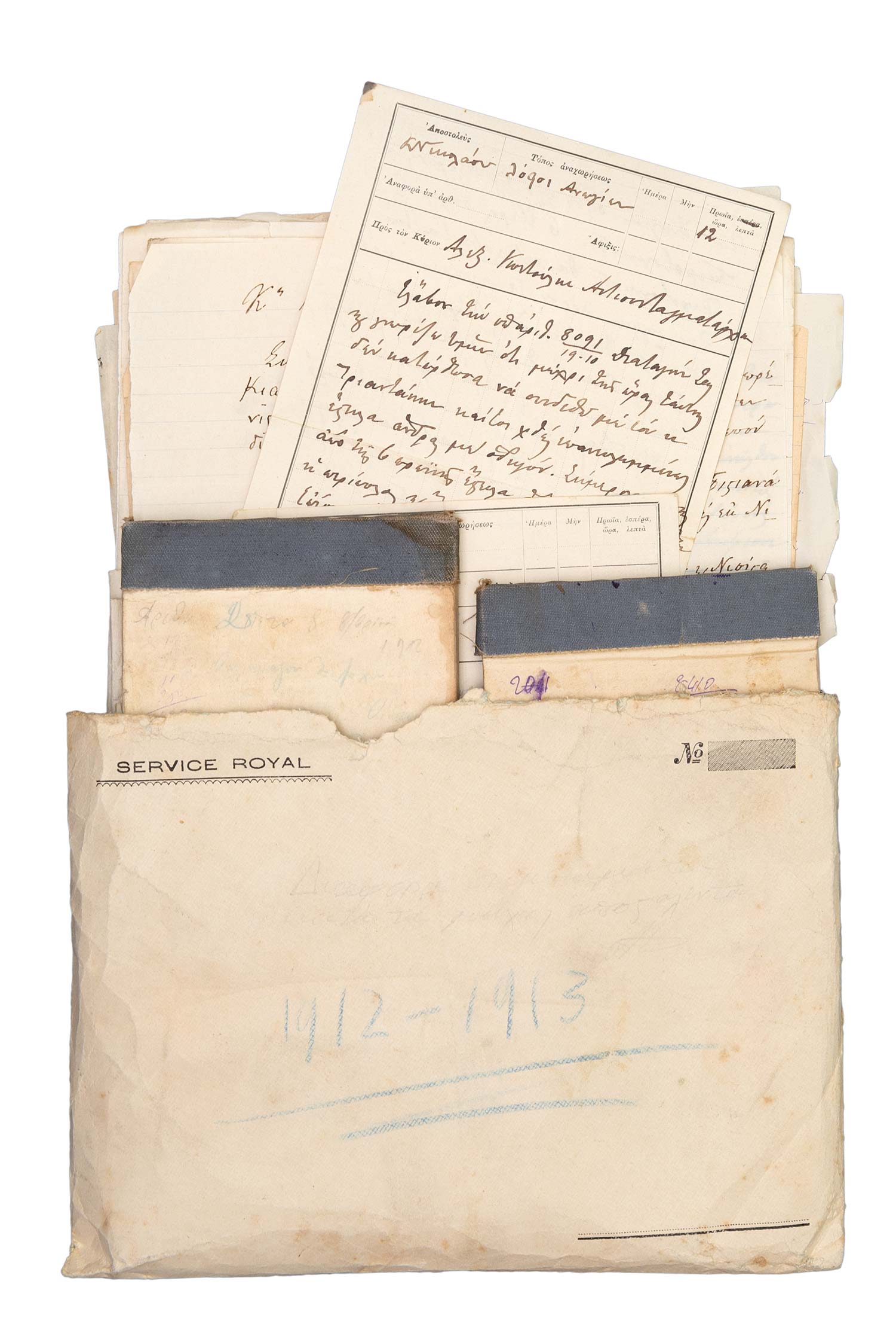 Τιμή εκτίμησης: € 12.000 - 16.000Περιλαμβάνονται αναλυτικά: (α) Εκτενέστατο αυτόγραφο ημερολόγιο των περιόδων: Ιούνιος – Οκτώβριος 1893, Ιούλιος – Οκτώβριος 1894 και Μάρτιος 1895 – Νοέμβριος 1916. • 2.549 σελίδες γραμμένες με μολύβι σε κόλλες αναφοράς, αριθμημένες στην πάνω αριστερή γωνία. (β) Φάκελος με αυτόγραφη σημείωση και τη μονογραφή του («Διάφορα σημειώματα / κατά τάς μάχας ἀποσταλέντα / ΑΚ / 1912-1913») που περιλαμβάνει 175 χειρόγραφα και έγγραφα (επιστολές, σημειώματα, αναφορές κινήσεων και συμβάντων, τηλεγραφήματα κ.ά.) χωρισμένα από τον ίδιο σε ενότητες ανάλογα με τον αποστολέα, καθώς και δύο αυτόγραφα σημειωματάρια, στα οποία ο Κοντούλης έχει αντιγράψει σημειώματα προς και από αυτόν. (γ) Πανόδετος τόμος με δακτυλογραφημένα έγγραφα σχετικά με τον πόλεμο 1912-1913, που περιλαμβάνει τις εκθέσεις του Κοντούλη για τις πολεμικές επιχειρήσεις του Α´ Μικτού Αποσπάσματος, του 3ου και του 7ου Τάγματος Ευζώνων, τις υποβληθείσες από αυτόν προτάσεις για την αμοιβή των αξιωματικών, συγχαρητήριες επιστολές διαφόρων προσώπων προς τον Κοντούλη για τη δράση του στον εν λόγω πόλεμο και την αλληλογραφία του Κοντούλη με τον ανθυπολοχαγό πεζικού Αβράμπο. (δ) Πανόδετος τόμος με δακτυλογραφημένα αντίγραφα της αλληλογραφίας του Κοντούλη με τους Ισμαήλ Κεμάλ Βλώρα, Τζαφέρ εφένδη Μπρεστάνη, Ναούμ Βοΐλα, στρατηγό Αλέξανδρο Σούτζο κ.ά. (ε) Αυτόγραφο τεύχος με την αλληλογραφία του Κοντούλη με τον Ισμαήλ Κεμάλ Βλώρα, το οποίο μεταγράφηκε στον προαναφερθέντα δακτυλόγραφο τόμο με την αλληλογραφία του Κοντούλη. (στ) Αυτόγραφη διαθήκη με την υπογραφή του («Ἀ. Κοντούλης / Ὑποστράτηγος») συνταχθείσα στις 18 Ιουλίου 1918 στα Χανιά (στην οποία μεταξύ άλλων αναφέρεται και το αυτόγραφο ημερολόγιο, που συμπεριλαμβάνεται στον παρόντα λαχνό), 2 σ. (ζ) Το διαβατήριο του Α. Κοντούλη με καταχωρήσεις από τον Ιούλιο έως τον Οκτώβριο του 1932, όταν είναι πλέον αντιστράτηγος εν αποστρατεία. (η) Αποδελτίωση δημοσιευμάτων («Ὅσα ἐδημοσίευσεν ὁ Στρατηγός Ἀλέξανδρος Κοντούλης καί ὅσα ἐδημοσιεύθησαν περί αὐτοῦ») των περιόδων: 22 Αυγούστου 1891 – 18 Απριλίου 1921, 4 Μαρτίου 1921 – 28 Δεκεμβρίου 1924 και 4 Ιουλίου 1925 – 13 Φεβρουαρίου 1928. • 3 δακτυλογραφημένοι τόμοι, 400, (401)-800 και 333 σ., πανί (η ένδειξη: «Στρατηγοῦ Κοντούλη Δημοσιογραφία» στη ράχη). • ΕΞΑΙΡΕΤΙΚΑ ΣΗΜΑΝΤΙΚΟ ΑΡΧΕΙΟ ΓΙΑ ΤΗ ΔΡΑΣΗ ΤΟΥ ΑΛΕΞΑΝΔΡΟΥ ΚΟΝΤΟΥΛΗ. Το εκτενές και αναλυτικό ημερολόγιό του, χωρισμένο ανά μήνα και κατόπιν ανά ημέρα, γραμμένο με «ευλαβική» αφοσίωση και συνέπεια (σημειώνει ακόμη και τις ημέρες χωρίς ιδιαίτερη δράση με την ένδειξη «οὐδέν» ή «οὐδέν σπουδαῖον»), εκτός από καταγραφές προσωπικού περιεχομένου, καλύπτει περιόδους ιδιαιτέρως σημαντικές για τη στρατιωτική του σταδιοδρομία και την ιστορία της Ελλάδας γενικότερα, ξεκινώντας από τον Ελληνοτουρκικό Πόλεμο του 1897, στον οποίο έλαβε μέρος ως Υπολοχαγός του 4ου Τάγματος Ευζώνων υπό τη διοίκηση του Κωνσταντίνου Σμολένσκυ. Καλύπτει στη συνέχεια την περίοδο της εμπλοκής του στον Μακεδονικό Αγώνα (1904-1908) και τη δράση του στον Α´ Βαλκανικό Πόλεμο και το ηπειρωτικό μέτωπο (1912-1913), όπου με το βαθμό του Αντισυνταγματάρχη διοικεί με νικηφόρα αποτελέσματα αρχικά το 3ο Τάγμα Ευζώνων κι έπειτα το Α´ Μικτό Απόσπασμα, και επεκτείνεται τέλος στο διάστημα από τον Μάιο 1913 έως τον Φεβρουάριο 1914, οπότε του ανατίθενται τα καθήκοντα του Στρατιωτικού και Πολιτικού Διοικητού Κορυτσάς. Ιδιαίτερη ιστορική σημα