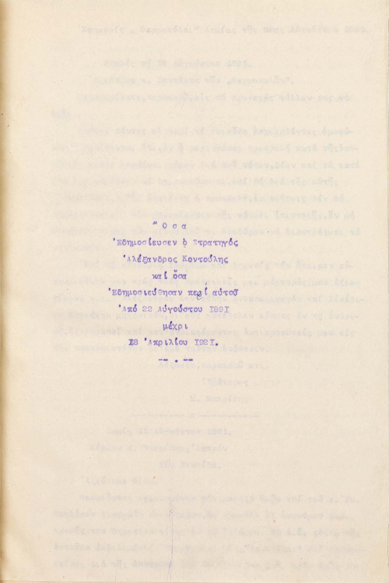 Πλουσιότατο ἀρχειακό ὑλικό σχετικό μέ τή δράση καί τήν προσωπικότητα τοῦ Ἀλ. Κοντούλη.