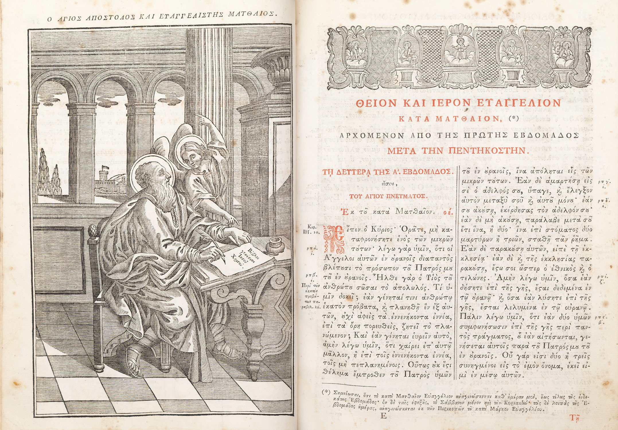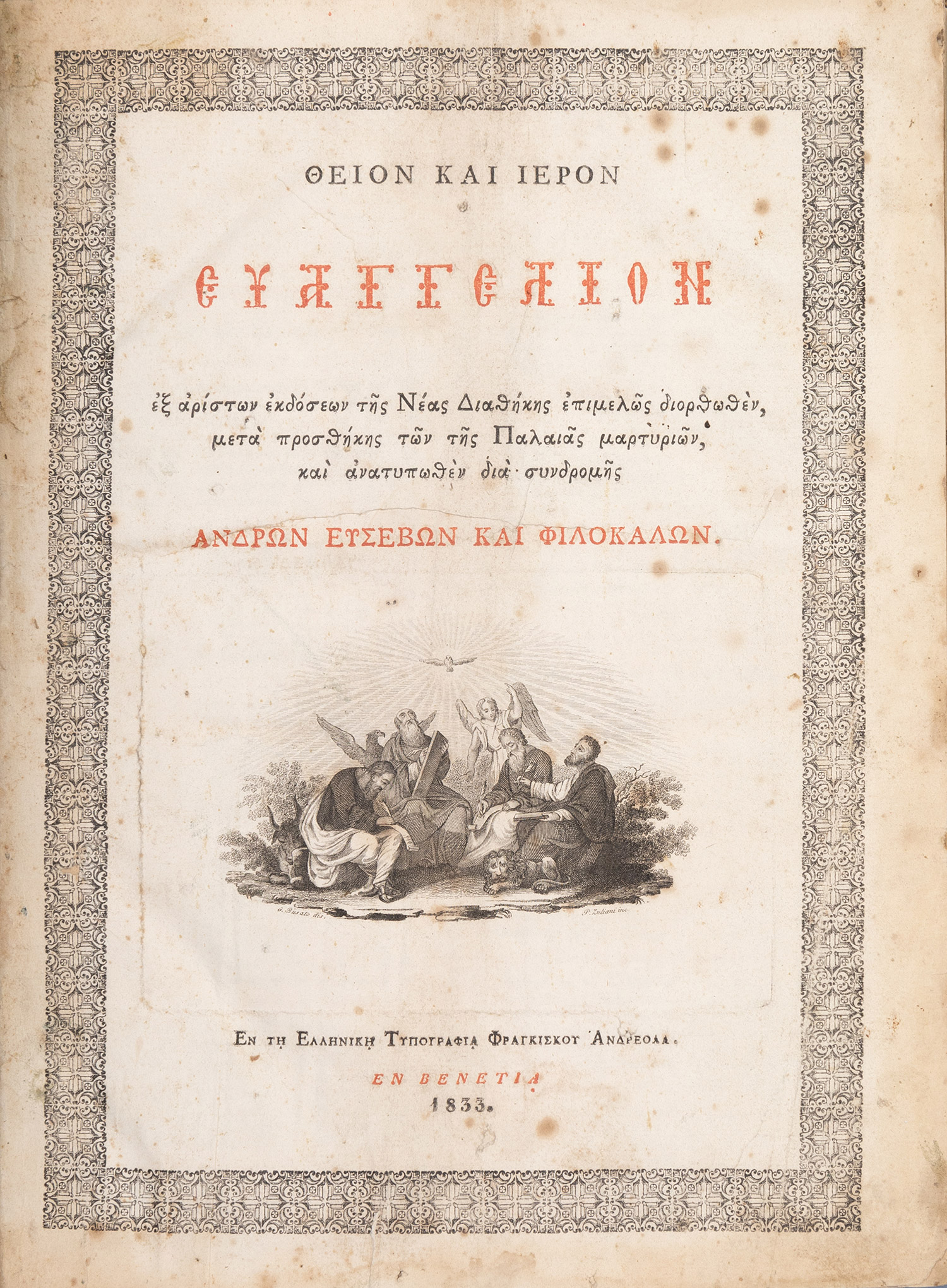 Θεῖον καί ἱερόν Εὐαγγέλιον, ἐξ ἀρίστων ἐκδόσεων τῆς Νέας Διαθήκης ἐπιμελῶς διορθωθέν, μετά προσθήκης τῶν τῆς Παλαιᾶς μαρτυριῶν καί ἀνατυπωθέν διά συνδρομῆς ἀνδρῶν εὐσεβῶν καί φιλοκάλων.