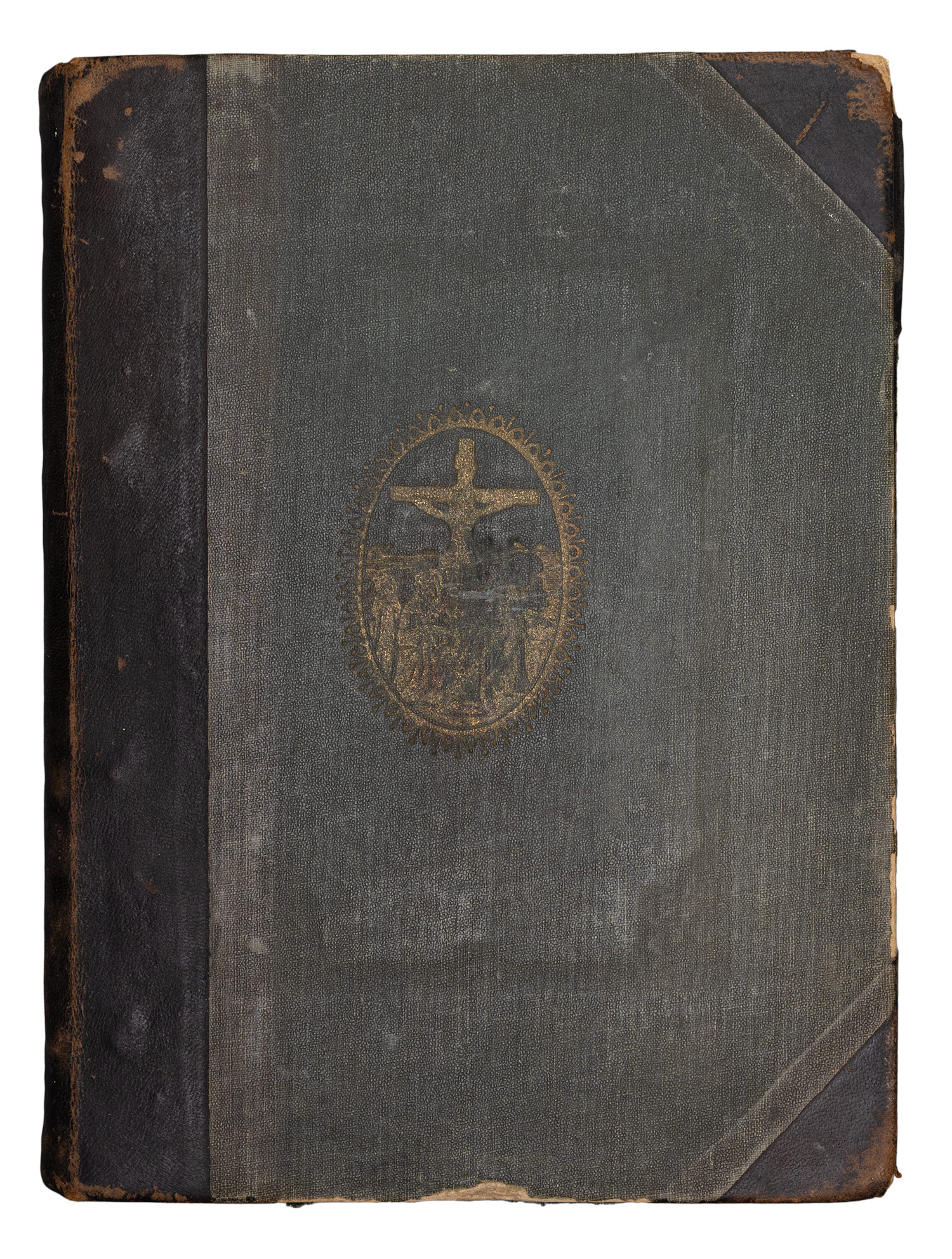 επιδιορθωμένο σχίσιμο στον τίτλο και το επόμενο φύλλο). Kείμενο σε 2 στήλες, δίχρωμη εκτύπωση, ο τίτλος σε τυπογραφικό πλαίσιο, χαλκόγραφη βινιέτα στον τίτλο και 4 ολοσέλιδες χαλκογραφίες. Δερμάτινη ράχη της εποχής της έκδοσης (το πάνω κάλυμμα επενδυμένο με πανί, χρυσή παράσταση της Σταύρωσης οβάλ σχήματος στο πάνω κάλυμμα, λείπει η πάνινη επένδυση του κάτω καλύμματος). Ηλιού 1833.34. <ως έχει>
