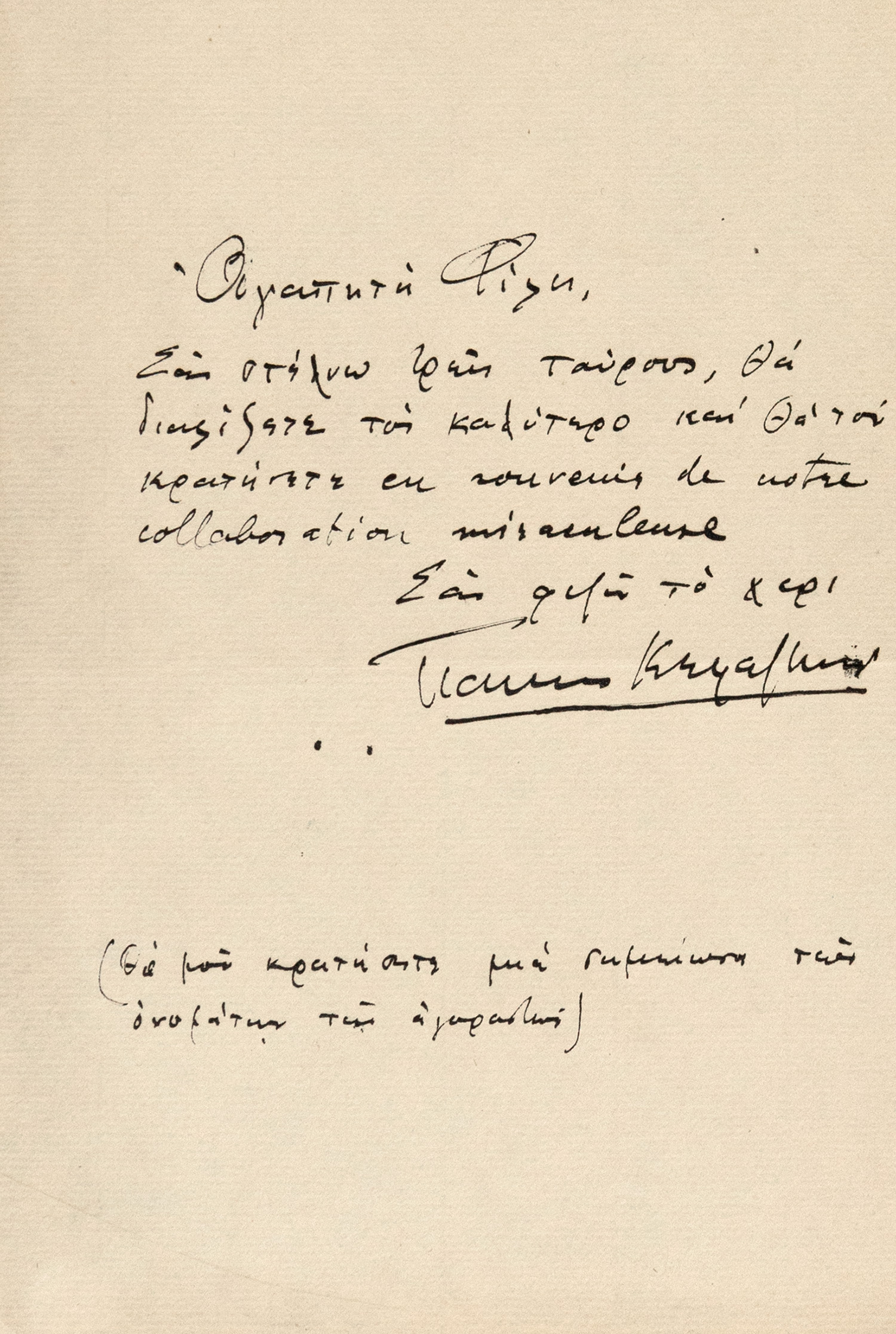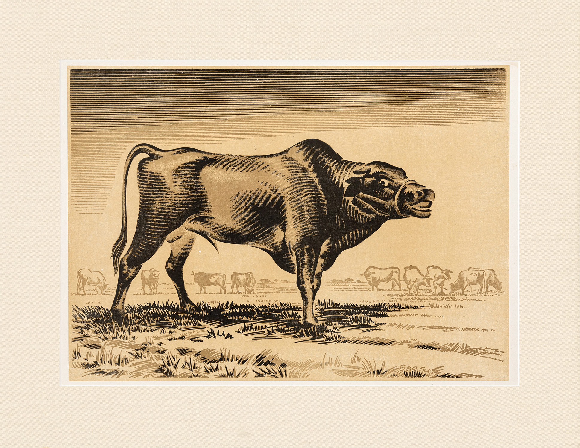 Τιμή εκτίμησης: € 800 - 1.200Έγχρωμη ξυλογραφία σε όρθιο ξύλο, 375 x 535 mm. Χωρίς υπογραφή. Σε πασπαρτού. Κάσδαγλης, σ. 523, αρ. 7. [μαζί, του ιδίου:] Αὐτόγραφη ἐπιστολή μέ τήν ὑπογραφή του («Γιάννης Κεφαλληνός») πρός μία μή κατονομαζόμενη παραλήπτρια («Ἀγαπητή φίλη»). χ.τ. και χ. • 1 σ. • «… Σᾶς στέλνω τρεῖς ταύρους, θά διαλέξετε τόν καλύτερο καί θά τόν κρατήσετε en souvenir de notre collaboration miraculeuse. Σᾶς φιλῶ τό χέρι. […] (Θά μοῦ κρατήσετε μιά σημείωση τῶν ὀνομάτων τῶν ἀγοραστῶν)». (2)