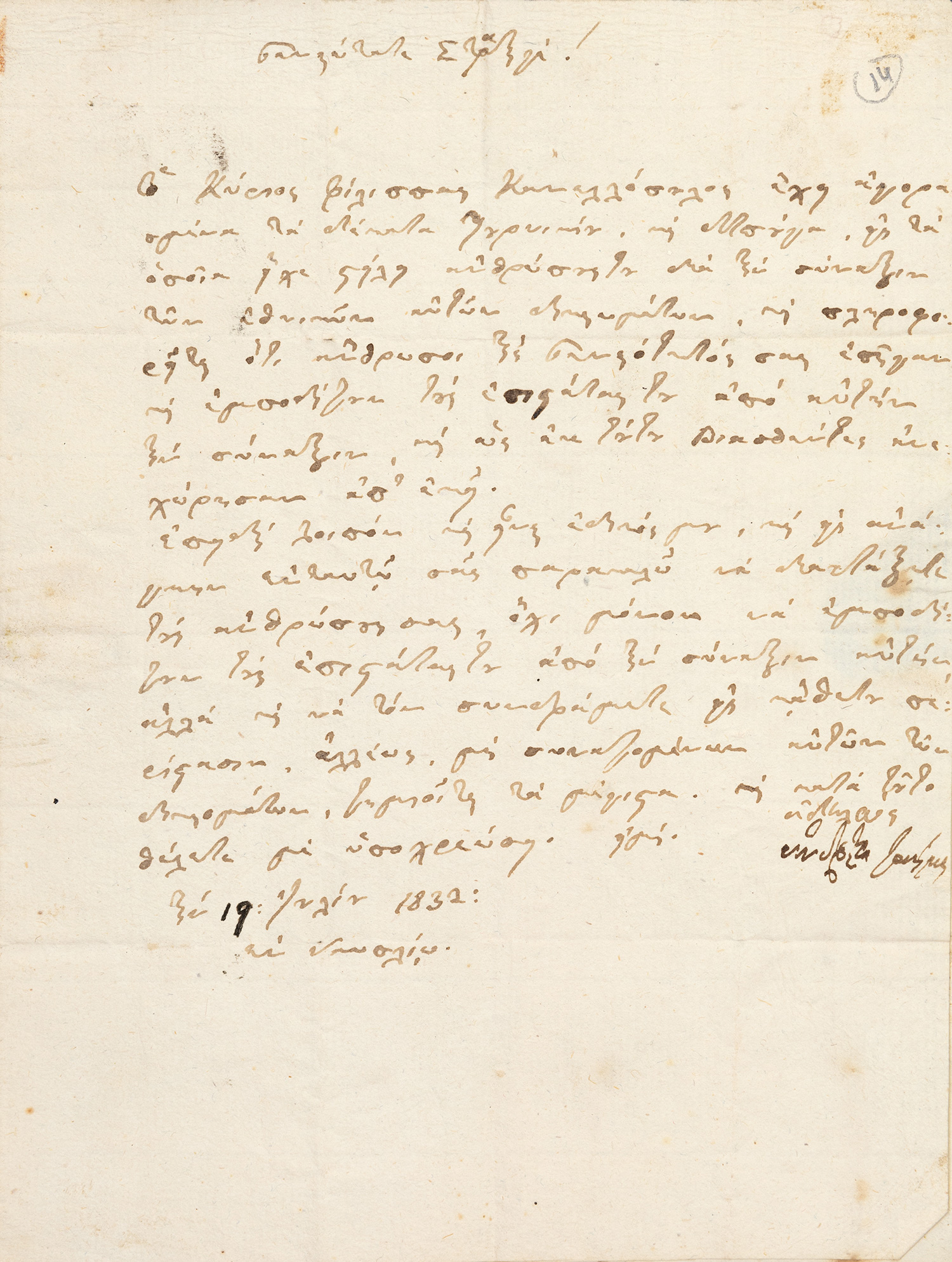 Τιμή εκτίμησης: € 8.000 - 12.000Πρόκειται για επιστολές προς τον Δ. Τζώκρη, μεταξύ των αποστολέων οι: Δ. Πλαπούτας, Κίτσος Τζαβέλας, Β. Πετιμεζάς, Θ. Γρίβας, Χατζή Χρήστος, Α. Ζαΐμης, Ι. Μακρυγιάννης, Θ. Κολοκοτρώνης. • Ο Δημήτριος Τζώκρης (1796-1875) υπήρξε ένας από τους αξιολογότερους οπλαρχηγούς και αγωνιστές στην Επανάσταση του ’21. Έδρασε στην επαρχία του Άργους, όπου απολάμβανε ιδιαίτερου σεβασμού και κύρους. Η αλληλογραφία του με άλλους στρατηγούς της Πελοποννήσου, όπως φαίνεται από τα Αρχεία της Παλιγγενεσίας της Βουλής και άλλα ιστορικά αρχεία αναδεικνύει τα πατριωτικά του αισθήματα και την αυστηρότητα του χαρακτήρα του. (37)