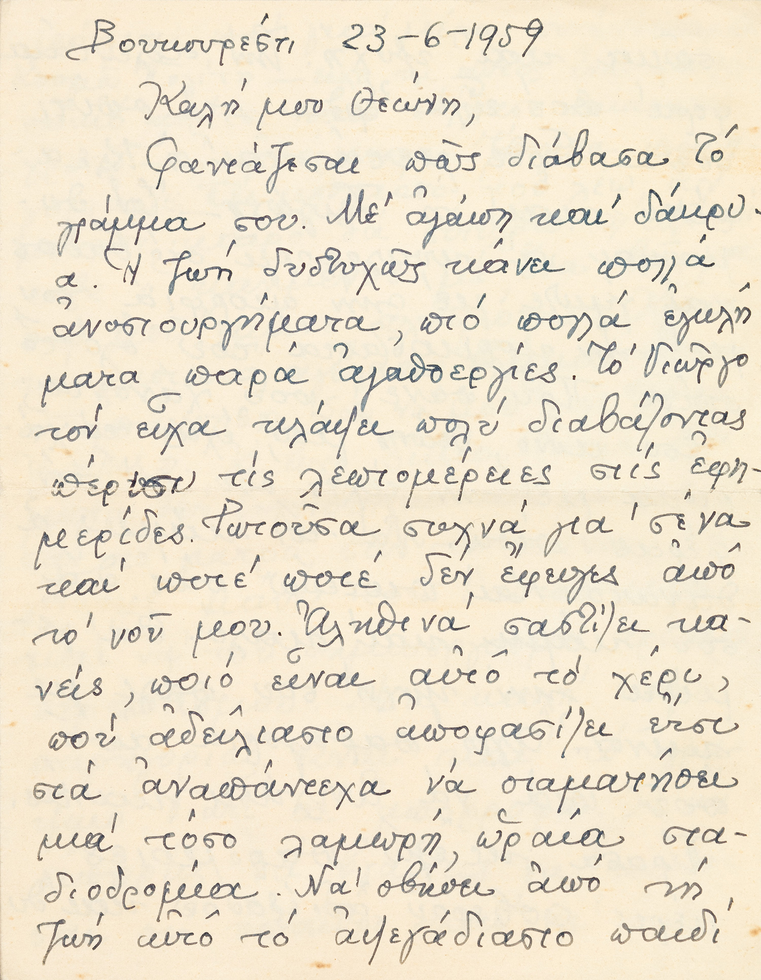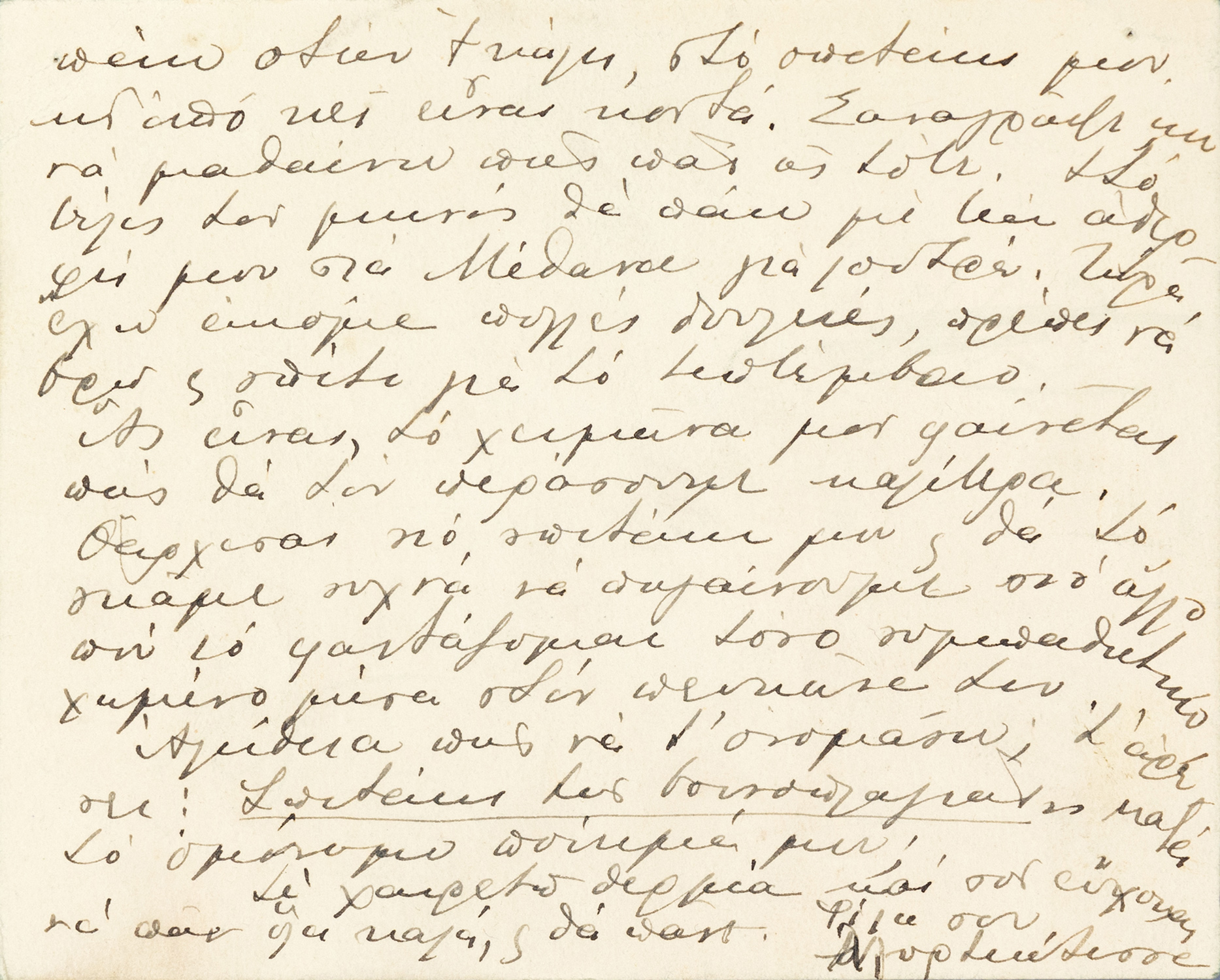 Αὐτόγραφη ἐπιστολή μέ τήν ὑπογραφή της («Μυρτιώτισσα») πρός τόν Γιῶργο Κοτζιούλα.
