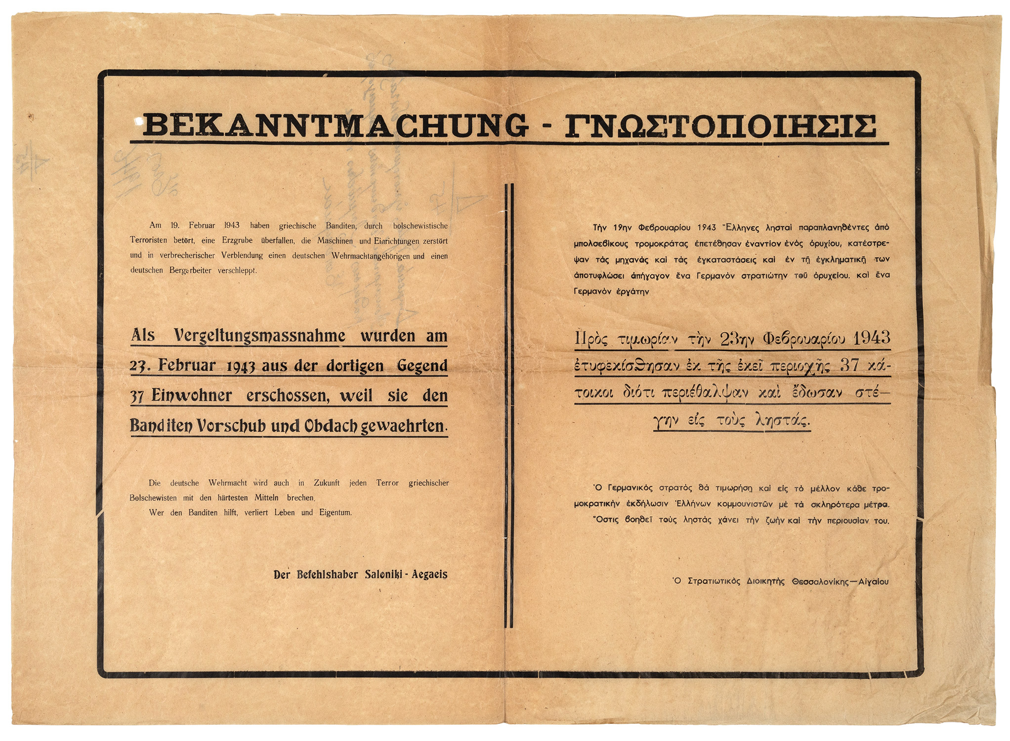 ΑΝΩΤΕΡΗ ΣΤΡΑΤΙΩΤΙΚΗ ΔΙΟΙΚΗΣΗ ΘΕΣΣΑΛΟΝΙΚΗΣ – ΑΙΓΑΙΟΥ. ΤΡΕΙΣ ΓΝΩΣΤΟΠΟΙΗΣΕΙΣ. — (α) BEKANNTMACHUNG - ΓΝΩΣΤΟΠΟΙΗΣΙΣ. Τήν 19ην Φεβρουαρίου 1943 Ἕλληνες λησταί παραπλανηθέντες ἀπό μπολσεβίκους τρομοκράτας ἐπετέθησαν ἐναντίον ἑνός ὀρυχίου, κατέστρεψαν τάς μηχανάς καί τάς ἐγκαταστάσεις καί ἐν τῇ ἐγκληματική των ἀποτυφλώσει ἀπήγαγον ἕνα Γερμανόν στρατιώτην τοῦ ὀρυχείου καί ἕναν Γερμανόν ἐργάτην. Πρός τιμωρίαν τήν 23ην Φεβρουαρίου ἐτυφεκίσθησαν ἐκ τῆς ἐκεί περιοχῆς 37 κάτοικοι διότι περιέθαλψαν καί ἔδωσαν στέγην εἰς τούς ληστάς. Ὁ Γερμανικός στρατός θά τιμωρήσῃ καί εἰς τό μέλλον κάθε τρομοκρατικήν ἐκδήλωσιν Ἑλλήνων κομμουνιστῶν μέ τά σκληρότερα μέτρα. Ὅστις βοηθεῖ τούς ληστάς χάνει τήν ζωήν καί τήν περιουσίαν του. Ὁ Στρατιωτικός διοικητής Θεσσαλονίκης-Αἰγαίου.