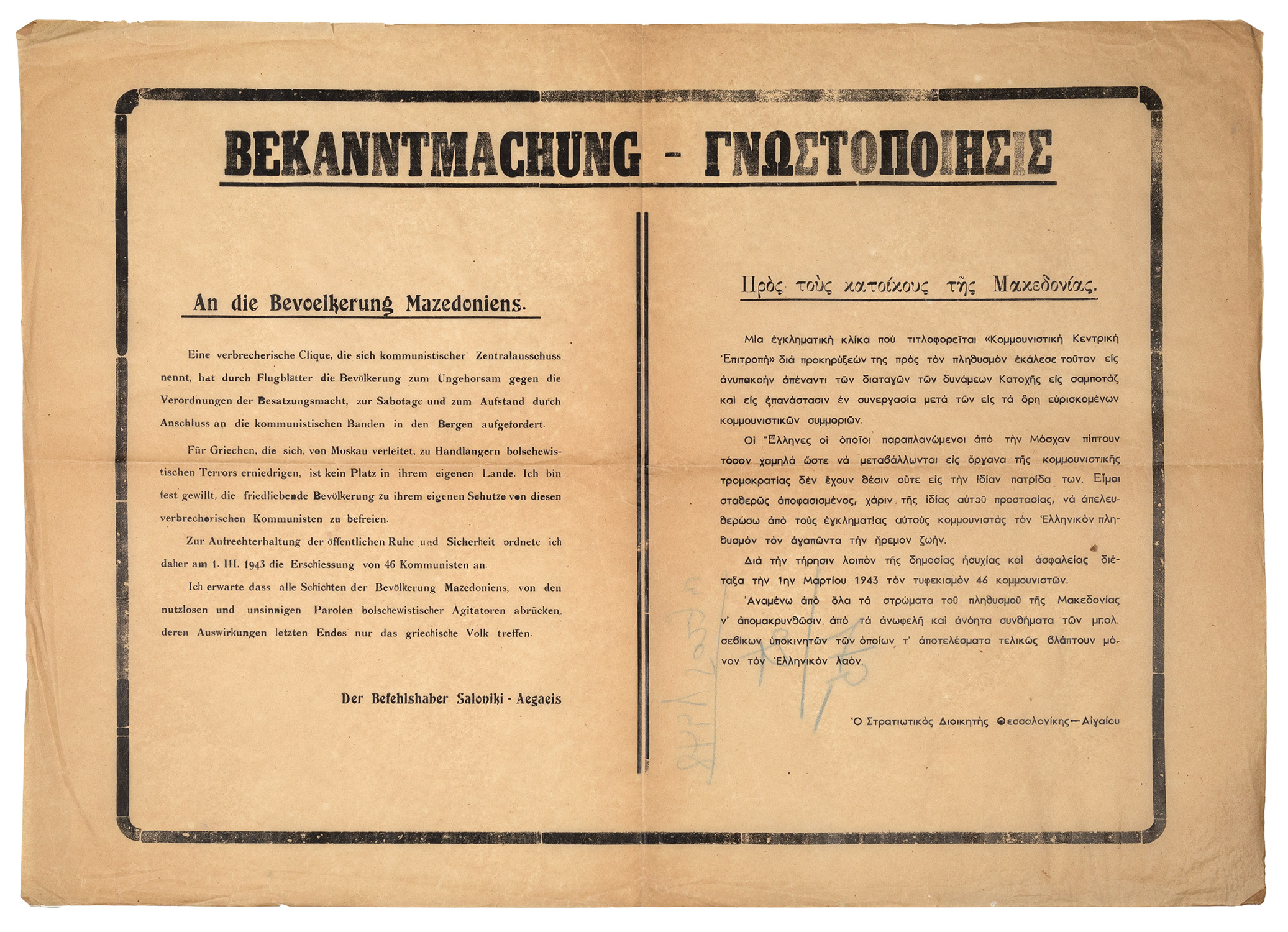 Τιμή εκτίμησης: € 500 - 700Μονόφυλλο, 501 x 693 mm. Το κείμενο στα γερμανικά και ελληνικά σε 2 στήλες και σε τυπογραφικό πλαίσιο. (β) [—] Δι’ ἀποφάσεων τοῦ Στρατοδικείου τῆς Φελντκομμαντατούρ ἀπό 26.1., 5.2. καί 12.2.1943 Κατεδικάσθησαν εἰς θάνατον οἱ: 1. Ὑποδηματοποιός Ἰωάννης Λαγούρας ἐξἈρνέας διά λεηλασίαν, (ἥν διέπραξε ἐπωφελούμενος τῶν πολεμικῶν περιστάσεων καί καταχρώμενος μιᾶς ἐκδοθείσης αὐτῷ ὑπό γερμανικῆς τινός ὑπηρεσίας πιστοποιήσεως πρός ἐκβιασμόν τῶν συμπατριωτῶν του, ἀποσπῶν ἀπό αὐτούς τρόφιμα και χρήματα)… [τελειώνει:] Ἐν Θεσσαλονίκῃ τῇ 1ῃ Μαρτίου 1943. Ὁ Στρατιωτικός διοικητής Θεσσαλονίκης-Αἰγαίου. • Μονόφυλλο, 348 x 506 mm. (κομμένα τα πλευρικά περιθώρια). Το κείμενο στα γερμανικά και ελληνικά σε 2 στήλες και σε τυπογραφικό πλαίσιο. (γ) [—] Πρός τούς κατοίκους τῆς Μακεδονίας. Μία ἐγκληματική κλίκα πού τιτλοφορεῖται «Κομμουνιστική Κέντρική Ἐπιτροπή» διά προκηρύξεών της πρός τόν πληθυσμόν ἐκάλεσεν τοῦτον εἰς ἀνυπακοήν ἀπέναντι τῶν διαταγῶν τῶν δυνάμεων Κατοχῆς εἰς σαμποτάζ καί εἰς ἐπανάστασιν ἐν συνεργασία μετά τῶν εἰς τά ὄρη εὐρισκομένων κομμουνιστικῶν συμμοριῶν. […] Διά τήν τήρησιν λοιπόν τῆς δημοσίας ἠσυχίας καί άσφαλείας διέταξα τήν 1ην Μαρτίου 1943 τόν τυφεκισμόν 46 κομμουνιστῶν…[τελειώνει:] Ὁ Στρατιωτικός διοικητής Θεσσαλονίκης-Αἰγαίου. [1943]. • Μονόφυλλο, 496 x 696 mm. Το κείμενο στα γερμανικά και ελληνικά σε 2 στήλες και σε τυπογραφικό πλαίσιο. (3)