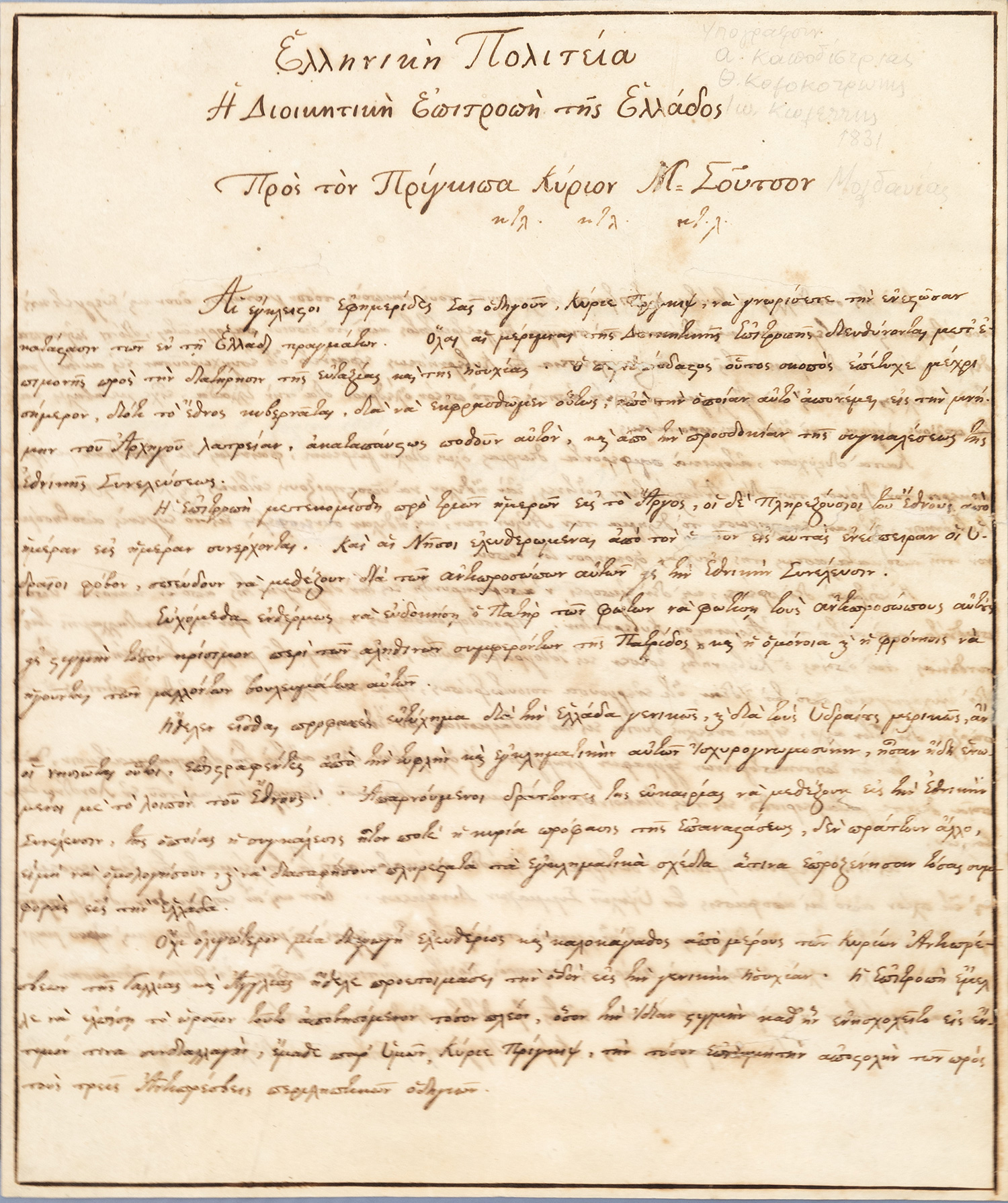 Ἔγγραφο τῆς Διοικητικῆς Ἐπιτροπῆς τῆς Ἑλλάδος μέ τίς ὑπογραφές τους («Θ. Κολοκοτρώνης», «Α. Α. Καποδίστριας» καί «Ἰωάννης Κωλέττης»), πρός τόν Ἕλληνα πρεσβευτή στό Παρίσι «Πρίγκιπα Κύριον Μ. Σοῦτσον».