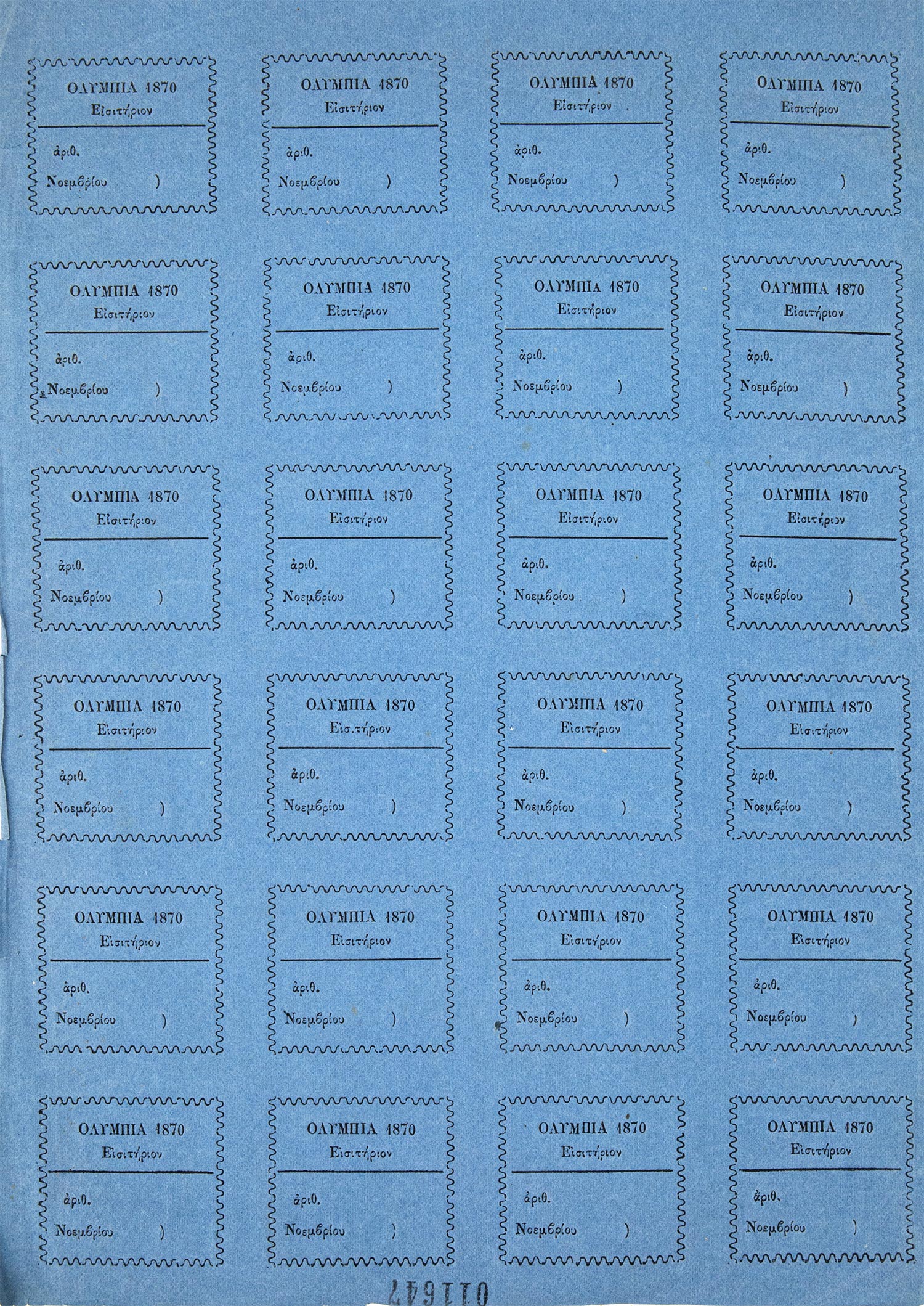 Τιμή εκτίμησης: € 500 - 7004ο, 24 σ. Χωρίς ιδιαίτερο φύλλο τίτλου (ο τίτλος στην αρχή του κειμένου). Απλά εξώφυλλα (χειρόγραφες σημειώσεις στο πάνω: «12 Μαρτίου 1871 / Ὀνομαστικός κατάλογος τῶν βραβευθέντων κατά τά Ὀλύμπια / 1870» και «Πρός τόν Κύριον / Ἀθαν: Δουρούτην / μέλος τῆς Ἐπιτροπῆς τῶν / Ὀλυμπίων»). Ηλιού & Πολέμη, 1871.528. • ΣΠΑΝΙΟ. [μαζί:] Εἰσιτήρια τῆς διοργάνωσης τῶν Β´ Ὀλυμπίων. [Αθήνα 1870]. • 24 εισιτήρια των δευτέρων Ολυμπίων, το καθένα 40 x 35 mm., με την ένδειξη: «ΟΛΥΜΠΙΑ 1870 / Εἰσιτήριον / ἀριθ. ... / Νοεμβρίου ...)...», τυπωμένα σε κοινό φύλλο μπλε χρώματος διαστάσεων 283 x 202 mm. (2)