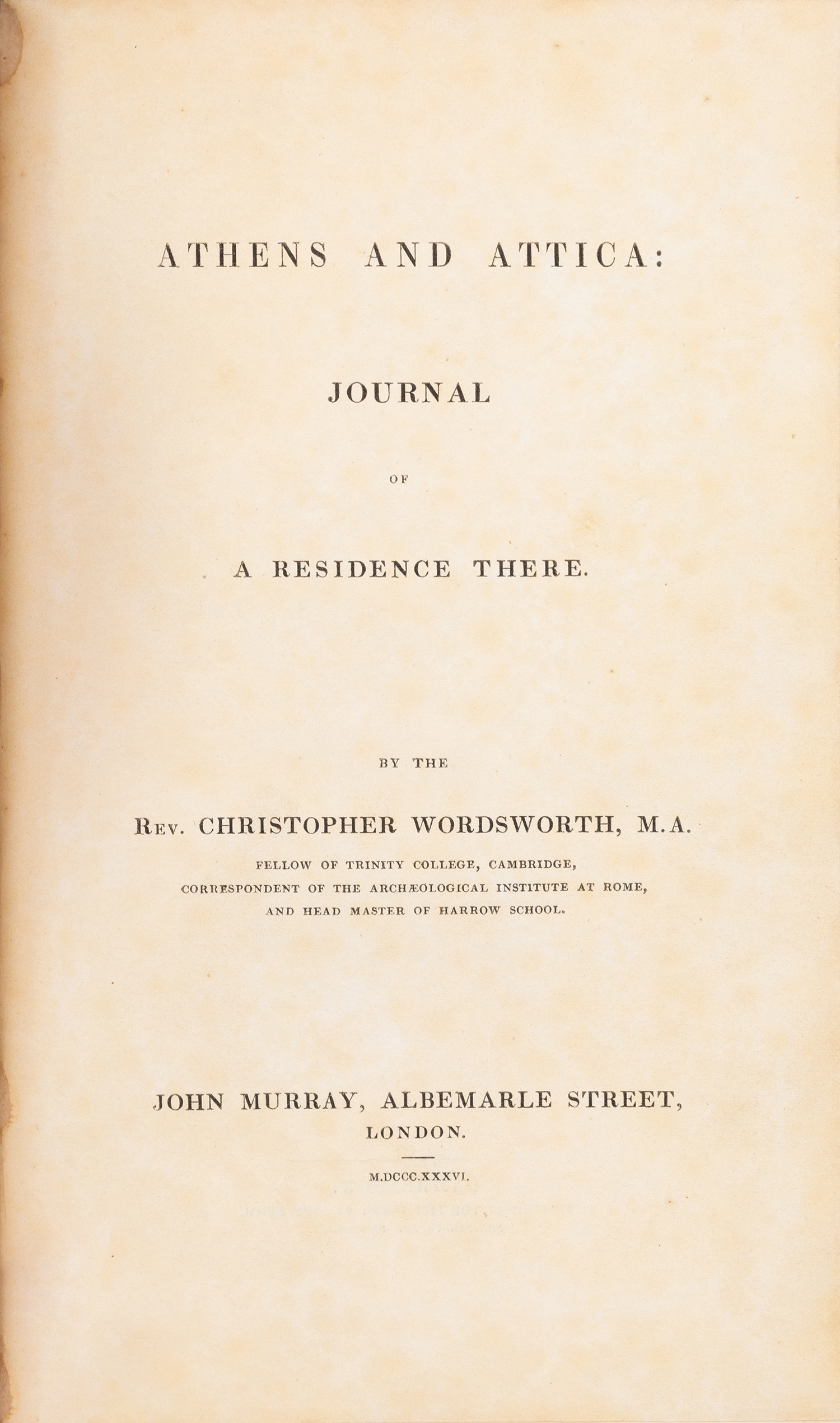 Τιμή εκτίμησης: € 200 - 3008ο, xii + 285 σ. (οξείδωση στις λιθογραφίες και τα γειτονικά τους φύλλα, λιγότερο οξειδωμένοι οι χάρτες, μικρό σχίσιμο στον ένα). Με 3 λιθογραφίες χαραγμένες από τον L. Haghe σε σχέδια του C. R. Cockerell, 2 αναδιπλούμενους χάρτες και ένα αναδιπλούμενο φύλλο με επιγραφή. Δερμάτινη ράχη της εποχής της έκδοσης (μικρές φθορές, μαρμαρογραφημένα τα καλύμματα, ex-libris Hamilton of Cairnhill). Blackmer 1839, Ioannou, σ. 560, Contominas 809.
