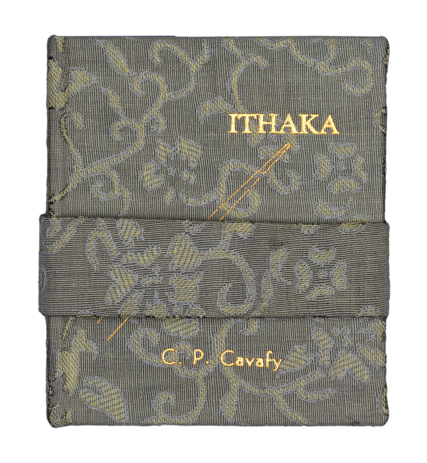 Τιμή εκτίμησης: € 500 - 700Έκδοση μικρού σχήματος – μινιατούρα (75 x 65 mm.), περιορισμένη σε 50 αριθμημένα αντίτυπα, υπογεγραμμένα από τους εκδότες. Αναδιπλούμενο εικονογραφημένο φύλλο τύπου ακορντεόν σε 10 μέρη, 70 x 600 mm., με αγγλική μετάφραση της «Ιθάκης». Αρχικό πανί (μπροκάρ, ασορτί υφασμάτινη ταινία που συγκρατεί την έκδοση κλειστή, ο τίτλος και το όνομα του ποιητή με χρυσό στο πάνω κάλυμμα).