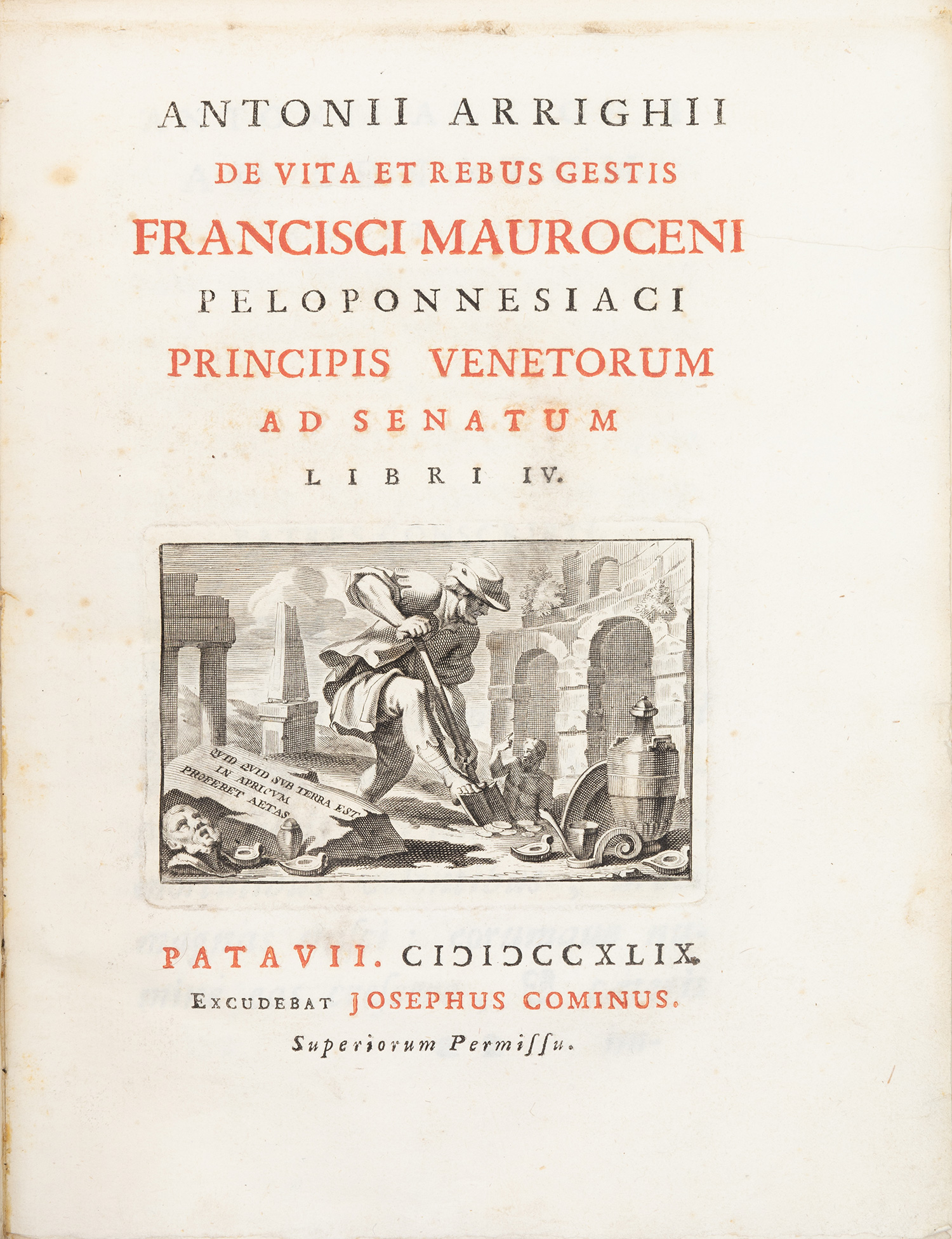 Τιμή εκτίμησης: € 400 - 6004ο, 415 σ. Δίχρωμος ο τίτλος και με χαλκόγραφο τυπογραφικό σήμα, μ’ ένα χαλκόγραφο πορτραίτο του Μοροζίνι εκτός κειμένου. Αρχικά εύκαμπτα χαρτόνια (άκοπο και αξάκριστο αντίτυπο). Atabey 34, Λαγανάς 396.