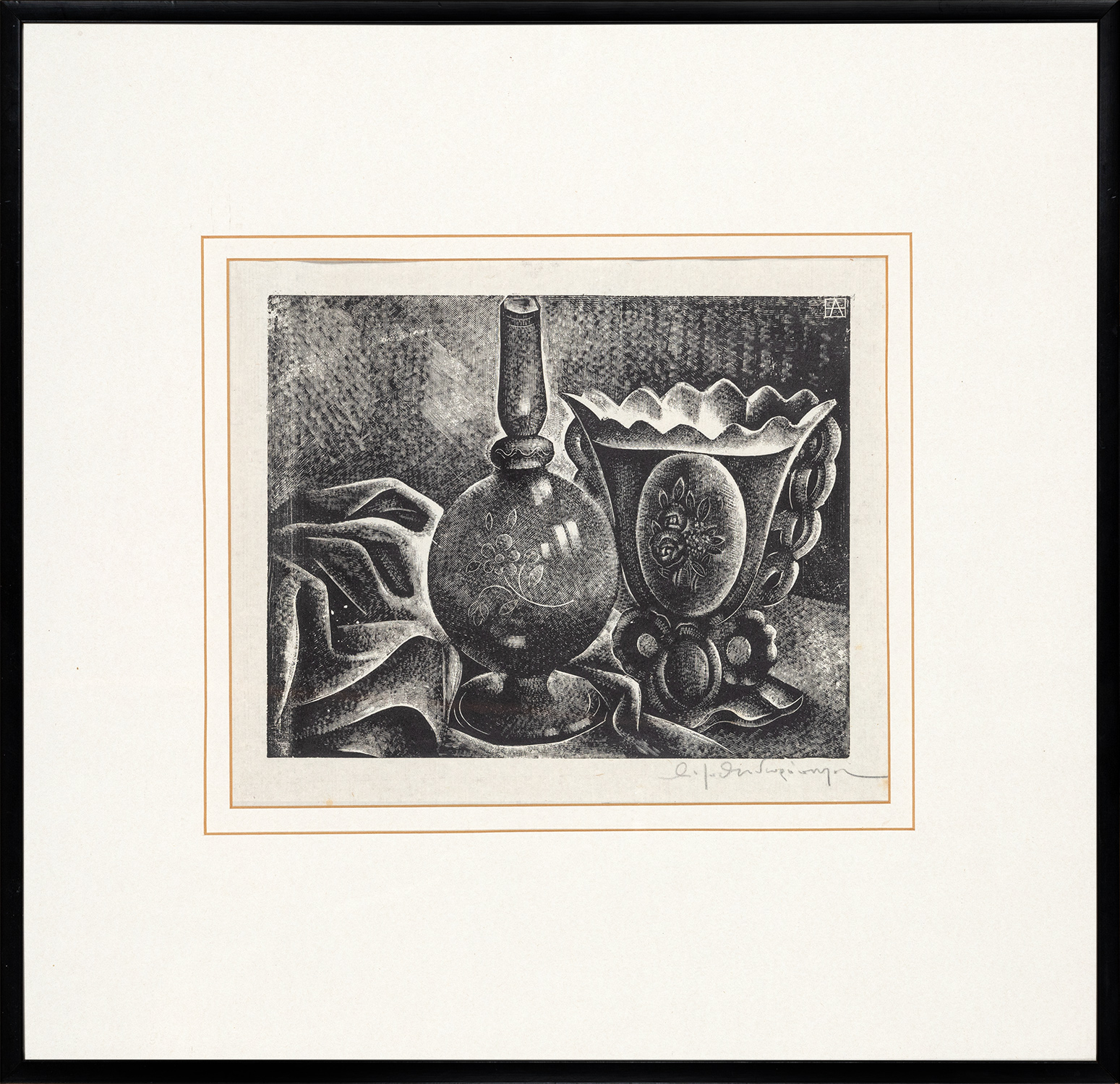 Ξυλογραφία σε όρθιο ξύλο, 199 x 235 mm. Υπογραφή στο κάτω περιθώριο με μολύβι, υπογραφή με μονόγραμμα στην πλάκα. Σε κορνίζα. Δεληβορριάς Ξ140.