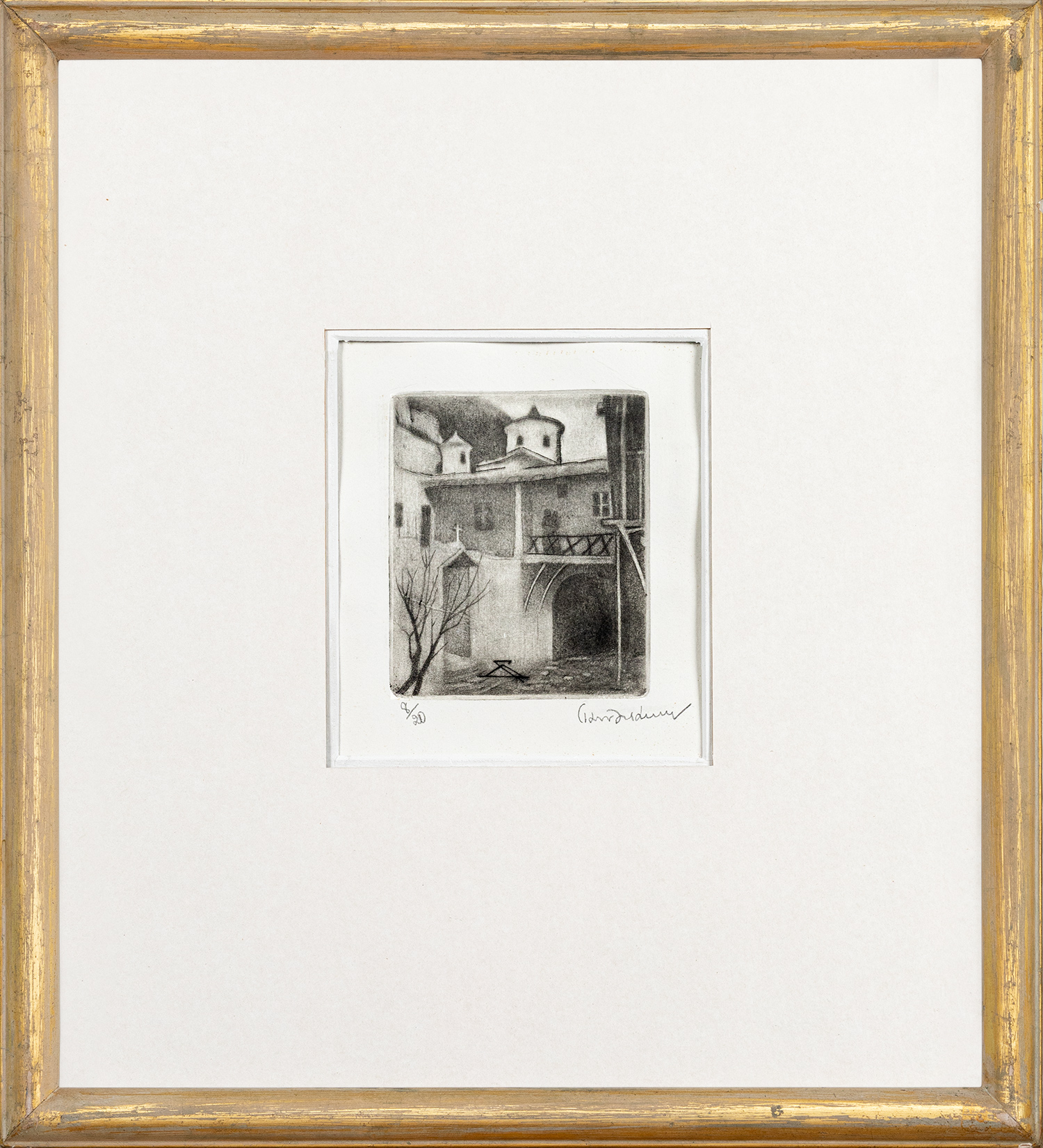 Ξεστή χαλκογραφία, 117 x 99 mm. Έκδοση σε 20 αντίτυπα, αρίθμηση και υπογραφή στο κάτω περιθώριο με μολύβι, υπογραφή με μονόγραμμα στην πλάκα. Σε κορνίζα.