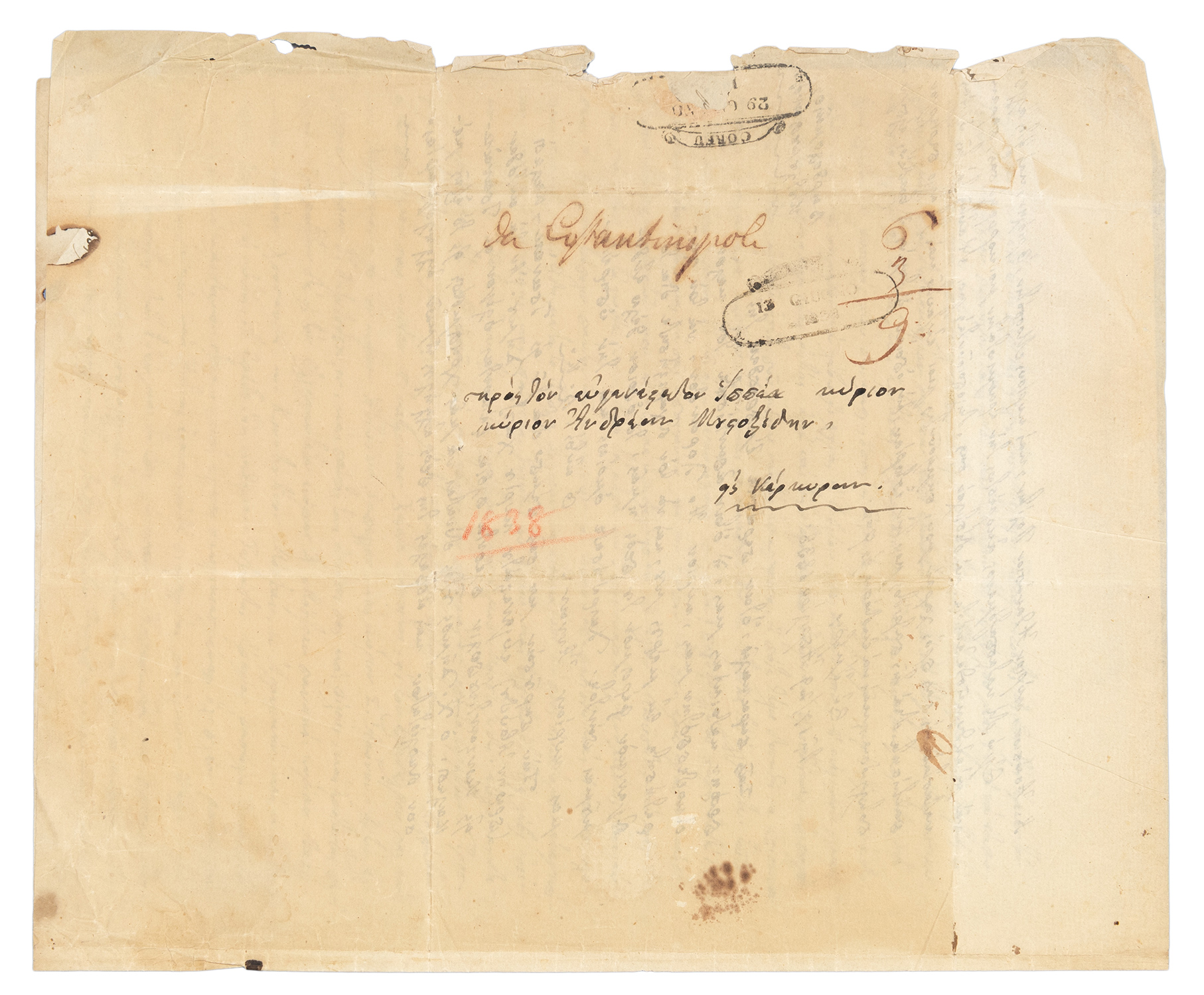 Τιμή εκτίμησης: € 800 - 1.2003 και 3 σ., 200 x 157 και 262 x 217 mm. (2) • Πρόκειται για δύο διαδοχικές επιστολές, στην πρώτη περιγράφει με λεπτομέρειες στον Α. Μουστοξύδη τη διαμονή του στην Κεφαλονιά από τον Απρίλιο έως και τον Ιούλιο του 1837 και του ζητά να τον βοηθήσει σχετικά με ένα «Τριώδιο» που βρήκε εκεί, τυπωμένο το 1738. Στη δεύτερη περιγράφει με γλαφυρότητα το μακρύ ταξίδι της επιστροφής από την Κεφαλονιά στην Ίμβρο και την εκεί παραμονή του, και αναφέρεται μεταξύ άλλων στην επιδημία πανώλης που είχε ενσκήψει στην Τένεδο και στα παράλια της Μικράς Ασίας καθώς και στην απόφαση των προκρίτων για ίδρυση σχολείου στο νησί.