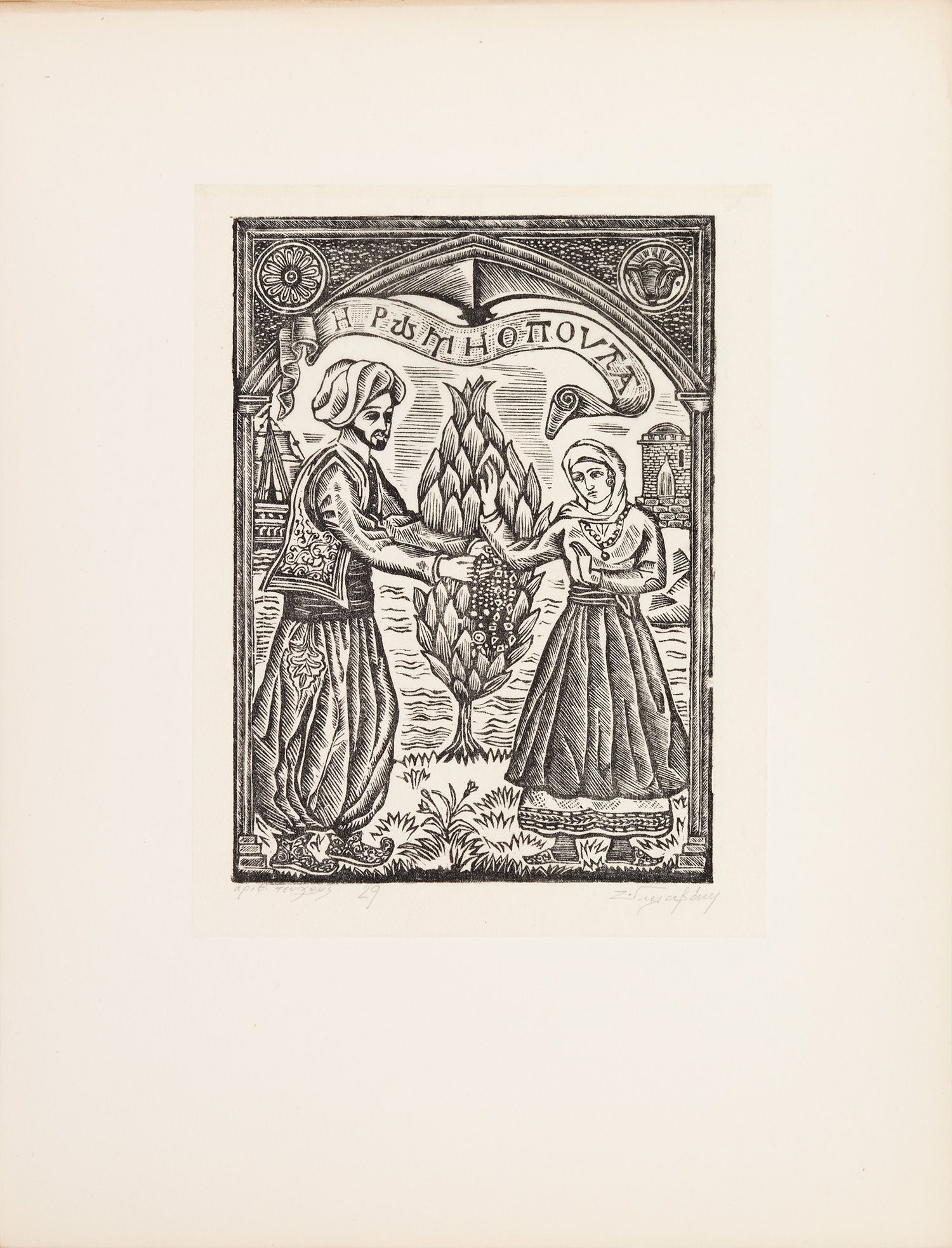 Τιμή εκτίμησης: € 300 - 4004ο, [48] σ. (αμυδρός λεκές από νερό στην πάνω εξωτερική γωνία). Έκδοση περιορισμένη σε 137 αριθμημένα αντίτυπα, με 28 ξυλογραφίες της Ζωής ΓΚΛΑΒΑΝΗ (7 επίτιτλα, 7 αρχικά γράμματα, 7 βινιέτες και 7 ολοσέλιδες ξυλογραφίες), όλες (εκτός από τις βινιέτες) με κίτρινη τίντα περασμένη με το χέρι, ένα από τα 51 αντίτυπα («Σειρά Β´ » εκτός εμπορίου, αρ. 6-56) με μία σειρά των ξυλογραφιών τυπωμένη σε γιαπωνέζικο χαρτί (όλες αριθμημένες και υπογεγραμμένες από την καλλιτέχνιδα και επικολλημένες σε λευκά φύλλα), αντίτυπο σε άρραφα δίφυλλα (όπως κυκλοφόρησε). Αρχικά χαρτόνια.