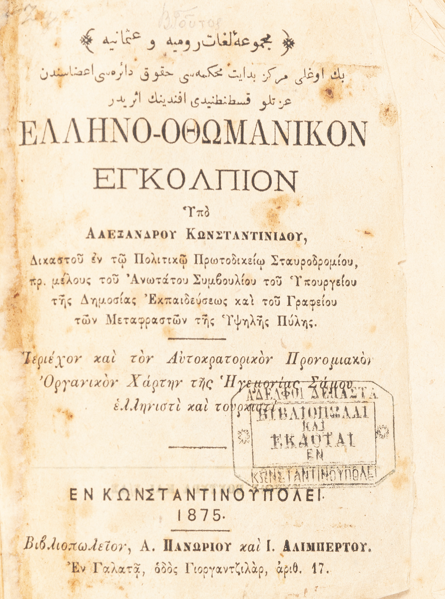 Τιμή εκτίμησης: € 150 - 2008ο, 291 σ. (ελαφρά οξειδωμένα μερικά φύλλα). Ο τίτλος στα γαλλικά, τουρκικά και ελληνικά, κείμενο σε 2 στήλες. Δερμάτινη ράχη της εποχής της έκδοσης (μικρές φθορές). Ηλιού & Πολέμη, 1869.85. [μαζί, του ιδίου:] Ἑλληνο-ὀθωμανικόν ἐγκόλπιον, περιέχον καί τόν Αὐτοκρατορικόν Προνομιακόν Ὀργανικόν Χάρτην τῆς Ἡγεμονίας Σάμου ἑλληνιστί καί τουρκιστί. Κωνσταντινούπολη, Α. Πανώριος & Ι. Aλιμπέρτης, 1875. • 16ο, λβ´ + 318 σ. (λείπει το τελευταίο φύλλο: σ. 319-[320]). O τίτλος στα τουρκικά και τα ελληνικά. Δερμάτινη ράχη της εποχής της έκδοσης (φθορές, σπασμένη η κάτω σύνδεση). Salaville & Dalleggio, 189, Ηλιού & Πολέμη, 1875.217.