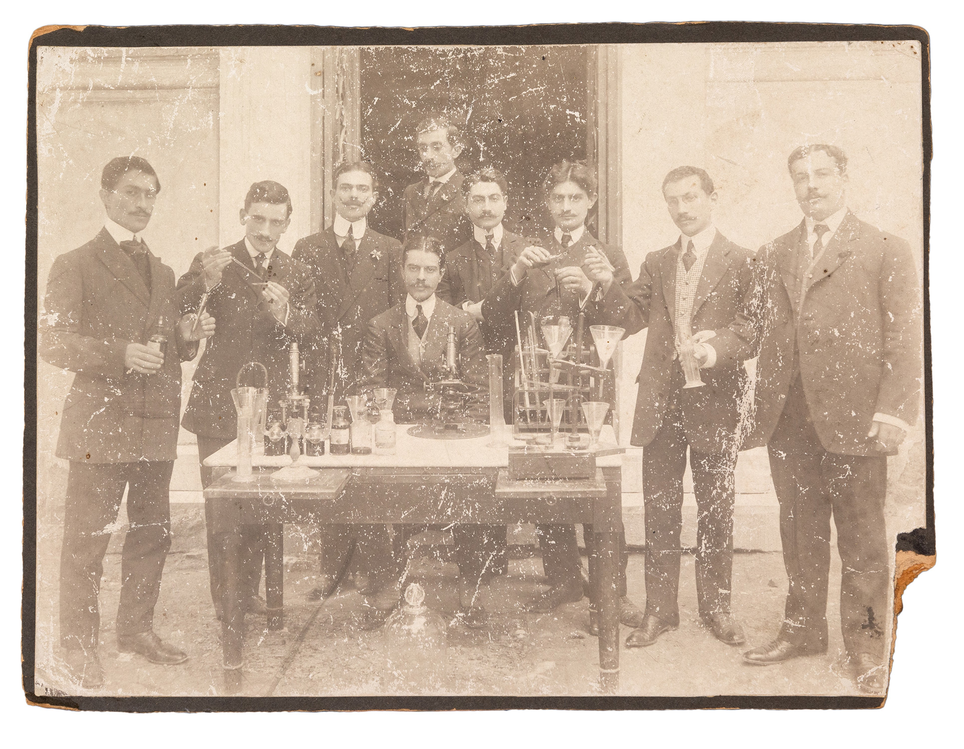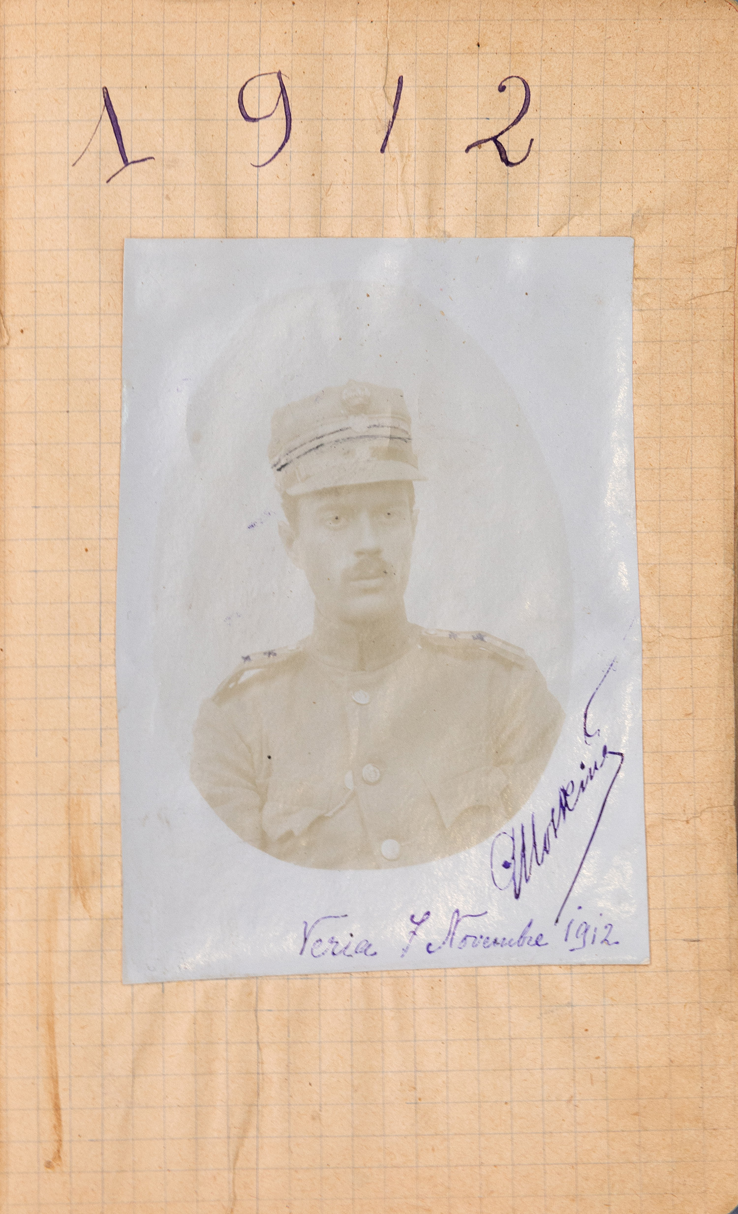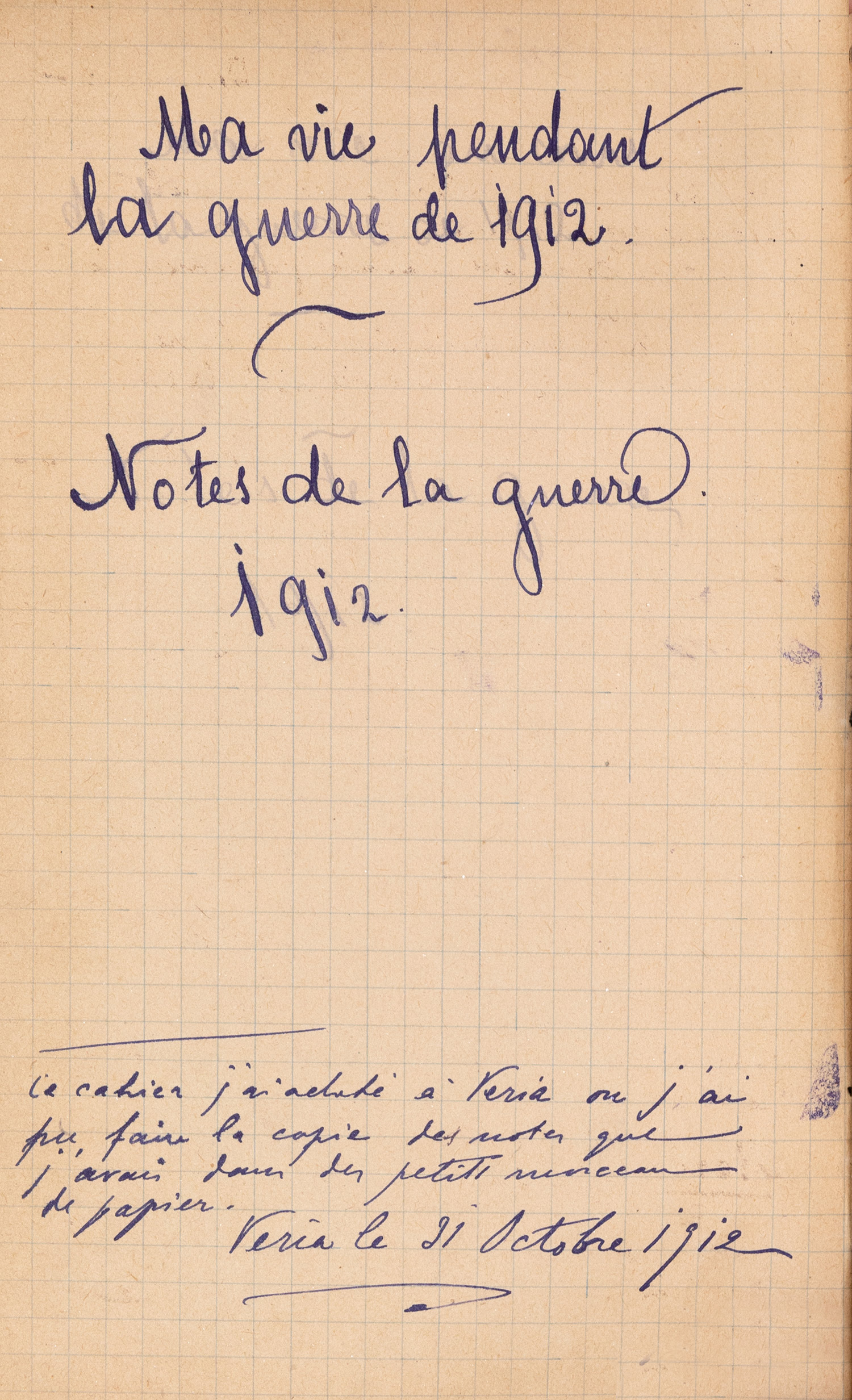 Τιμή εκτίμησης: € 800 - 1.200Γραμμένο με μελάνι και μολύβι σε τεύχος 44 φύλλων, 173 x 107 mm. Το κυρίως κείμενο στα φ. [9]-[38], τίτλος στο [8]v (“Ma vie pendant la guerre de 1912. Notes de la guerre 1912”), μικρή αναπαραγωγή φωτογραφίας του Ελ. Βενιζέλου επικολλημένη στο πρώτο φύλλο, πρωτότυπη φωτογραφία του Κοσκινά με την υπογραφή του στο δεύτερο φύλλο (“Veria 7 Novembre 1912”) και στα επόμενα φύλλα σημειώσεις, σφραγίδες (ταχυδρομικές της Βέροιας κ.ά.) και σκαρίφημα χάρτη με σημείωση της σιδηροδρομικής γραμμής Θεσσαλονίκης-Μοναστηρίου. Εύκαμπτα χαρτόνια. Μαζί μια καρτ ποστάλ με χειρόγραφες σημειώσεις (το γυμνάσιο της Βέροιας που μετατράπηκε σε στρατιωτικό νοσοκομείο) και 3 πρωτότυπες φωτογραφίες (πορτραίτο του Κοσκινά σε νεανική ηλικία και πολυπρόσωπες φωτογραφίες από πανεπιστημιακό εργαστήριο και το Μέτωπο). • Ο Γεώργιος Κοσκινάς συγκαταλέγεται, μαζί με τους Καραθεοδωρή και Παπανικολάου, στους κορυφαίους Έλληνες επιστήμονες του 20ού αιώνα.