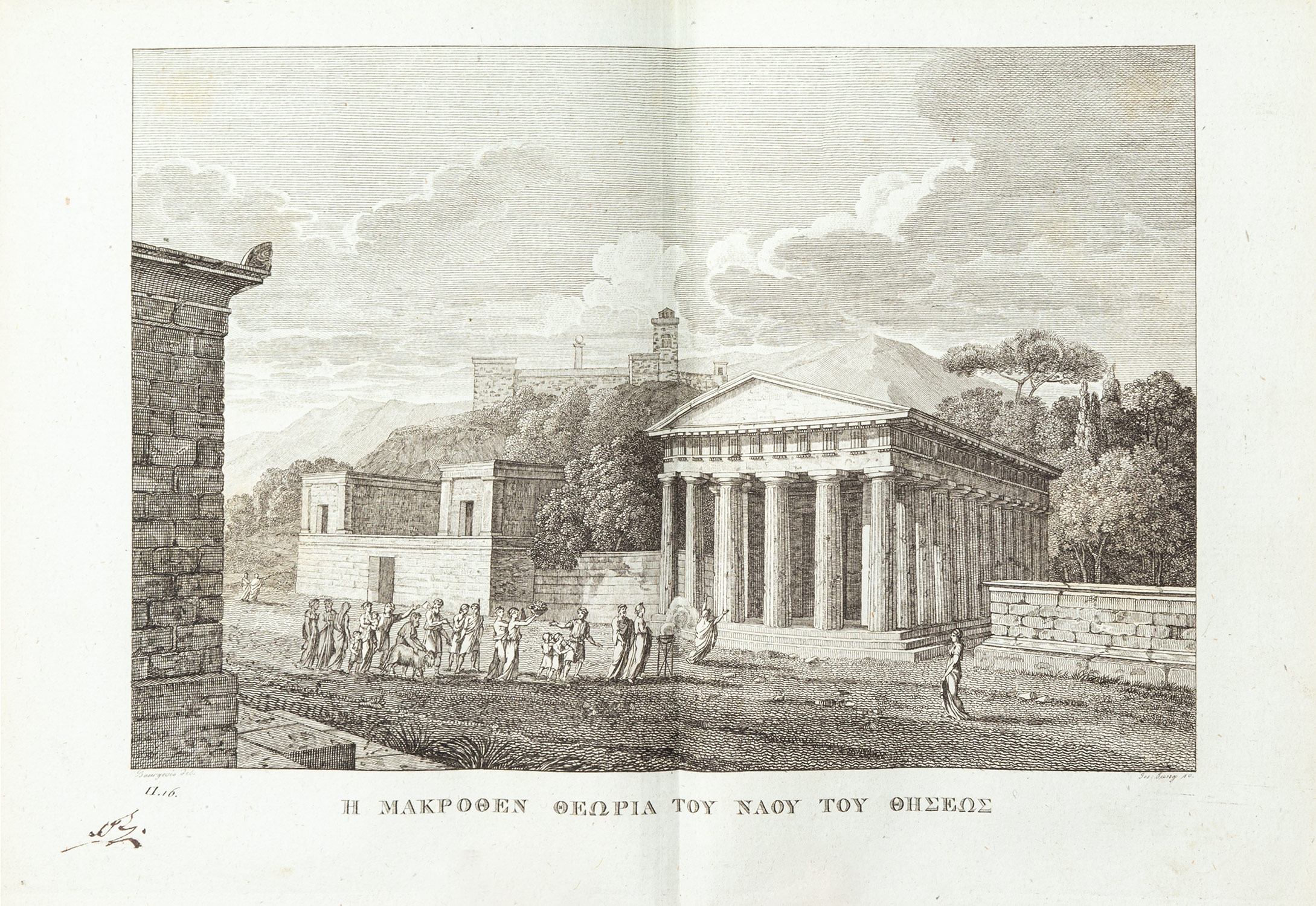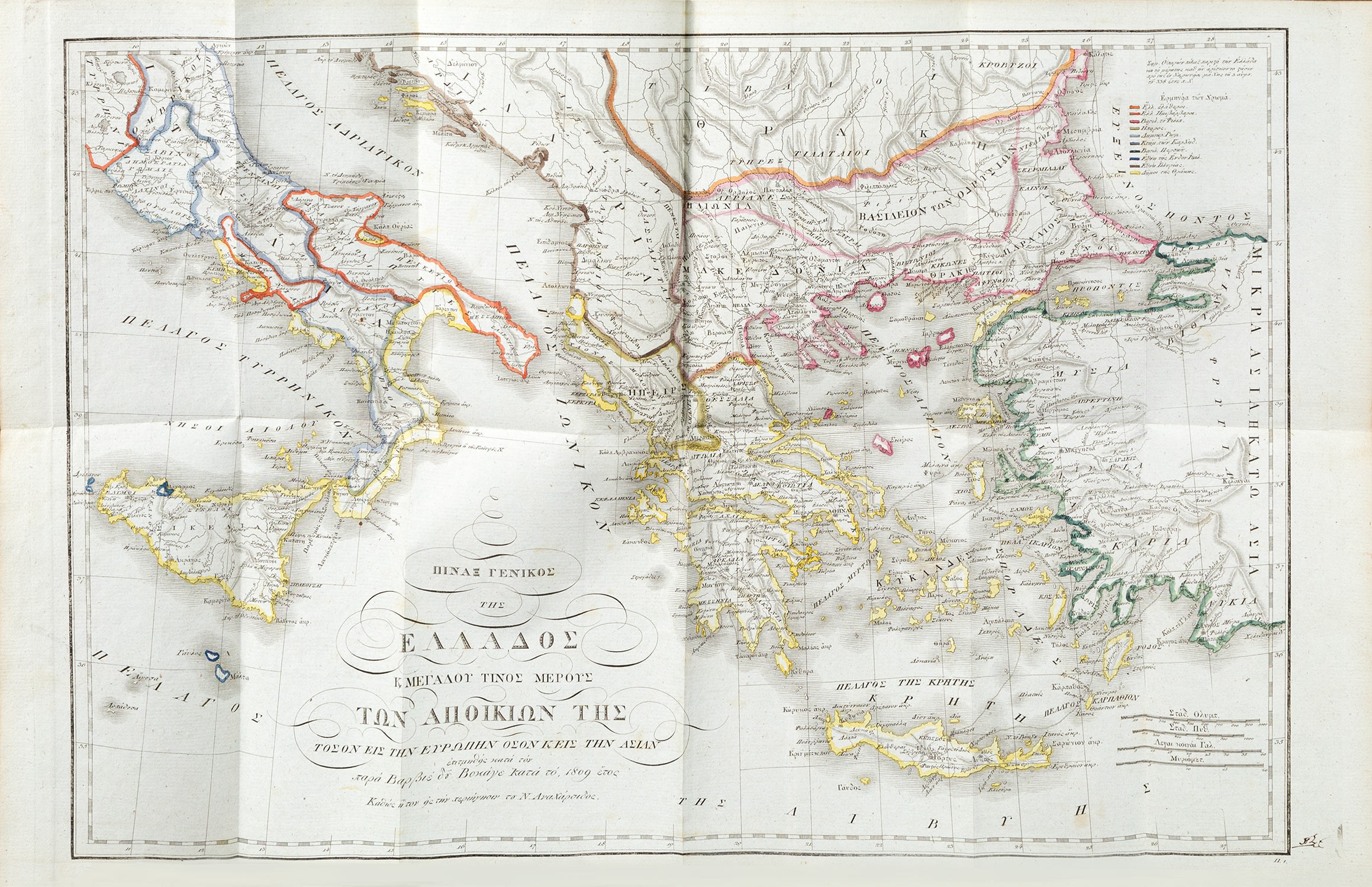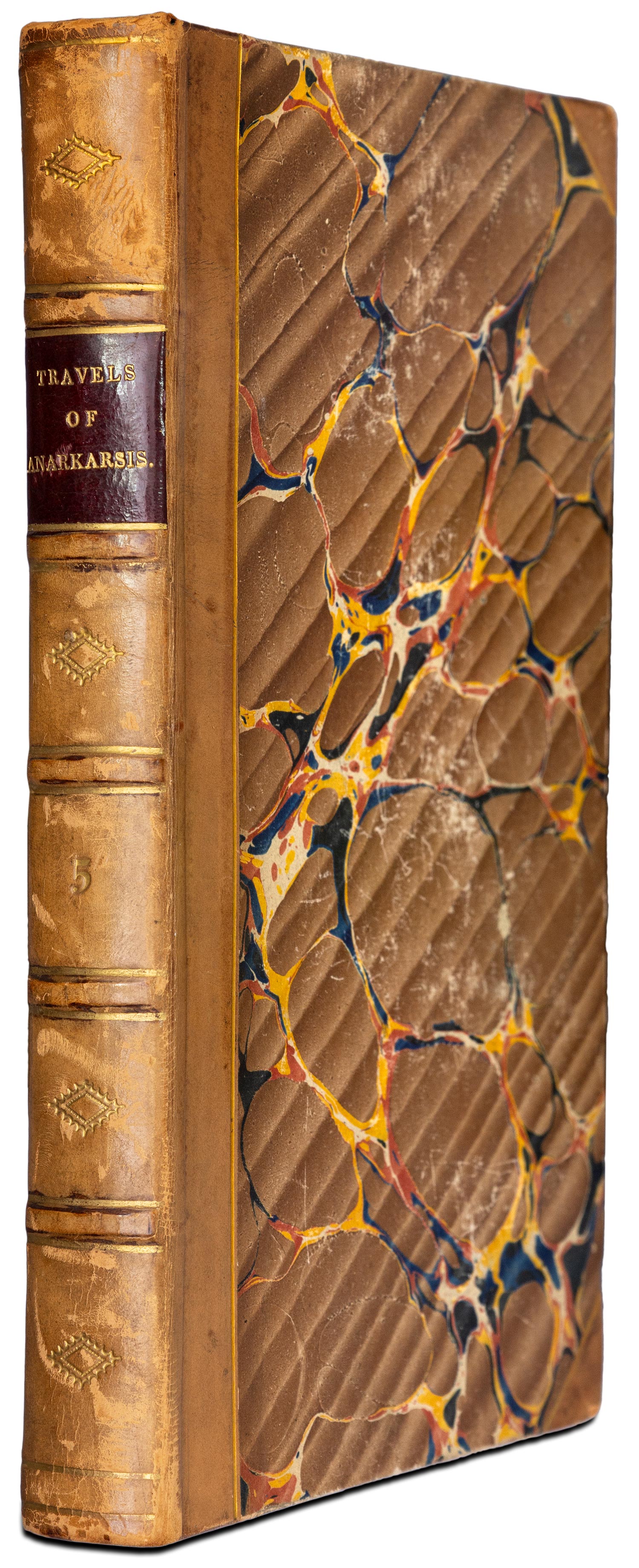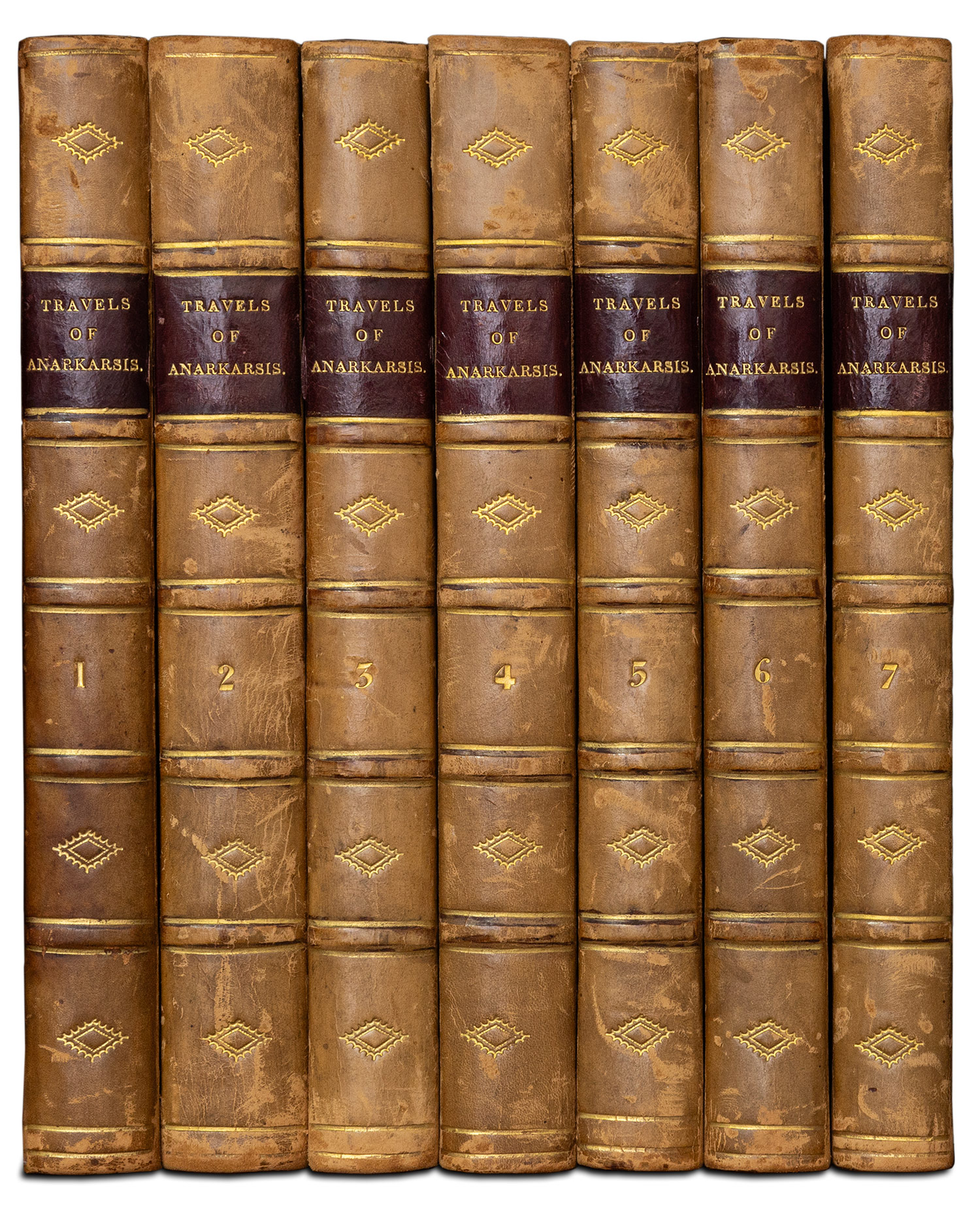Τιμή εκτίμησης: € 1.200 - 1.6007 τόμοι, 8ο, λα´ + [8] + 304, 415, 384, 390, 368, 350 και 355 σ. (ελαφρά οξειδωμένα λίγα φύλλα, κυρίως στον Ε´ τόμο). Χαλκόγραφοι τίτλοι με βινιέτες (μετάλλια), χαλκόγραφες προμετωπίδες σε όλους τους τόμους, κατάλογος συνδρομητών μεταξύ των σ. λα´ και [1] του Α´ τόμου. Μεταγενέστερη δερμάτινη ράχη με χρυσή διακόσμηση (μικρές φθορές κυρίως στα καλύμματα, μαρμαρογραφημένα τα καλύμματα, τα ακρόφυλλα και οι ακμές). Ηλιού 1819.105-11, Ελληνική Βιβλιοθήκη, 1422, Λαγανάς 669, Κασίνης 92-8. [μαζί, του ιδίου:] Ἄτλας τῆς Περιηγήσεως τοῦ Ν. Ἀναχάρσιδος, ἐπιτμηθείς κατά τόν παρά τοῦ Βαρβιέ δοῦ Βοκάγε, χαραχθείς τε καί τυπωθείς ἐν Βιέννῃ τῷ ΑΩΚ ἔτει. Βιέννη 1820. • 8o (204 x 153 mm.), (κτητορική σημείωση στον τίτλο και μονογραφή με μελάνι στο περιθώριο των πινάκων). Η μορφή με τις χαλκογραφίες αριθμημένες 1-34, αντίτυπο σε γαλάζιο χαρτί, δισέλιδος στοιχειοθετημένος τίτλος, 2 αναδιπλούμενοι χαλκόγραφοι χάρτες της Ελλάδας με τις αποικίες της (αρ. 1) και της Πελοποννήσου (αρ. 29) και 32 δισέλιδοι χαλκόγραφοι πίνακες (οι περισσότεροι χάρτες και τοπογραφικά). Δέρμα της εποχής της έκδοσης (φθορές, λείπει τμήμα της ράχης, σχισμένη η κάτω ένωση και εν μέρει η πάνω, σταμπωτά τα ακρόφυλλα). Ηλιού 1820.23. • Ο σπάνιος άτλας της μετάφρασης του Χρυσοβέργη Κουροπαλάτη. (8)