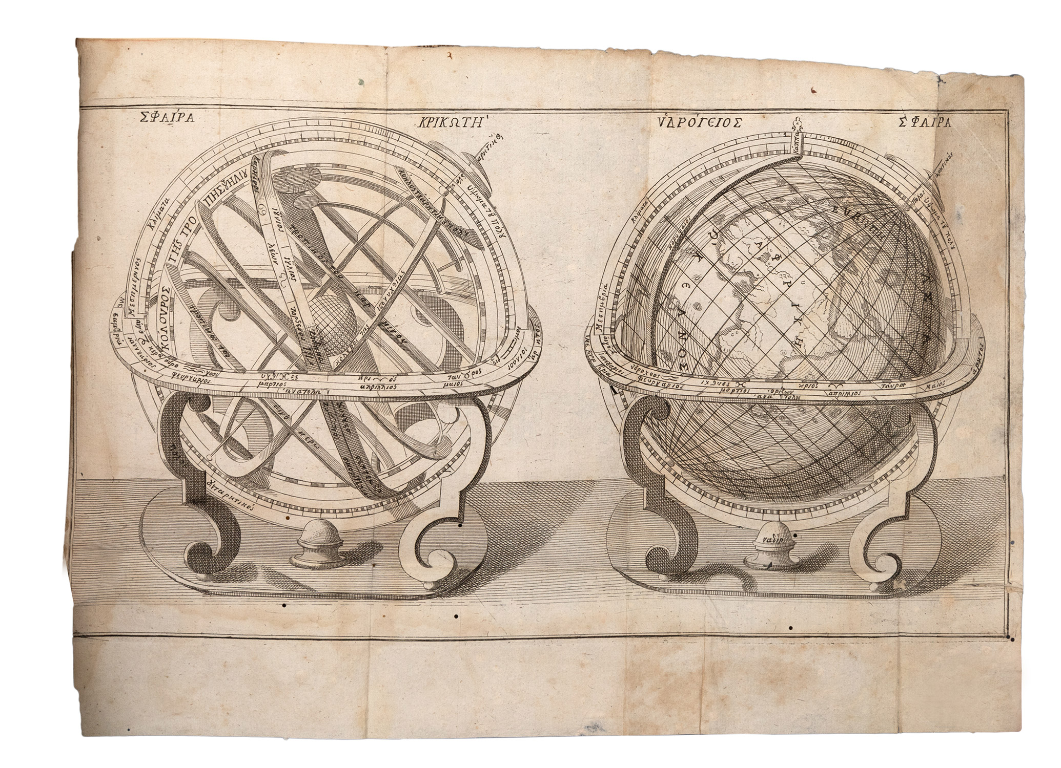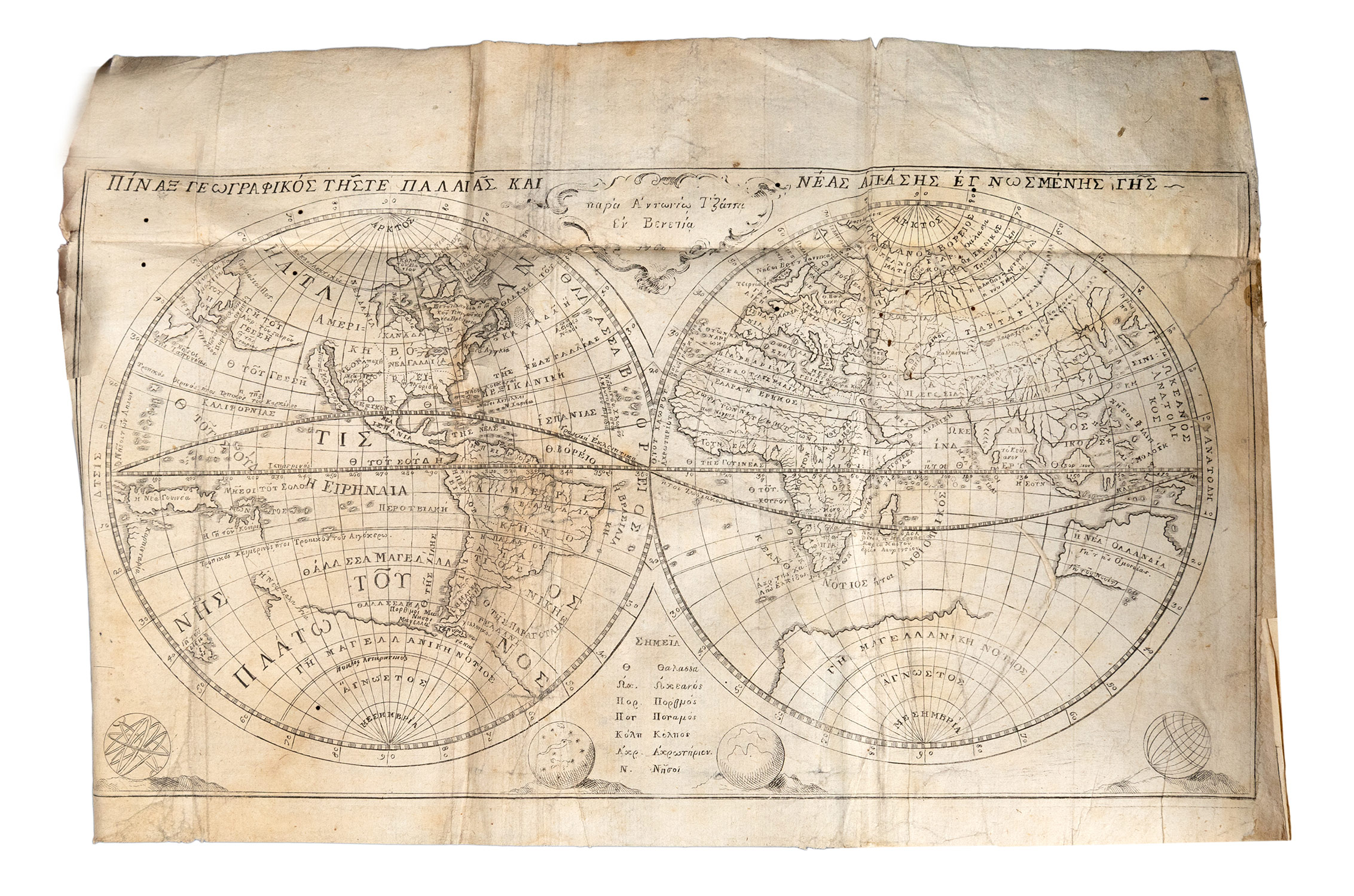 Τιμή εκτίμησης: € 800 - 1.2003 τόμοι, 8ο, οβ´ + 360, 448 και 476 σ. (τρύπες από έντομο, λεκέδες από νερό, οξείδωση, λάθος διπλωμένο το τεύχος Bb του τρίτου τόμου). Δίχρωμος ο τίτλος του πρώτου τόμου, ξυλόγραφα επίτιτλα και βινιέτες, με 2 αναδιπλούμενες χαλκογραφίες («Πίναξ γεωγραφικός τῆς τε παλαιᾶς καί νέας ἁπάσης ἐγνωσμένης Γῆς» και «Σφαῖρα κρικωτή – Ὑδρόγειος σφαῖρα»). Νεότερη δερμάτινη ράχη. Legrand (18ος αι.) 546. (3)