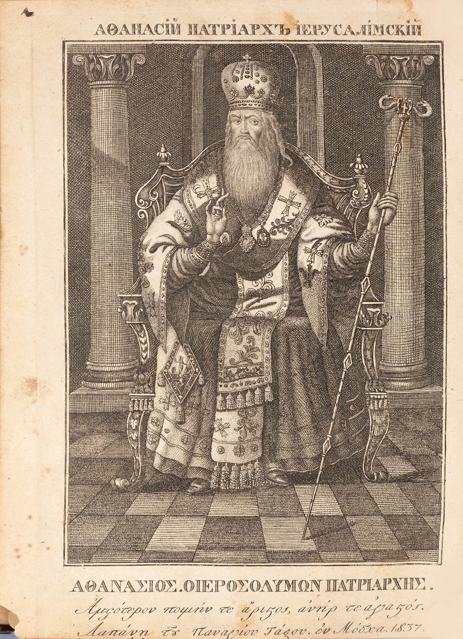 Τιμή εκτίμησης: € 240 - 350μικρό 4ο, VII + 136 σ. (λίγο λερωμένο αντίτυπο). Χαλκόγραφη προμετωπίδα (πορτραίτο του πατριάρχη Ιεροσολύμων Αθανασίου), 3 (από τις 4) αναδιπλούμενες λιθόγραφες κατόψεις και 27 χαλκόγραφοι πίνακες με θέματα από τους Αγίους Τόπους (λεζάντες στα ελληνικά και ρωσικά ή μόνο στα ελληνικά). Δερμάτινη ράχη της εποχής της έκδοσης (φθορές). Γκίνης & Μέξας, 2884. • Σε άλλα αντίτυπα οι περισσότερες λεζάντες είναι μόνο στα ρωσικά.