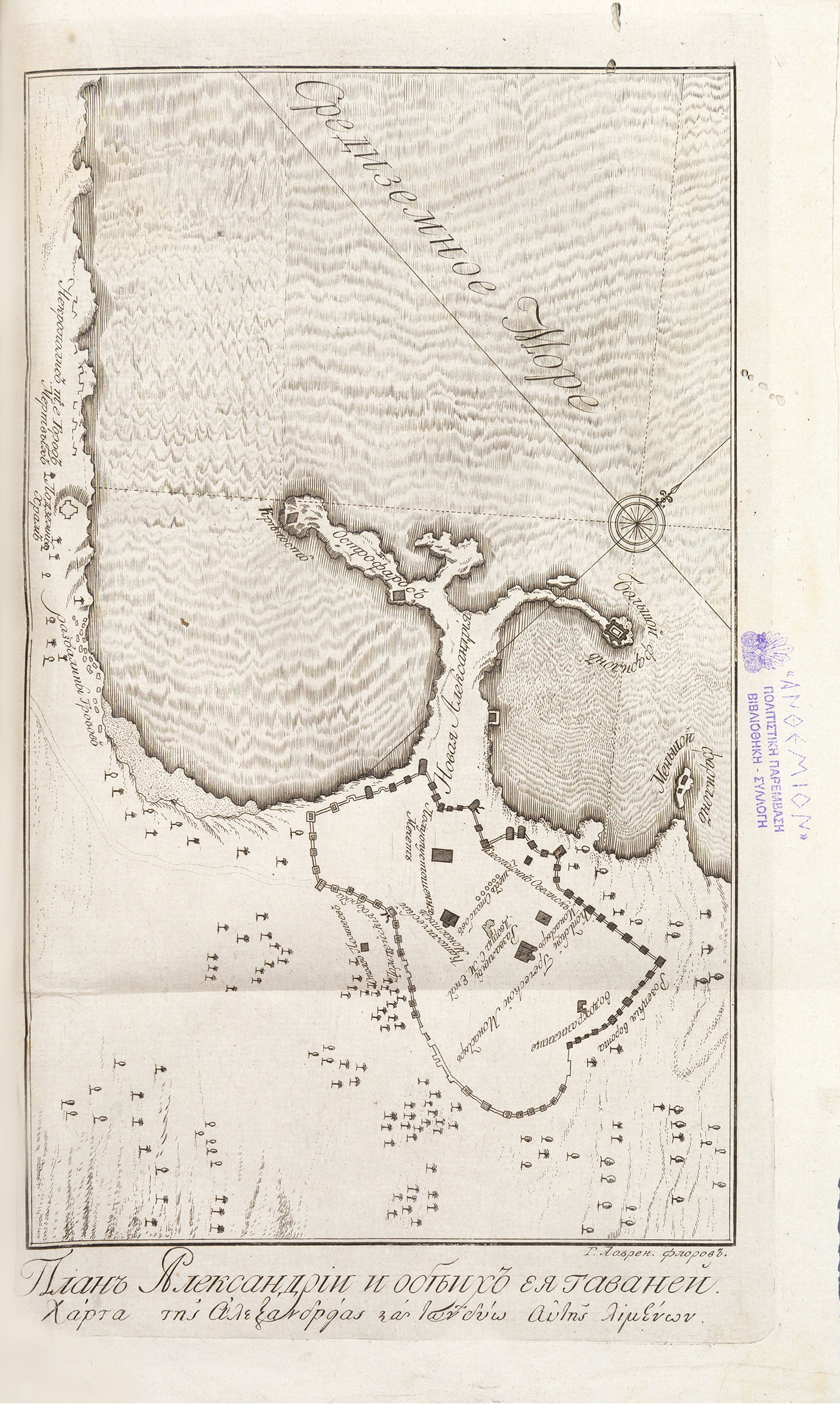 Τιμή εκτίμησης: € 500 - 7004ο, VII + 67 σ. (τρύπες από έντομο σε μερικά φύλλα και στο πάνω περιθώριο των πινάκων, λείπει μικρό τμήμα από το κάτω περιθώριο ενός φύλλου: σ. 35-36, σφραγίδα στον ψευδότιτλο, τον τίτλο, στο δεύτερο φύλλο των παροραμάτων και στο εξωτερικό περιθώριο των πινάκων). Τίτλος και κείμενο στα ρωσικά και ελληνικά σε αντικριστές σελίδες, μεγάλα χαλκόγραφα επίτιτλα στις σ. 2, 42 & 50, ξυλόγραφα πρωτογράμματα, 4 αναδιπλούμενοι χαλκόγραφοι πίνακες στο τέλος (ο πρώτος: «Χάρτα τῆς Ἀλεξανδρείας καί τῶν δύω αὐτῆς λιμένων»). Δερμάτινη ράχη της εποχής της έκδοσης (λείπει μεγάλο τμήμα της ράχης, φθορές στα καλύμματα). Ηλιού 1803.17.