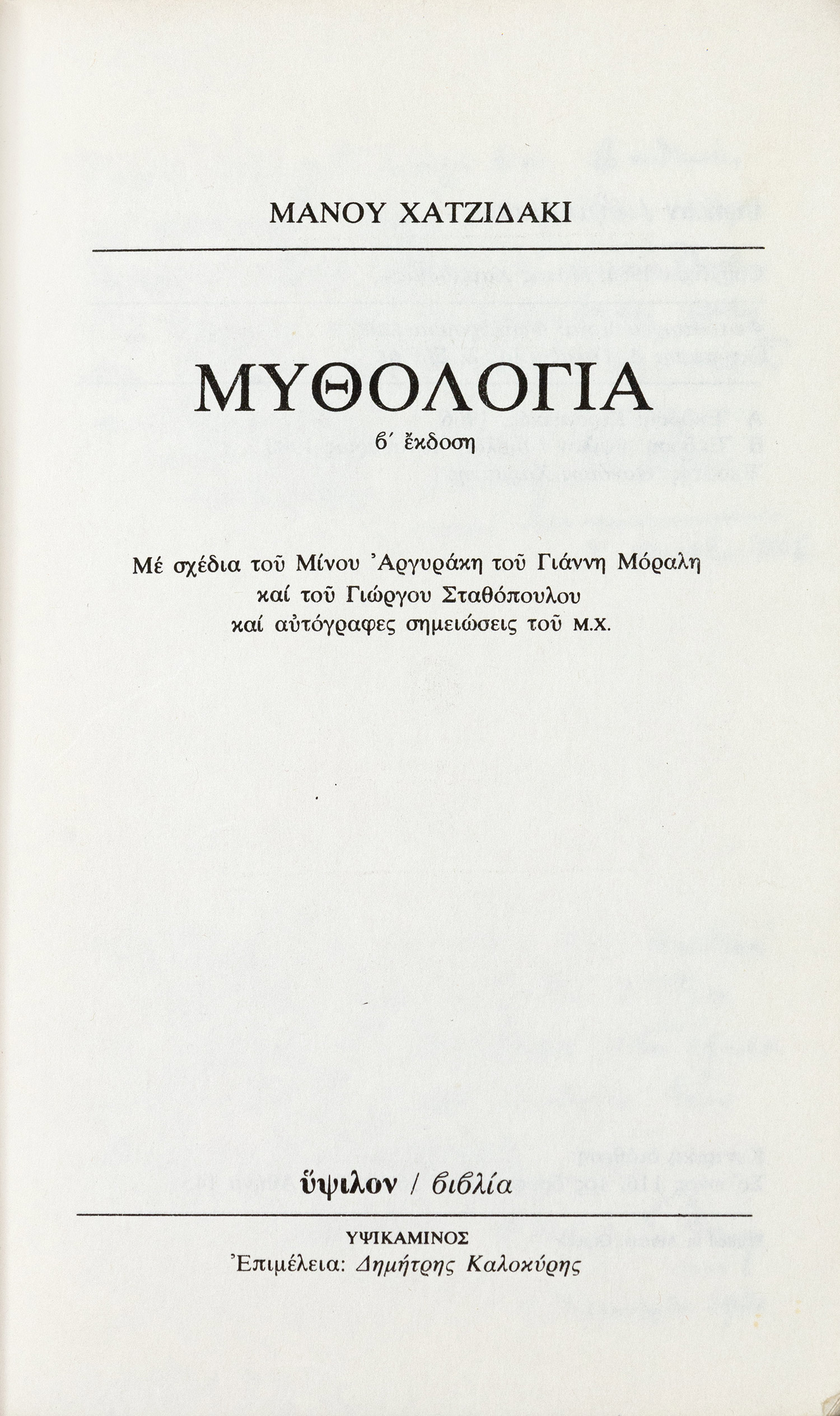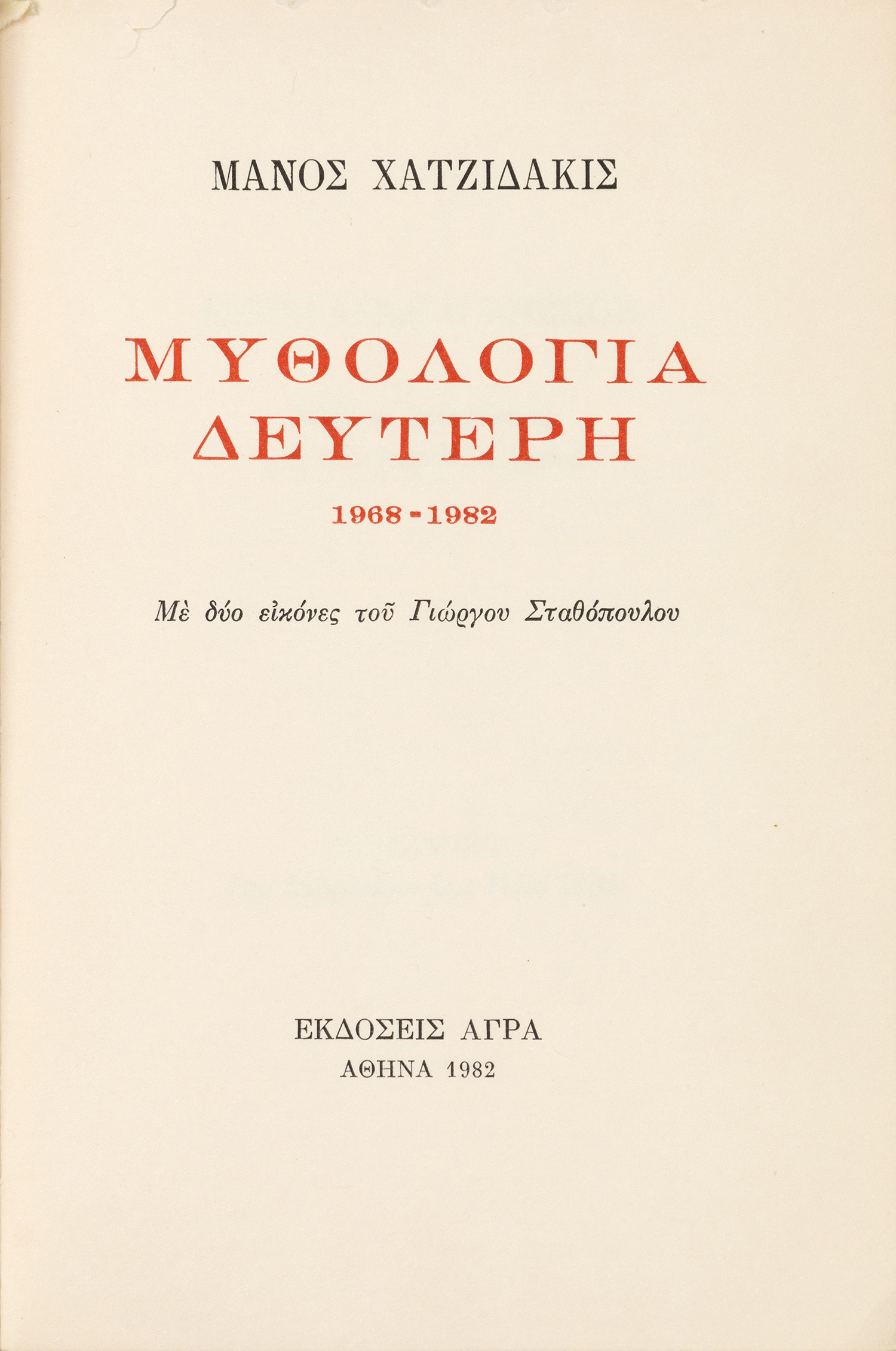 Τιμή εκτίμησης: € 150 - 200ΠΡΩΤΗ ΕΚΔΟΣΗ. 87 σ. Με 2 έγχρωμες αναπαραγωγές έργων του Γ. Σταθόπουλου (σ. 53 & 77), αντίτυπο με ιδιόχειρη αφιέρωση («Στόν Βασίλη Βασιλικό / πού συνυπήρξε στήν πρώτη / Μυθολογία μου ἰσχυρά / βόρειος καί γαλατικός. / μέ τήν ἀγάπη μου / Μάνος Χατζιδάκις / Χριστούγεννα ᾽82»). Αρχικά εξώφυλλα (λίγο λερωμένα, μικρές φθορές, σπασμένη η πάνω σύνδεση). [μαζί, του ιδίου:] Μυθολογία, β´ έκδοση, μέ σχέδια τοῦ Μίνου Ἀργυράκη, τοῦ Γιάννη Μόραλη καί τοῦ Γιώργου Σταθόπουλου καί αὐτόγραφες σημειώσεις τοῦ Μ.Χ. Αθήνα, Ύψιλον / βιβλία, 1980. • 91 σ. Αντίτυπο με ιδιόχειρη αφιέρωση («Στόν Βασίλη [Βασιλικό] / μ’ ὅλη μου τήν ἀγάπη / Μάνος / 14.03.1980»). Αρχικά εξώφυλλα (λίγο λερωμένα, τσακίσεις στο πάνω). (2)