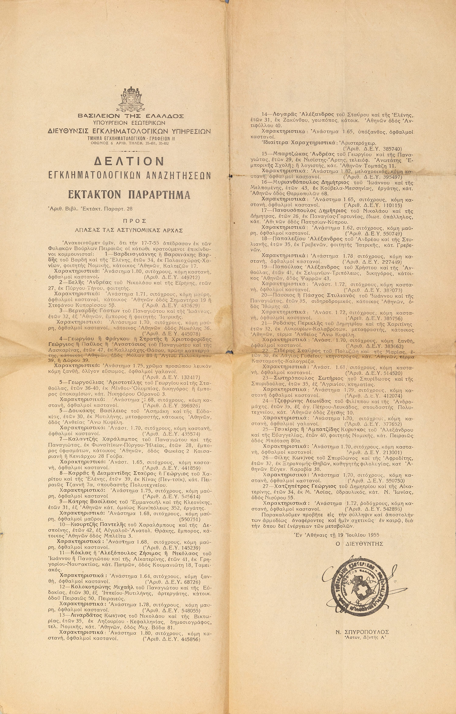 ΑΠΟΔΡΑΣΗ ΤΩΝ ΒΟΥΡΛΩΝ — ΒΑΣΙΛΕΙΟΝ ΤΗΣ ΕΛΛΑΔΟΣ. ΥΠΟΥΡΓΕΙΟΝ ΕΣΩΤΕΡΙΚΩΝ. ΔΙΕΥΘΥΝΣΙΣ ΕΓΚΛΗΜΑΤΟΛΟΓΙΚΩΝ ΥΠΗΡΕΣΙΩΝ. [...] ΔΕΛΤΙΟΝ ΕΓΚΛΗΜΑΤΟΛΟΓΙΚΩΝ ΑΝΑΖΗΤΗΣΕΩΝ. ΕΚΤΑΚΤΟΝ ΠΑΡΑΡΤΗΜΑ. Ἀριθ. Βιβλ. Ἐκτάκτ. Παραρτ. 28. ΠΡΟΣ ΑΠΑΣΑΣ ΤΑΣ ΑΣΤΥΝΟΜΙΚΑΣ ΑΡΧΑΣ. Ἀνακοινοῦμεν ὑμίν, ὅτι τήν 17-7-55 ἀπέδρασαν ἐκ τῶν Φυλακῶν Βούρλων Πειραιῶς οἱ κάτωθι κρατούμενοι ἐπικίνδυνοι κομμουνισταί: 1— Βαρδινογιάννης ἤ Βαρσινάκης Βαρδῆς τοῦ Βαρδῆ καί τῆς Ἑλένης, ἐτῶν 34, ἐκ Παλαιοχώρας-Χανίων, φοιτητής Νομικῆς, κάτοικος Ἀθηνῶν, Καλτεζῶν 17. Χαρακτηριστικά: Ἀνάστημα 1,80, σιτόχρους, κόμη καστανή, ὀφθαλμοί καστανοί. (Αριθ. Δ.Ε.Υ. 449212). 2—Βελῆς Ἀνδρέας τοῦ Νικολάου καί τῆς Εἰρήνης, ἐτῶν 27, ἐκ Πύργου Τήνου, φοιτητής. Χαρακτηριστικά: Ἀνάστημα 1,71, σιτόχρους, κόμη μαύρη, ὀφθαλμοί καστανοί, κάτοικος Ἀθηνῶν ὁδός Σημαντήρα 19 ἤ Στεφάνου Κυπαρίσσου 5β. (Αριθ. Δ.Ε.Υ. 437629). 3—Βερναρδῆς Γάστων τοῦ Παναγιώτου καί τῆς Ἱωάννας, ἐτῶν 32, ἐξ Ἀθηνῶν, ἔμπορος ἤ φοιτητἠς Ἰατρικῆς. Χαρακτηριστικά: Ἀνάστημα 1,70, σιτόχρους, κόμη μαύρη, ὀφθαλμοί καστανοί, κάτοικος Ἀθηνῶν ὁδός Μυκάλης 36. (Αριθ. Δ.Ε.Υ. 445078). ... [τελειώνει:] Παρακαλοῦμεν προβῆτε εἰς τήν σύλληψιν καί ἀποστολήν των ἀρμοδίως ἀναφέροντες καί ἡμῖν σχετικῶς ἐν καιρῷ, διά τήν ὅπου δεῖ ἐνέργειαν τῶν μεταβολῶν. Ἐν Ἀθήναις τῇ 19 Ἰουλίου 1955. Ο ΔΙΕΥΘΥΝΤΗΣ Ν. ΣΠΥΡΟΠΟΥΛΟΣ Ἀστυν. Δ/ντής Α´.