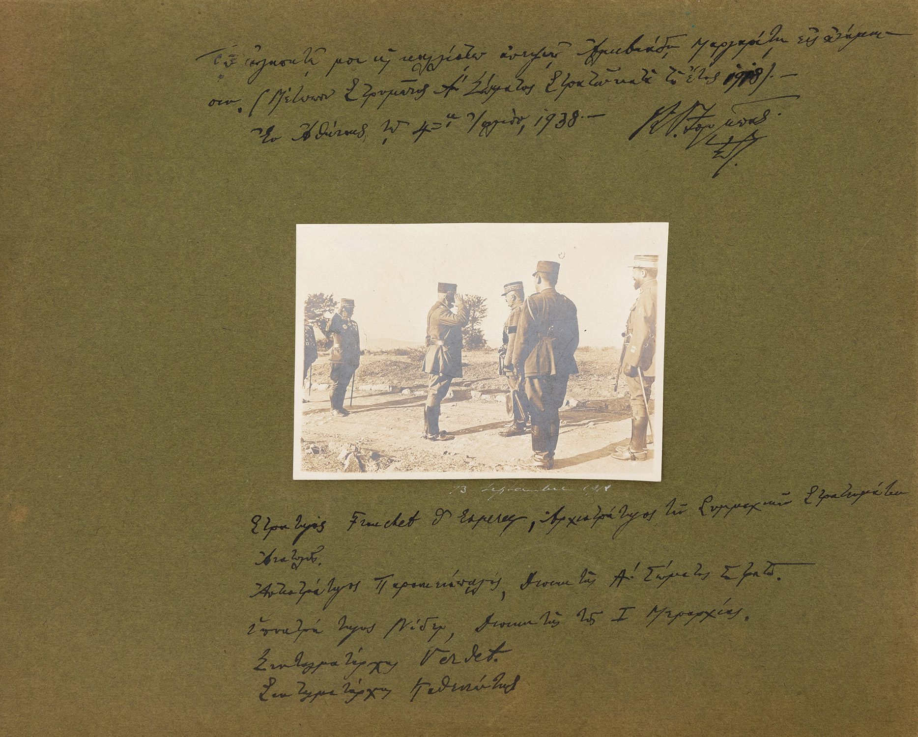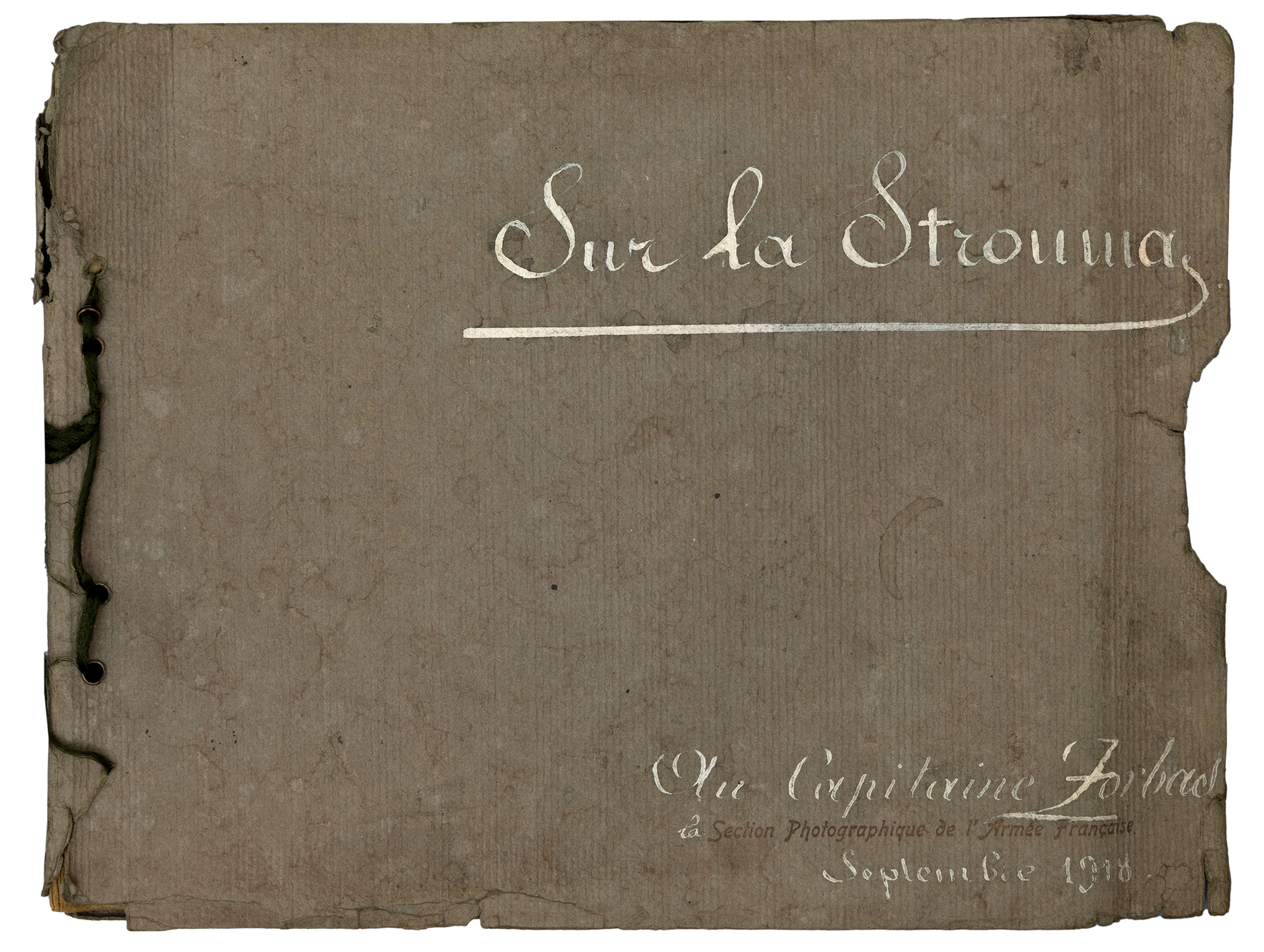 l’Armée Française», χειρόγραφο τίτλο, αφιέρωση και χρονολογία («Sur la Strouma / Au Capitaine Zorbas / Septembre 1918») στο πάνω κάλυμμα), πλάγιο 8ο (238 x 292 mm.). • Περιλαμβάνει πολυπρόσωπα πορτραίτα ανώτατων αξιωματικών και φωτογραφίες της περιοχής (αρκετές από τη Νιγρίτα).