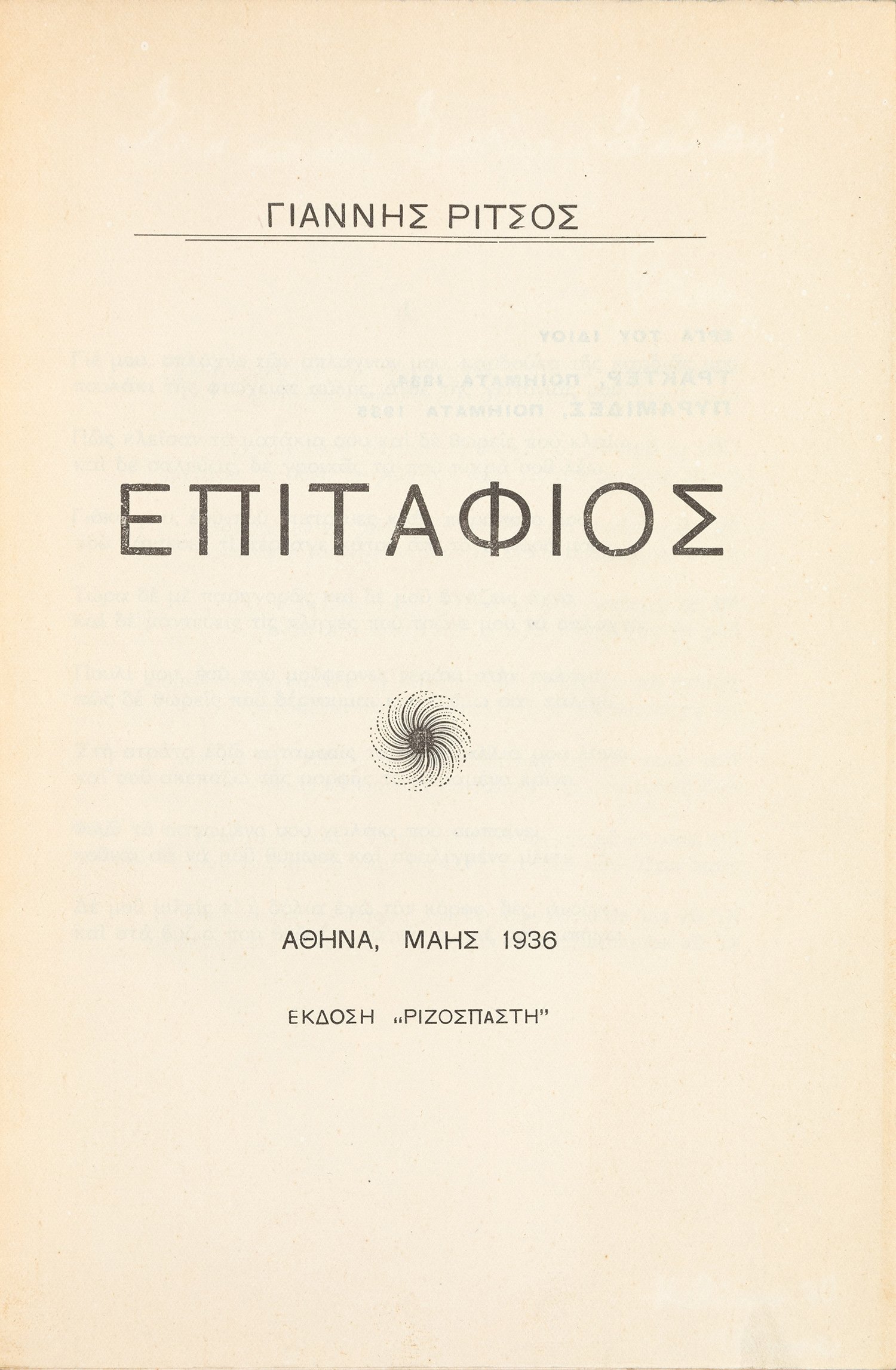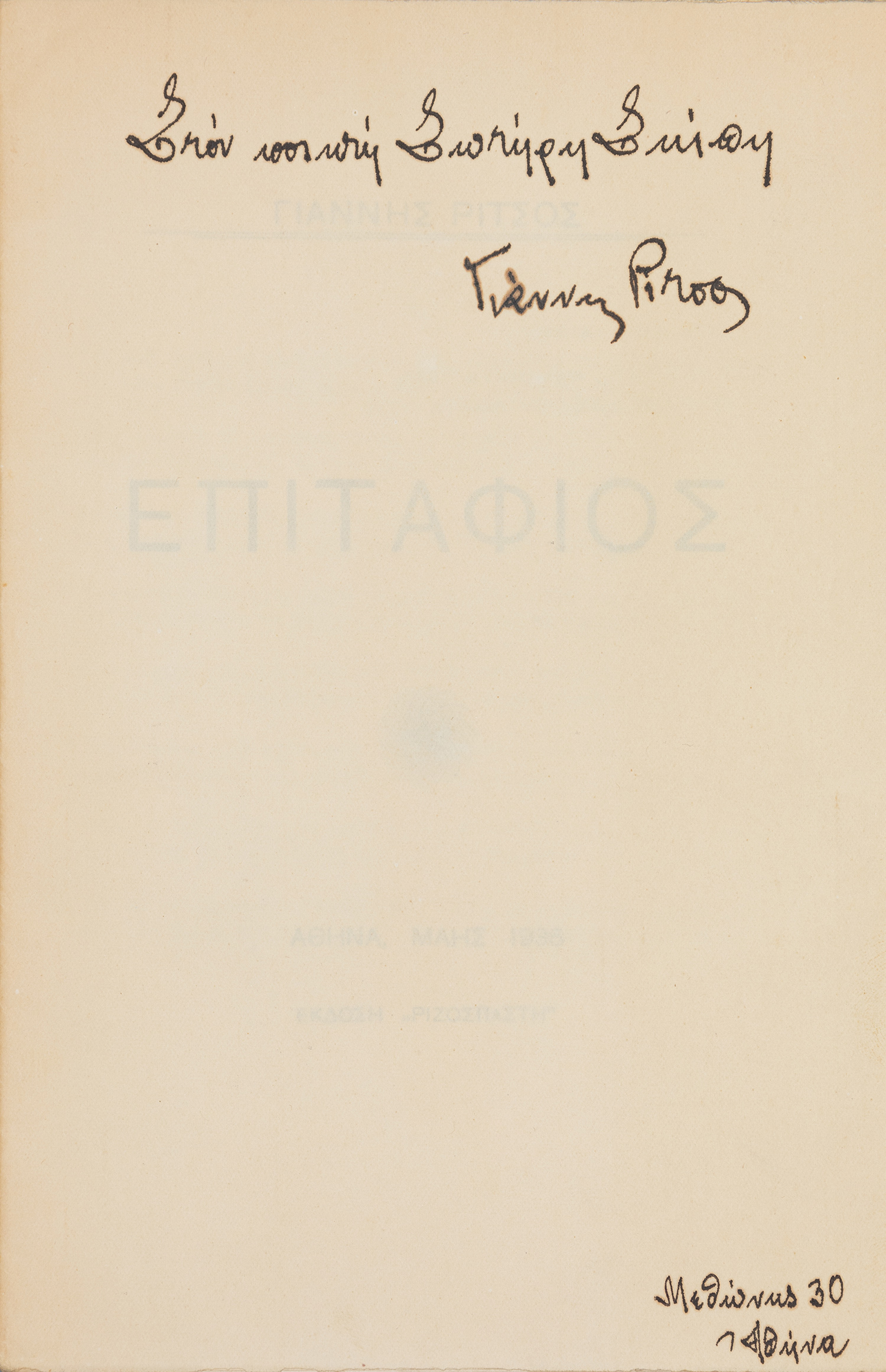Τιμή εκτίμησης: € 300 - 400ΠΡΩΤΗ ΕΚΔΟΣΗ. [20] σ. Αντίτυπο με ιδιόχειρη αφιέρωση στον Σ. Σκίπη («Στόν ποιητή Σωτήρη Σκίπη / Γιάννης Ρίτσος / [κάτω:] Μεθώνης 30 / Ἀθήνα»). Αρχικά εικονογραφημένα εξώφυλλα (ξυλογραφία του Γ. Λυδάκη στο πάνω). • Η πρώτη έκδοση του εμβληματικού ποιήματος του Γ. Ρίτσου, εμπνευσμένου από τον θρήνο της μητέρας του αυτοκινητιστή Τάσου Τούση, που έπεσε νεκρός από σφαίρες αστυνομικών κατά τη διάρκεια των εργατικών κινητοποιήσεων στη Θεσσαλονίκη τον Μάιο του 1936. Περιέχει 14 άσματα, ενώ η οριστική δεύτερη έκδοση του 1956 συμπληρώθηκε με ακόμα έξι.