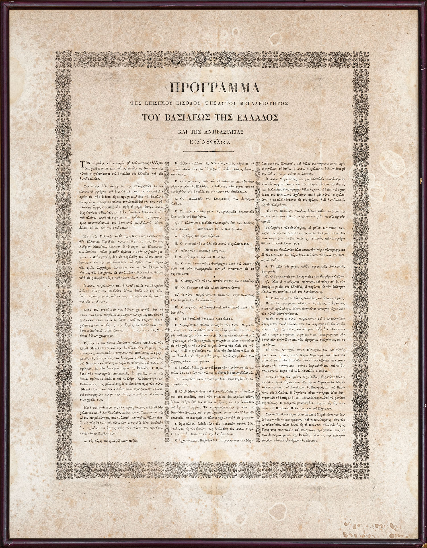 ΕΙΣΟΔΟΣ ΟΘΩΝΑ ΣΤΟ ΝΑΥΠΛΙΟ — ΠΡΟΓΡΑΜΜΑ ΤΗΣ ΕΠΙΣΗΜΟΥ ΕΙΣΟΔΟΥ ΤΗΣ ΑΥΤΟΥ ΜΕΓΑΛΕΙΟΤΗΤΟΣ ΤΟΥ ΒΑΣΙΛΕΩΣ ΤΗΣ ΕΛΛΑΔΟΣ ΚΑΙ ΤΗΣ ΑΝΤΙΒΑΣΙΛΕΙΑΣ Εἰς Ναύπλιον. Τήν τετράδην, 25 Ἰανουαρίου (6 Φεβρουαρίου) 1833, θέλει γενῆ ἡ μετά παρατάξεως εἴσοδος εἰς Ναύπλιον τῆς Αὐτοῦ Μεγαλειότητος τοῦ Βασιλέως τῆς Ἑλλάδος καί τῆς Ἀντιβασιλείας. Τήν αὐγήν θέλει ἀναγγείλει τήν πανηγυρικήν ταύτην εἴσοδον τό φρούριον τοῦ Ἰτζκαλέ μέ εἴκοσι ἕνα κανονοβολισμόν· εἰς τάς ἕνδεκα ὥρας πρό μεσημβρίας τά Βασιλικά Βαυαρικά στρατεύματα θέλουν τοποθετηθῆ ἐπί τῆς ἀπό Ναύπλιον εἰς Ἄργος φερούσης ὁδοῦ πρός τό μέρος, ὅπου ἡ Αὐτοῦ Μεγαλειότης ὁ Βασιλεύς καί ἡ Ἀντιβασιλεία θέλουσιν ἀποβῆ τοῦ πλοίου. Ἀφοῦ τά στρατεύματα ἔμβωσιν εἰς γραμμήν, τρεῖς κανονοβολισμοί τοῦ Βαυαρικοῦ πυροβολικοῦ θέλουν δώσει τό σημεῖον τῆς ἀποβάσεως... [τελειώνει:] Τήν ἀκόλουθον ἡμέραν θέλει κάμει ἡ Μεγαλειότης του ἐπιθεώρησιν τῶν στρατευμάτων, καί περικυκλωμένος ἀπό τήν Ἀντιβασιλείαν θέλει δεχθῆ εἰς τό Παλάτιον ἀλληλοδιαδόχως ὅλους τούς πολιτικούς καί πολεμικούς προὔχοντας τούς ἐκ τῶν διαφόρων μερῶν τῆς Ἑλλάδος, ὅσοι εἰς τήν ἐπίσημον εἴσοδον ἔδωσαν τόν ὅρκον τῆς πίστεως.