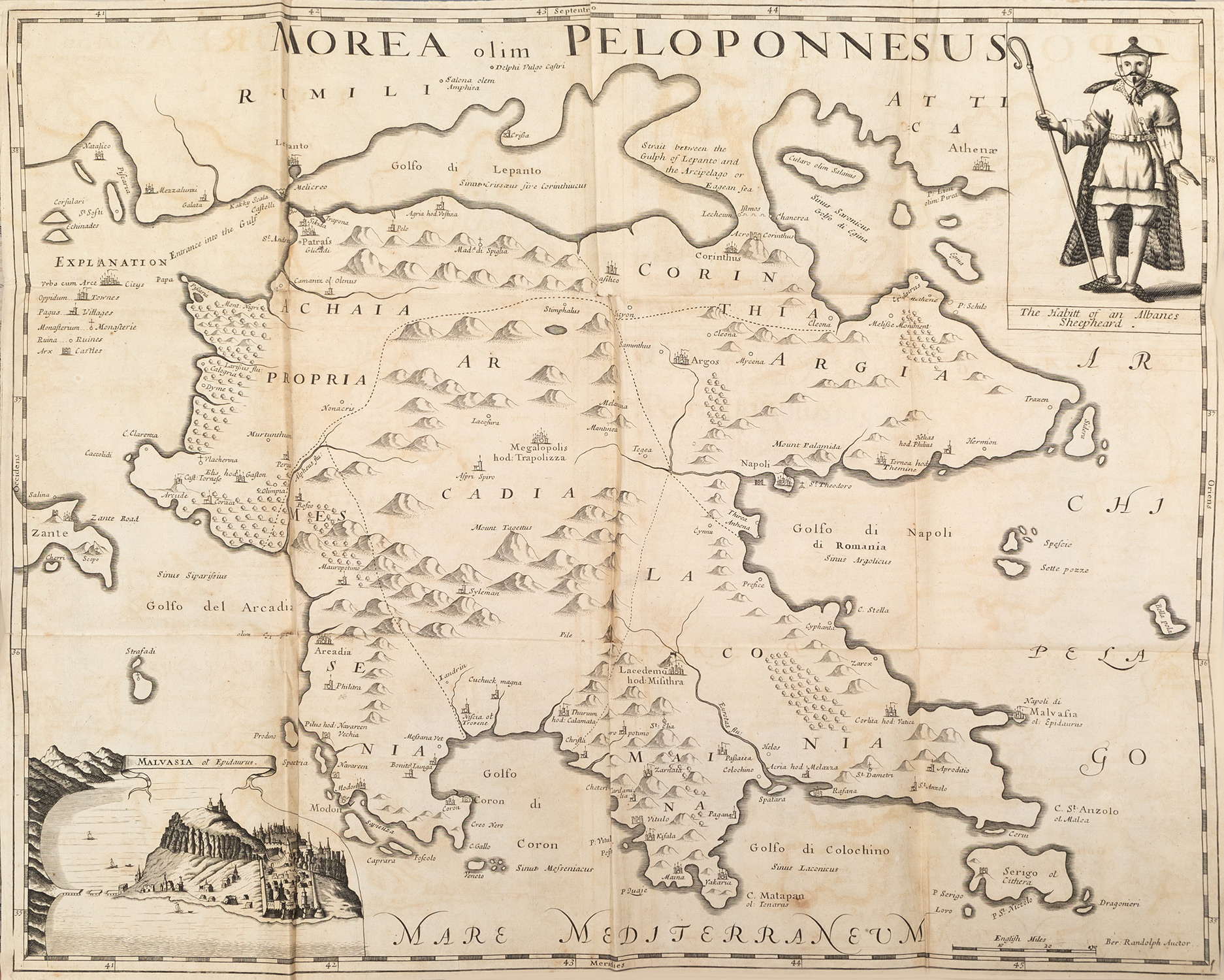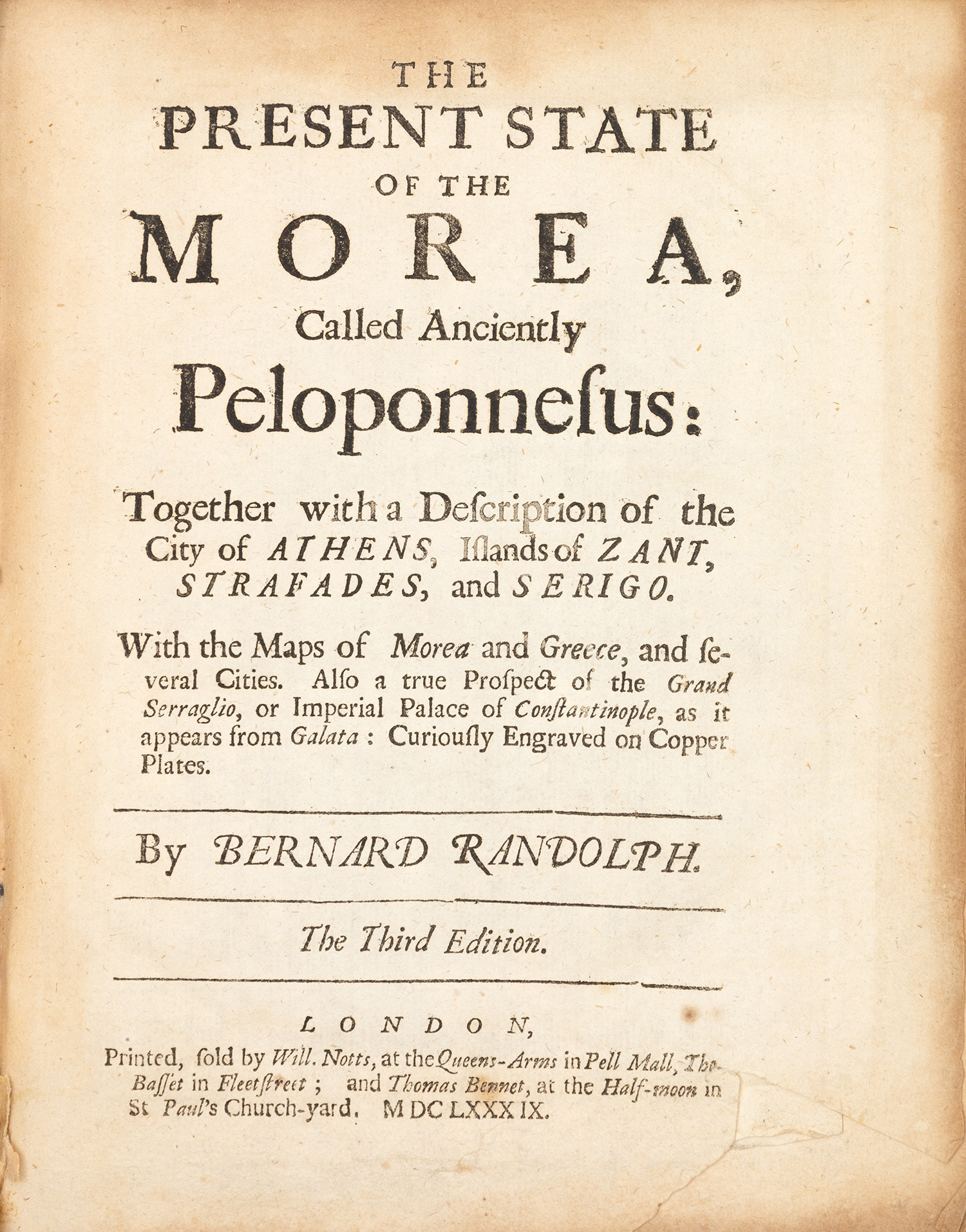 Τιμή εκτίμησης: € 3.000 - 4.000μικρό 4ο, 209 x 160 mm., 26 σ. (λείπει μικρό τμήμα από την κάτω δεξιά γωνία του τίτλου, ομοιόμορφα οξειδωμένο αντίτυπο, μικρά σχισίματα στον ένα χάρτη, ένα μεγαλύτερο στον άλλο, μία χαλκογραφία δεμένη μαζί με το άλλο έργο). Με 2 αναδιπλούμενους χαλκόγραφους χάρτες («Morea, olim Peloponnesus» και η δεύτερη από τις τρεις μορφές του «Greece with part of Anatolia») και 3 αναδιπλούμενες χαλκογραφίες ([Κόρινθος], «Misithra, olim Lacedimon» και «The Prospect of the Grand Serraglio»). Δέρμα της εποχής της έκδοσης (φθορές). Blackmer 1385, Atabey 1012, Weber, II, 388, Zacharakis 2882. [δεμένο μαζί, του ιδίου:] The present state of the Islands in the Archipelago, (or Arches), Sea of Constantinople, and Gulph of Smyrna; with the Islands of Candia, and Rhodes. To which is annexed an Index, shewing the Longitude and Latitude of all the places in the new Map of Greece lately published by the same author. Οξφόρδη, J. Venn, 1687. • μικρό 4o, 108 σ. (ελαφρά οξειδωμένα λίγα φύλλα, σχίσιμο και σημάδι από σελοτέιπ σε έναν πίνακα). Με 3 αναδιπλούμενες χαλκογραφίες («Negroponte», «A Greek priest / A woman of the Archipelago» και «Tenedos»). Blackmer 1386, Atabey 1013, Weber, II, 389, Contominas 601.