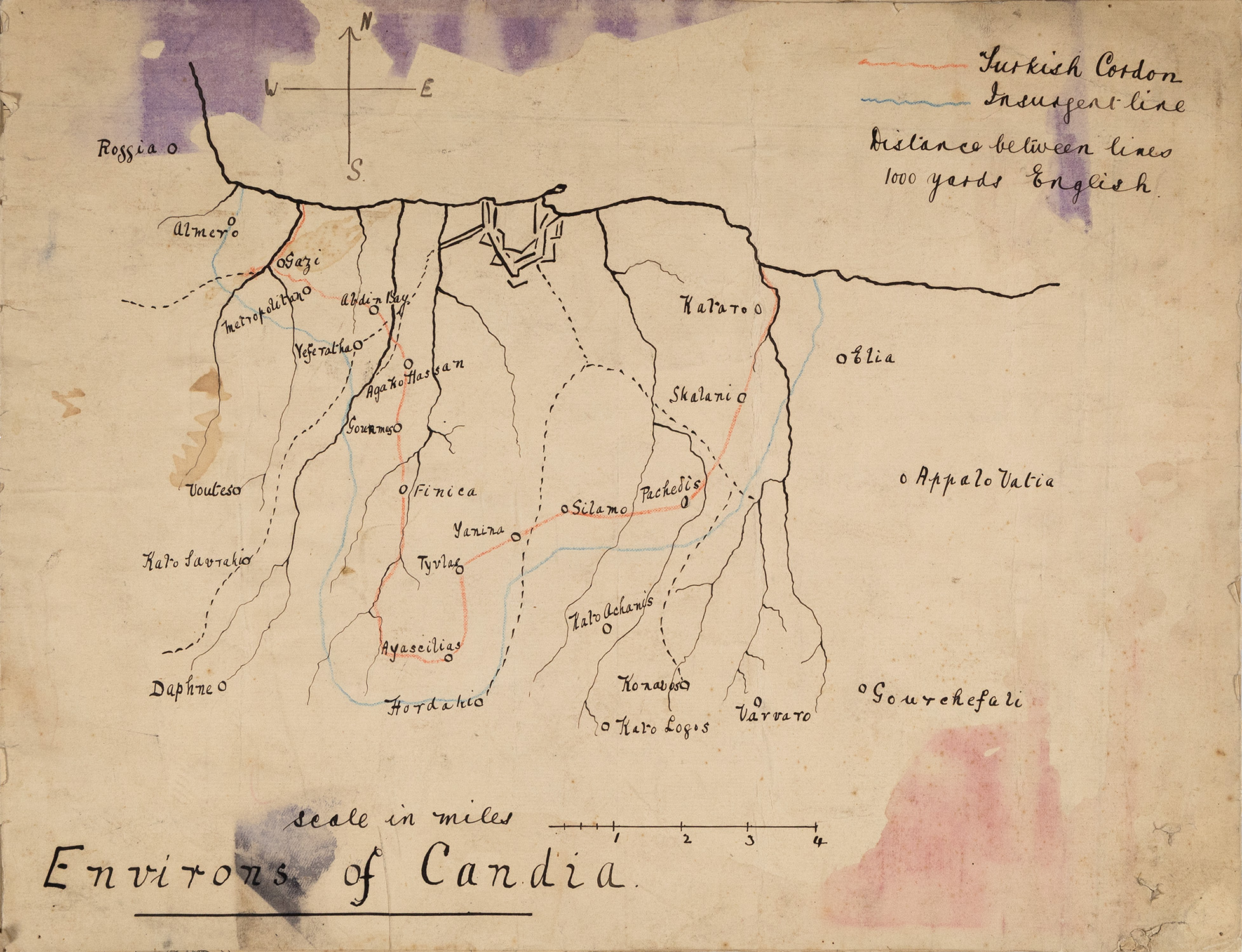 Τιμή εκτίμησης: € 300 - 400Μελάνι σε χαρτί (στα δύο και κραγιόνια), φοδραρισμένα με πανί, 320 x 400 mm. (λίγο λερωμένα). Τα δύο με τίτλο: α) «Environs of Candia» και β) «Megalo Kastron / Candia», το τρίτο προσχέδιο του πρώτου. (3) • Από την άφιξή τους στην Κρήτη τον Φεβρουάριο του 1897 μέχρι την αναχώρησή τους τον Ιούλιο του 1909, οι βρετανικές δυνάμεις συνέταξαν έναν αριθμό επίσημων και άτυπων χαρτών του Ηρακλείου, έδρας του Βρετανικού Τμήματος του νησιού και της κύριας βρετανικής βάσης.