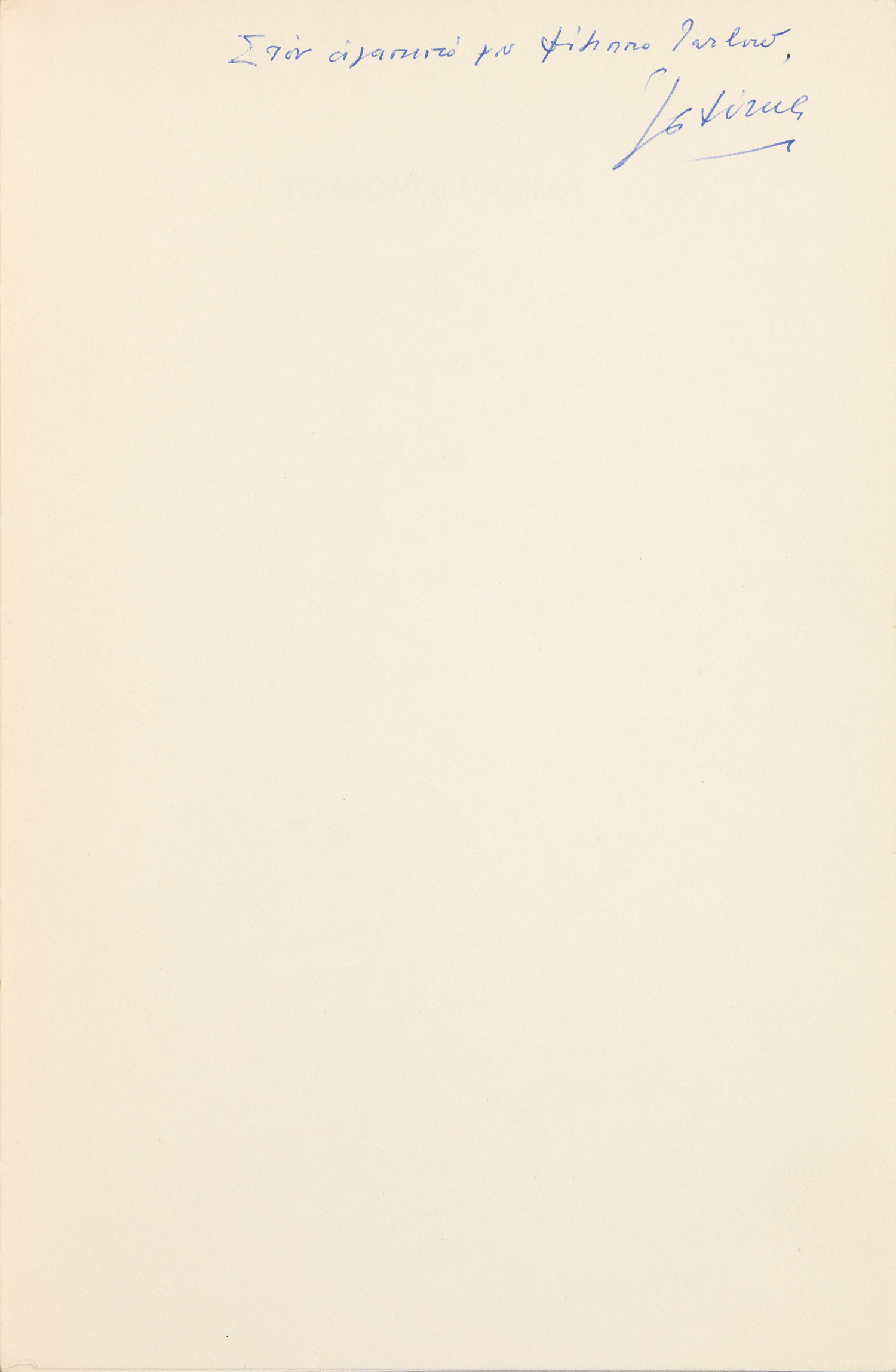 Δεύτερη έκδοση (πρώτη στην Ελλάδα), 25 σ. Προμετωπίδα (αναπαραγωγή φωτογραφίας αρχαίου κατόπτρου). Αντίτυπο με ιδιόχειρη αφιέρωση («Στόν ἀγαπητό μου Φίλιππο Tarlow, / Ἐλύτης»). Αρχικά εξώφυλλα.