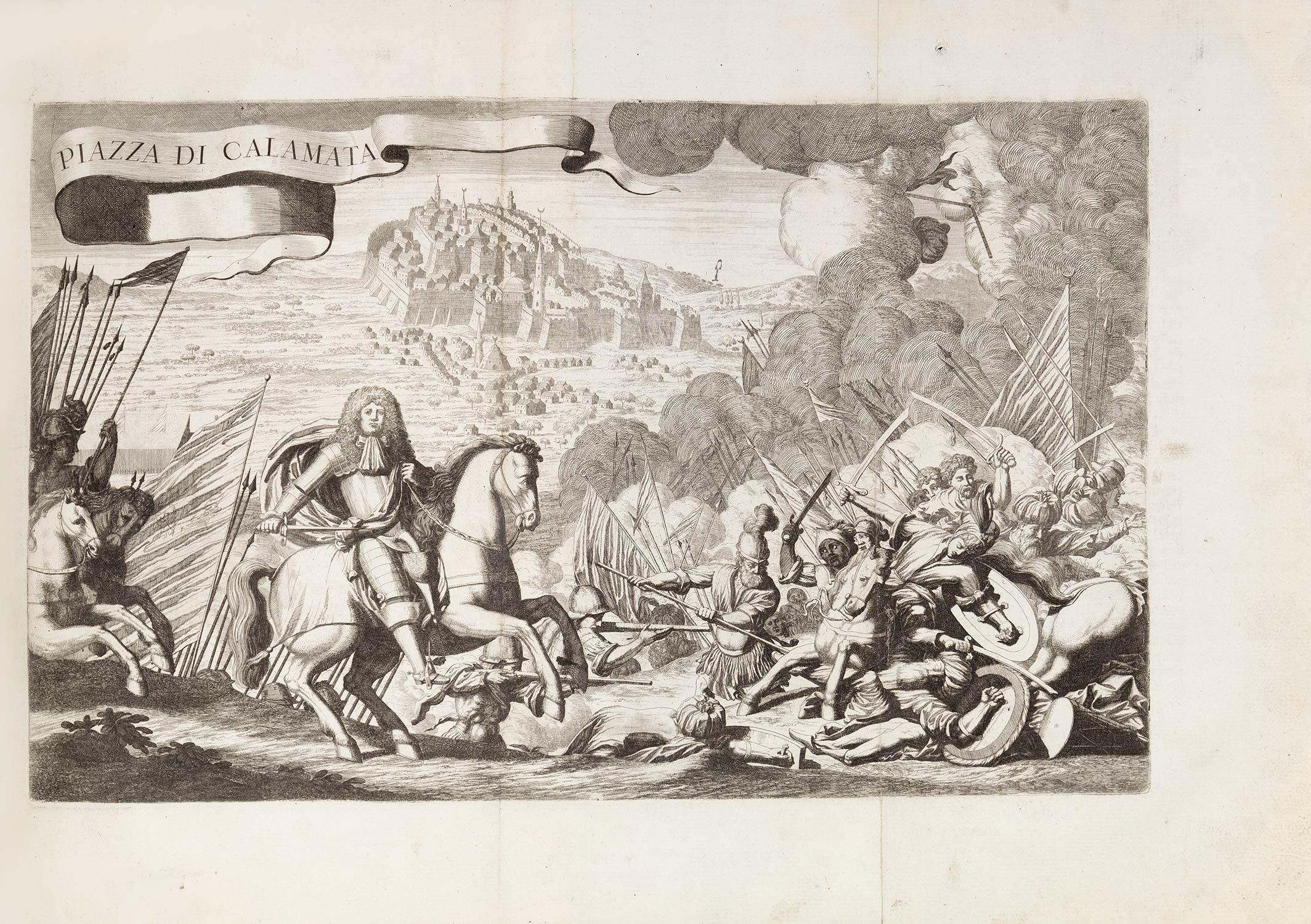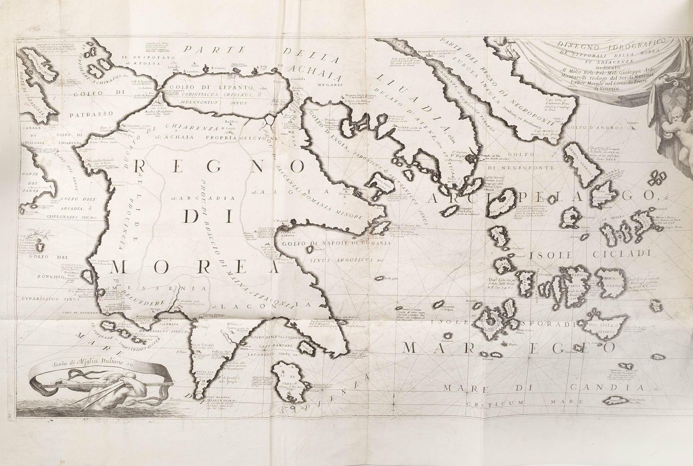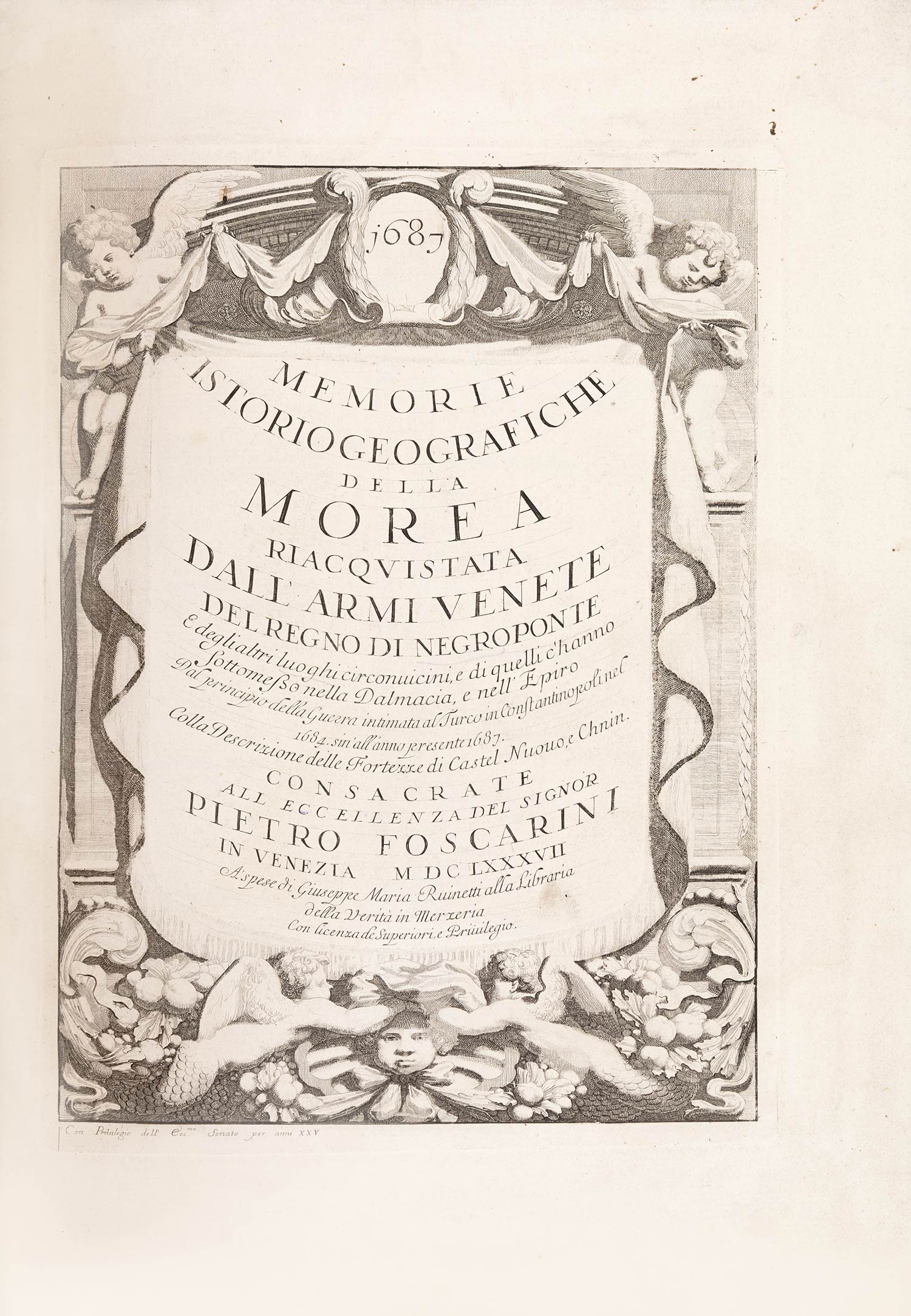 Τιμή εκτίμησης: € 4.000 - 6.000Δεύτερη έκδοση, folio (444 x 290 mm.), π2 A-D2 E3 F-R2 S3 T1 V-2H2: [65] φ. (λείπει το φύλλο με την αφιέρωση και πέντε χαλκογραφίες: «Fortezza del Zante», «Carin», «Scardona», «Castel Nuovo» και «Fortezza di Gornigrad», δεμένα με λάθος σειρά λίγα φύλλα, λεκές από νερό σε λίγα φύλλα στο τέλος). Χαλκόγραφος τίτλος, αναδιπλούμενος χαλκόγραφος χάρτης («Disegno idrografico de littorali della Morea et adiacenze», 515 x 750 mm.) και 59 χαλκογραφίες (19 χαλκογραφίες σε 18 αναδιπλούμενους πίνακες, 9 φύλλα με 2 ημισέλιδες το καθένα και 22 ημισέλιδες εντός κειμένου, περιλαμβάνονται οι χαλκογραφίες «Passava» και «Misitra ol. Sparta», οι οποίες δεν αναγράφονται στον κατάλογο των χαλκογραφιών). Εύκαμπτα χαρτόνια της εποχής της έκδοσης (λερωμένα). Blackmer 408, Atabey 288, Armao 42, Zacharakis 1043 κ.έ.