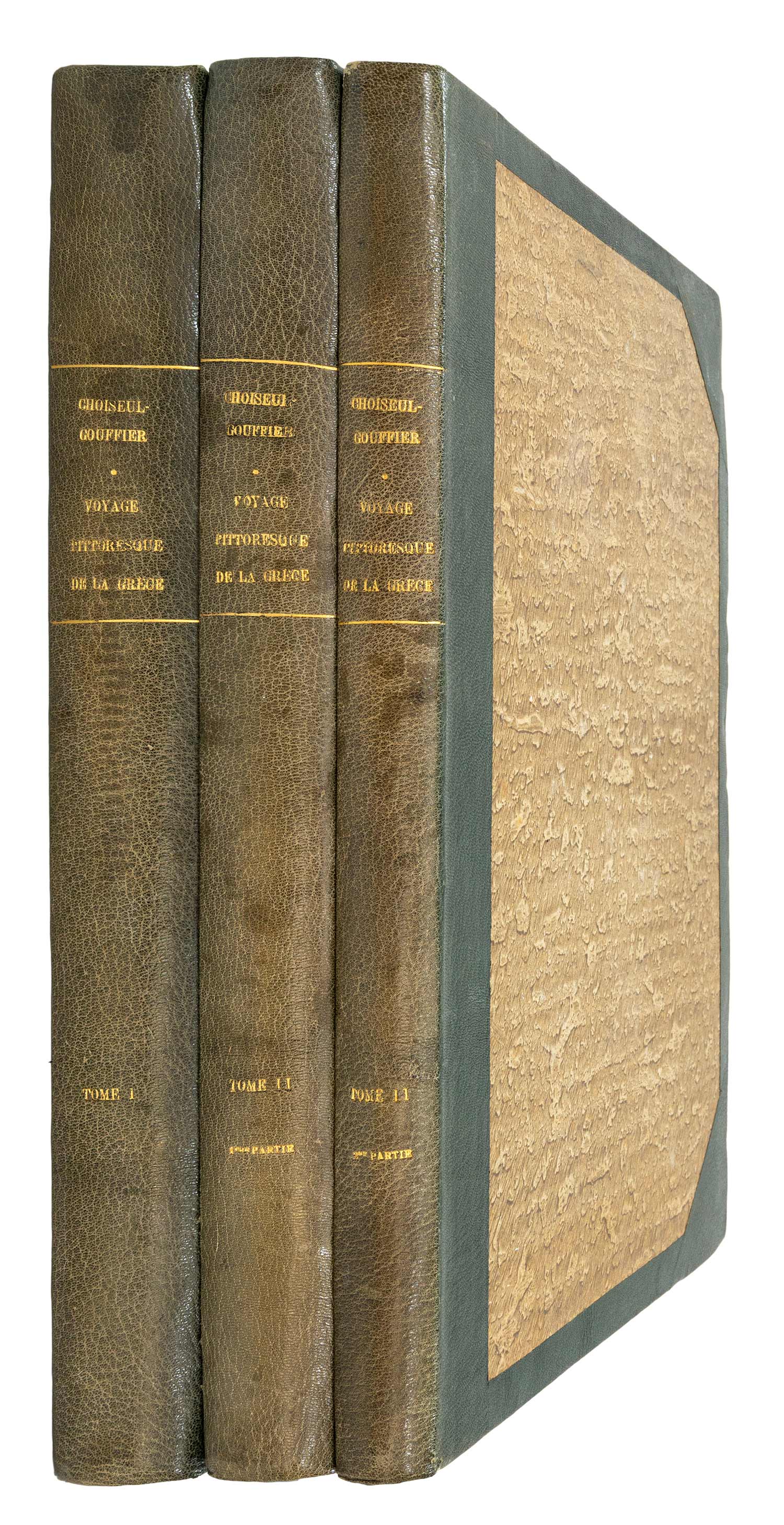 Τιμή εκτίμησης: € 4.000 - 6.000ΠΡΩΤΗ ΕΚΔΟΣΗ, τρίτη μορφή. 2 τόμοι δεμένοι σε 3 (τα δύο μέρη του Β´ δεμένα σε 2 τόμους), folio (538 x 350 mm.), xij + 204, 346 και XII + (348-518) σ. (ελαφρά οξειδωμένα αρκετά φύλλα). 3 χαλκόγραφοι τίτλοι με βινιέτες, ένα χαλκόγραφο πορτραίτο του συγγραφέα, 2 δισέλιδοι χάρτες, 285 χαλκογραφίες σε 176 φύλλα, ανάμεσά τους αρκετοί χάρτες (5 δισέλιδοι), 21 χαλκόγραφα επίτιτλα και βινιέτες και ένας δισέλιδος στοιχειοθετημένος γενεαλογικός πίνακας μεταξύ των σ. 184 και 185 του Β´ τόμου. Μεταγενέστερο πράσινο μαροκινό στη ράχη και τις γωνίες (αξάκριστο). Blackmer 342, Atabey 241, Weber, II, 571. (3) • ΩΡΑΙΑ ΒΙΒΛΙΟΔΕΣΙΑ. Ο Choiseul-Gouffier ταξίδεψε για πρώτη φορά στην Ελλάδα το 1776 ως μέλος της επιστημονικής αποστολής που διηύθυνε ο μαρκήσιος Chabert. Η επιτυχία που γνώρισε η έκδοση του πρώτου τόμου του Voyage pittoresque συνέβαλε στο να διοριστεί το 1784 πρεσβευτής στην Κωνσταντινούπολη, απ’ όπου έκανε πολλά ταξίδια στις γύρω περιοχές. Οι θαυμάσιες χαλκογραφίες αυτού του έργου έγιναν με βάση σχέδια κυρίως του J. B. Hilaire, αλλά και των L. F. Cassas, L. Fauvel και Moreau le jeune.