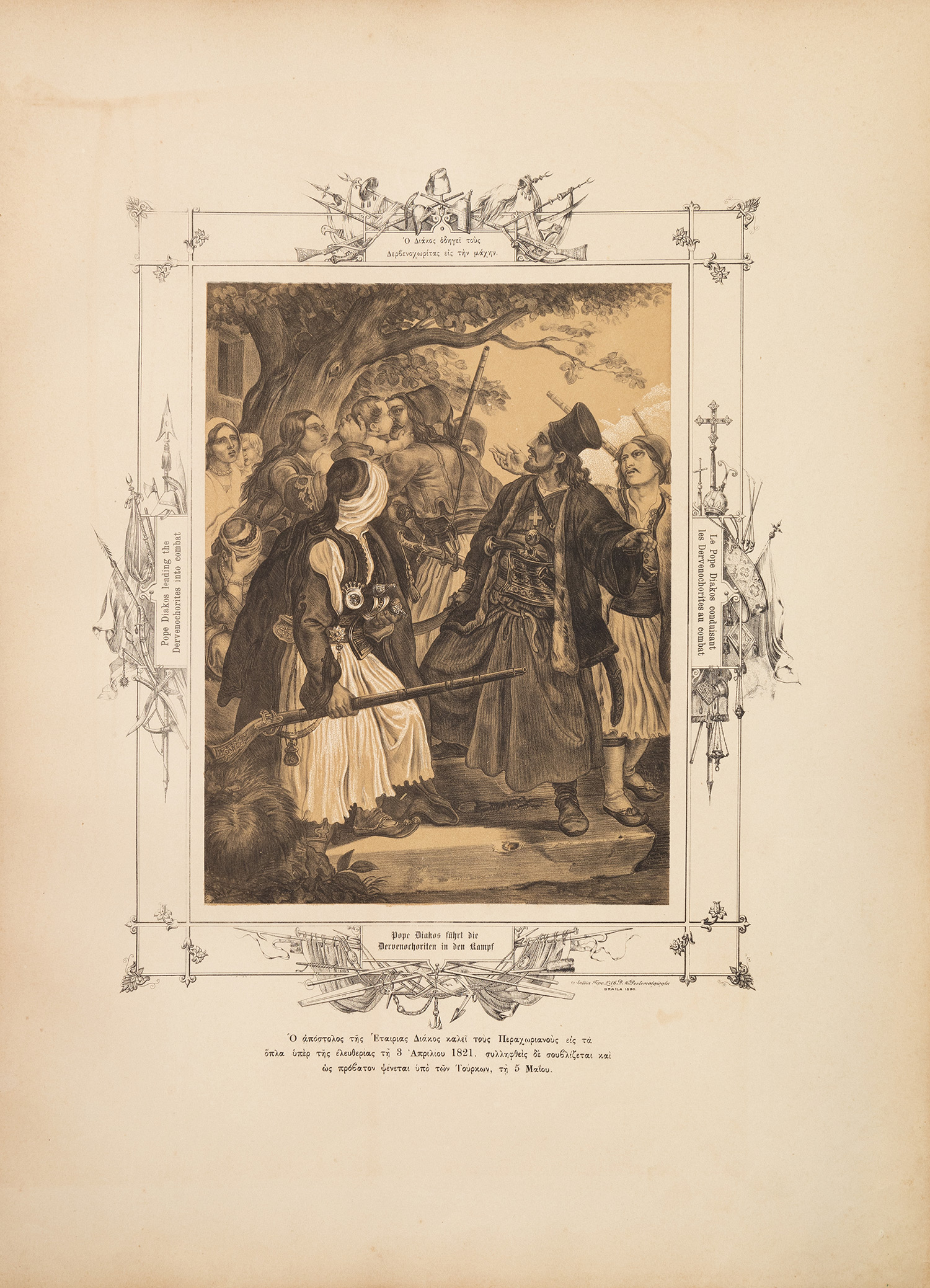Τιμή εκτίμησης: € 1.800 - 2.200folio (587 x 443 mm.) (λυμένες οι λιθογραφίες, έχουν διατηρηθεί τα στελέχη τους, κομμένα και συμπληρωμένα μικρά τμήματα από το εξωτερικό περιθώριο του φύλλου με την αφιέρωση και ακόμα οκτώ λιθογραφιών, επιδιορθωμένο σχίσιμο στο κάτω περιθώριο μιας λιθογραφίας και δύο μικρότερα στο κάτω και το εξωτερικό περιθώριο δύο άλλων αντίστοιχα, λείπει το προστατευτικό φύλλο μίας λιθογραφίας). Χρωμολιθόγραφο φύλλο με αφιέρωση του εκδότη κάτω από πορτραίτο του («Τῇ ἁπα νταχοῦ Φερέλπιδι Ἑλληνίδι Νεολαίᾳ καί τῇ σεπτῇ τῶν Φιλελλήνων χορείᾳ τόδε τό Ἐθνικόν Λεύκωμα ἐξ ἀντιγραφῆς ἐκδούς ἀνατίθησι»), φύλλο με λιθόγραφη συμβολική παράσταση σε διακοσμητικό πλαίσιο με ενσωματωμένο τον τίτλο σε 4 γλώσσες (ελληνικά, γαλλικά, γερμανικά και αγγλικά) και 39 λιθογραφίες με τίντα (όλες χρονολογημένες 1890), καθεμία σε διακοσμητικό πλαίσιο με ενσωματωμένες λεζάντες σε 4 γλώσσες καθώς και επεξηγηματικό κείμενο στα ελληνικά στο κάτω περιθώριο, χωρίς ιδιαίτερο φύλλο τίτλου (τα στοιχεία της έκδοσης από την αφιέρωση και τις λιθογραφίες). Αρχικό πανί (μικρές φθορές στο κάτω κάλυμμα, ξαναφτιαγμένο το εσωτερικό της ράχης, ακρόφυλλα επενδυμένα με μετάξι, χρυσωμένες οι ακμές, τίτλος στο πάνω κάλυμμα: «Ἡ / Παλιγγενεσία / ΤΗΣ / ΕΛΛΑΔΟΣ»).